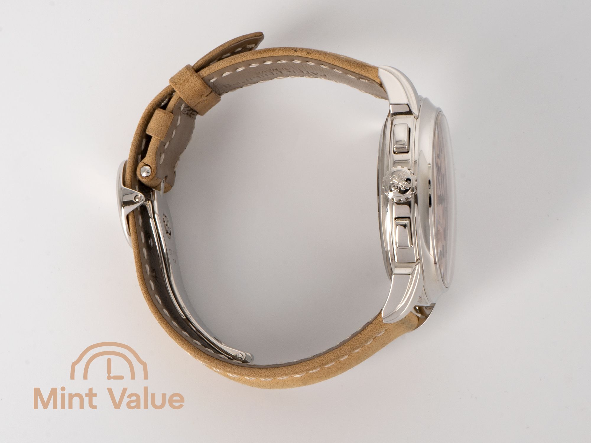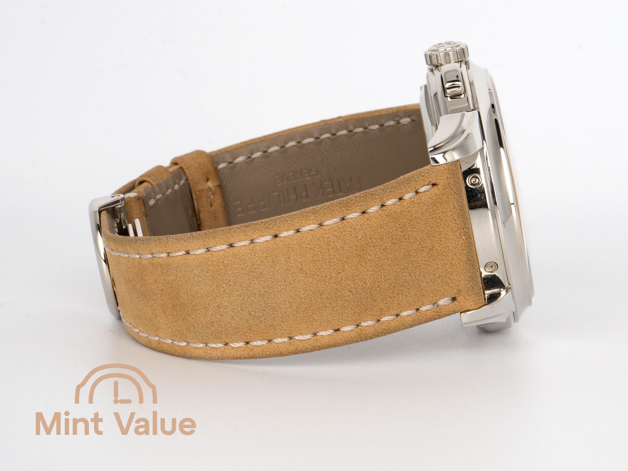 The 41 mm platinum case exemplifies substance and elegance, with polished surfaces, sculpted lugs and a discreet diamond set between the lugs at 6 o’clock — a signature mark of Patek Philippe’s precious metal pieces.