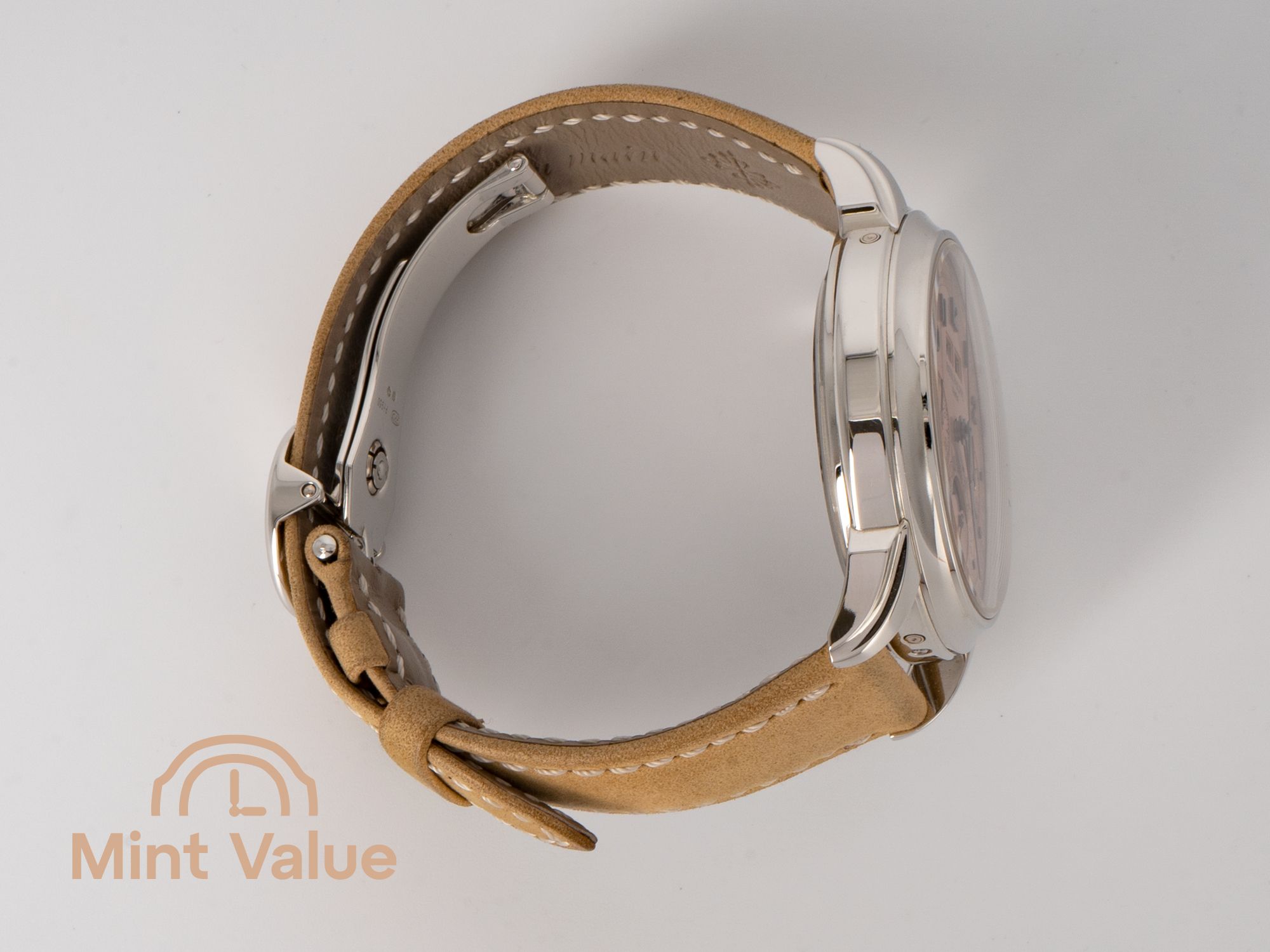 Das salmonfarbene Zifferblatt — offiziell als gold opaline bezeichnet — bietet eine raffinierte Farbvariation von warmem Rosé bis sanftem Pfirsich und schafft einen einzigartigen Charakter, der selten außerhalb maßgeschneiderter Modelle zu sehen ist. Schwarz beschichtete Feuille-Zeiger und aufgesetzte arabische Ziffern sorgen für einen klaren Kontrast und außergewöhnliche Lesbarkeit.