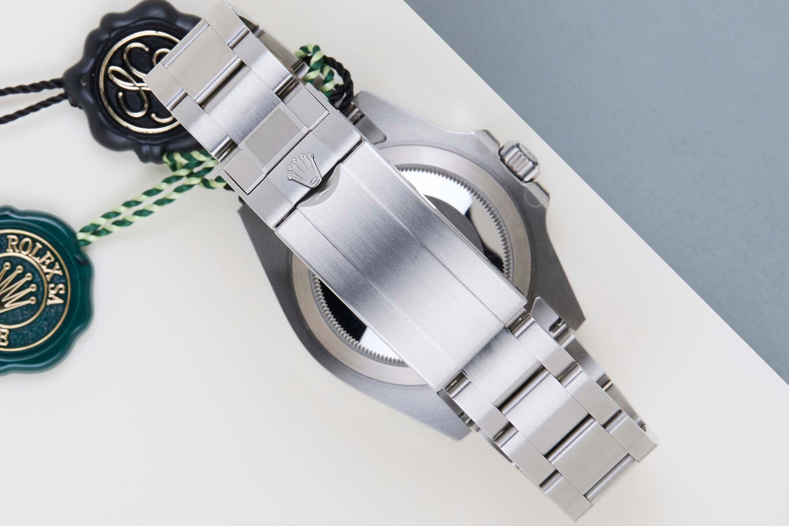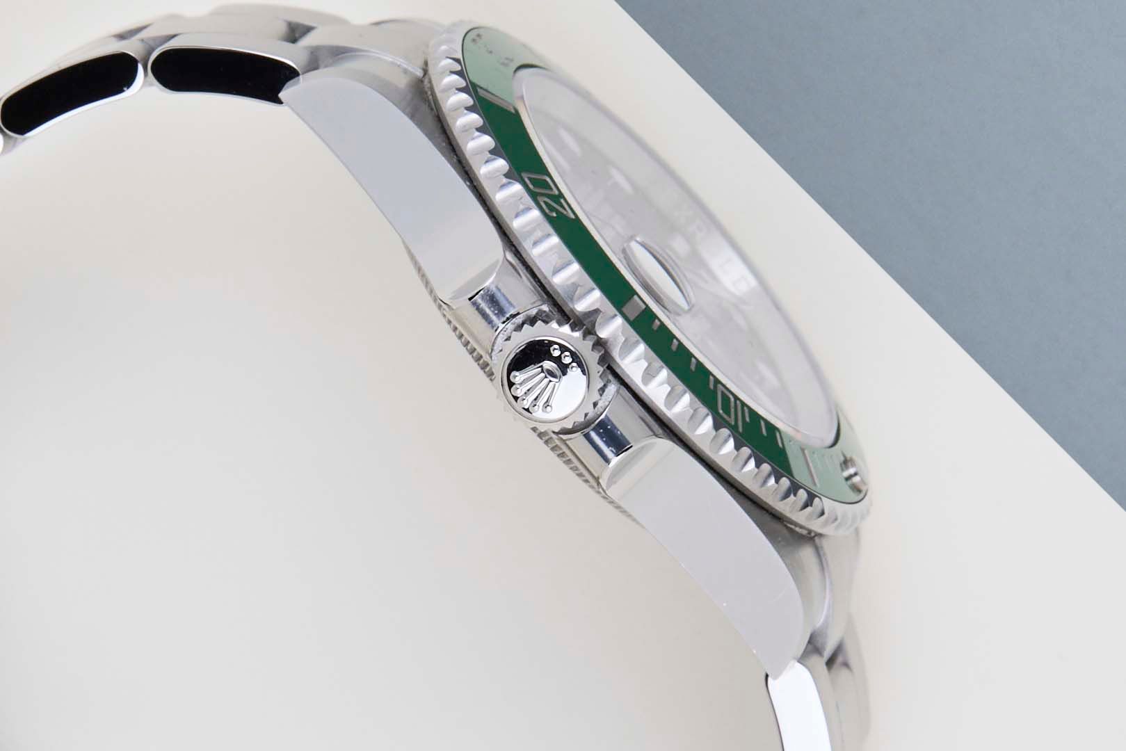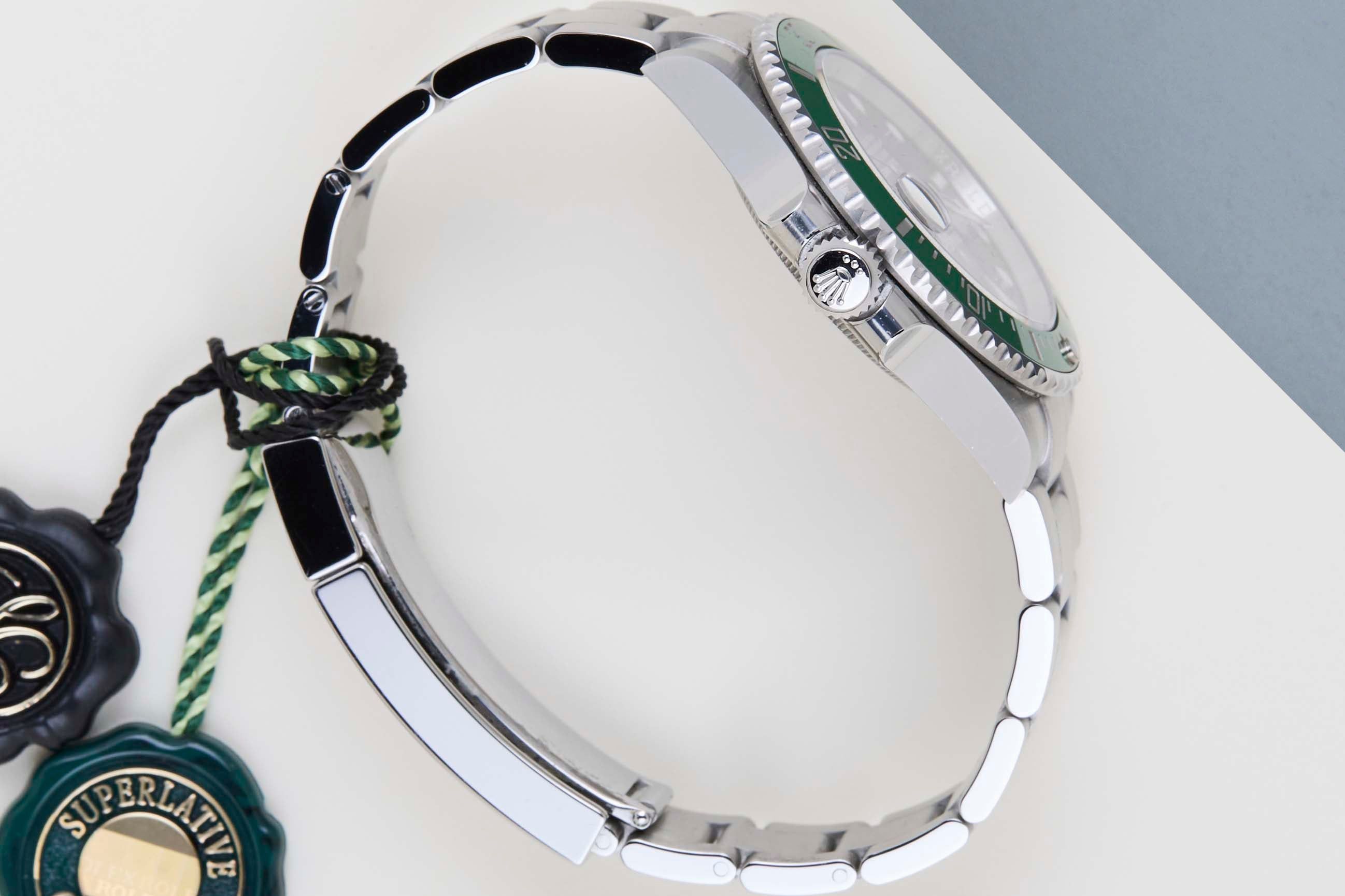 Die Uhr besteht vollständig aus Edelstahl. Rolex verwendet 904L in seinen Stahluhren, ein extrem widerstandsfähiges und hochpolierbares Superlegierung. Diese Generation der Submariner ist mit einem Chromalight-Zifferblatt ausgestattet, das durch die blaue Leuchtmasse erkennbar ist. Diese Submariner Date kommt mit einem schwarzen Zifferblatt und einer grünen Lünette, die sich aus der Referenz 126610LV, Lunette Verte, ableitet.