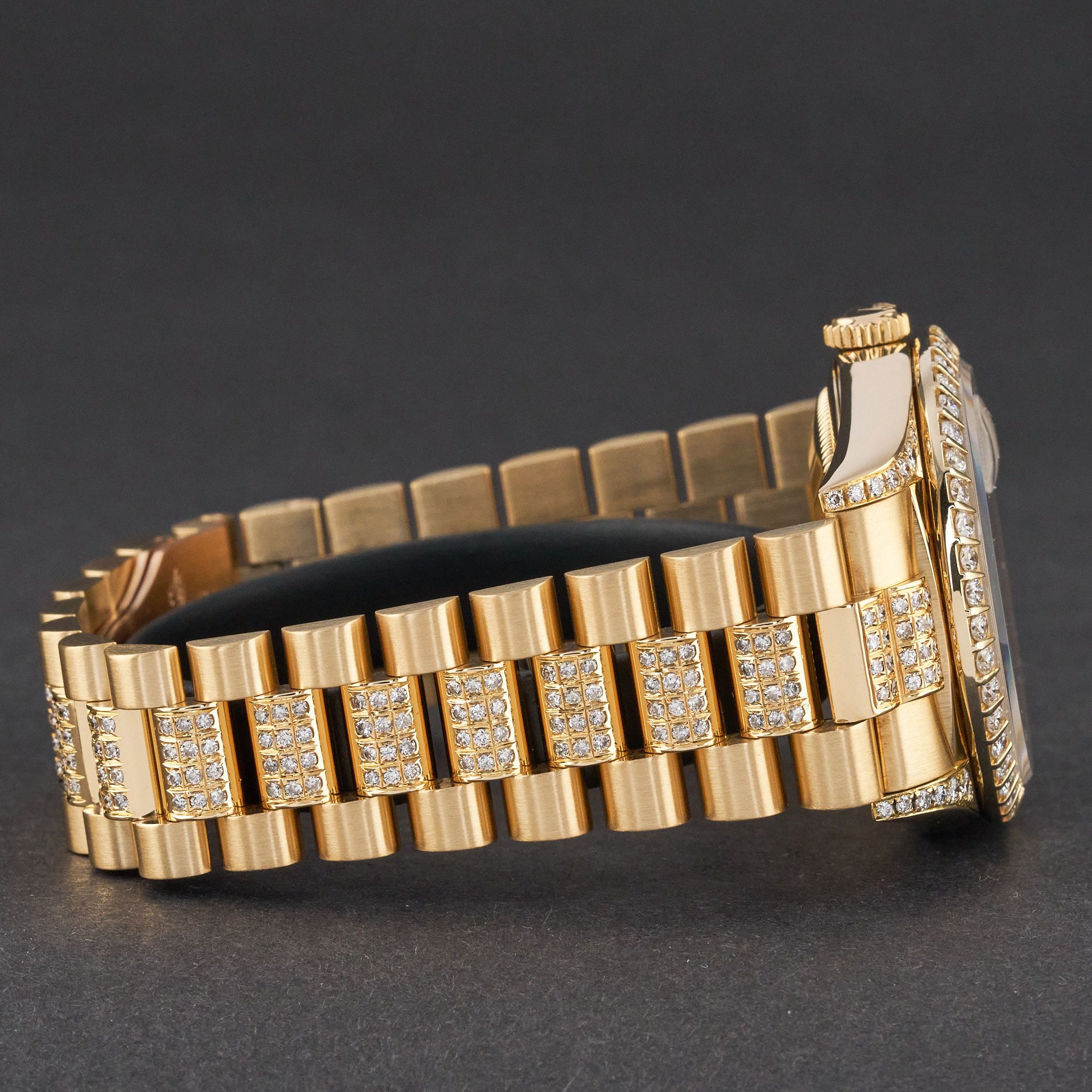 Diese Rolex Day-Date 18238 verfügt über ein Pave-Diamant-Rubin-Zifferblatt und ist aus 18 Karat Gelbgold gefertigt, mit einem Produktionsjahr von 1990. Zifferblatt, Lünette, Gehäuse und Armband sind original, haben jedoch eine nachträgliche Diamantverarbeitung.