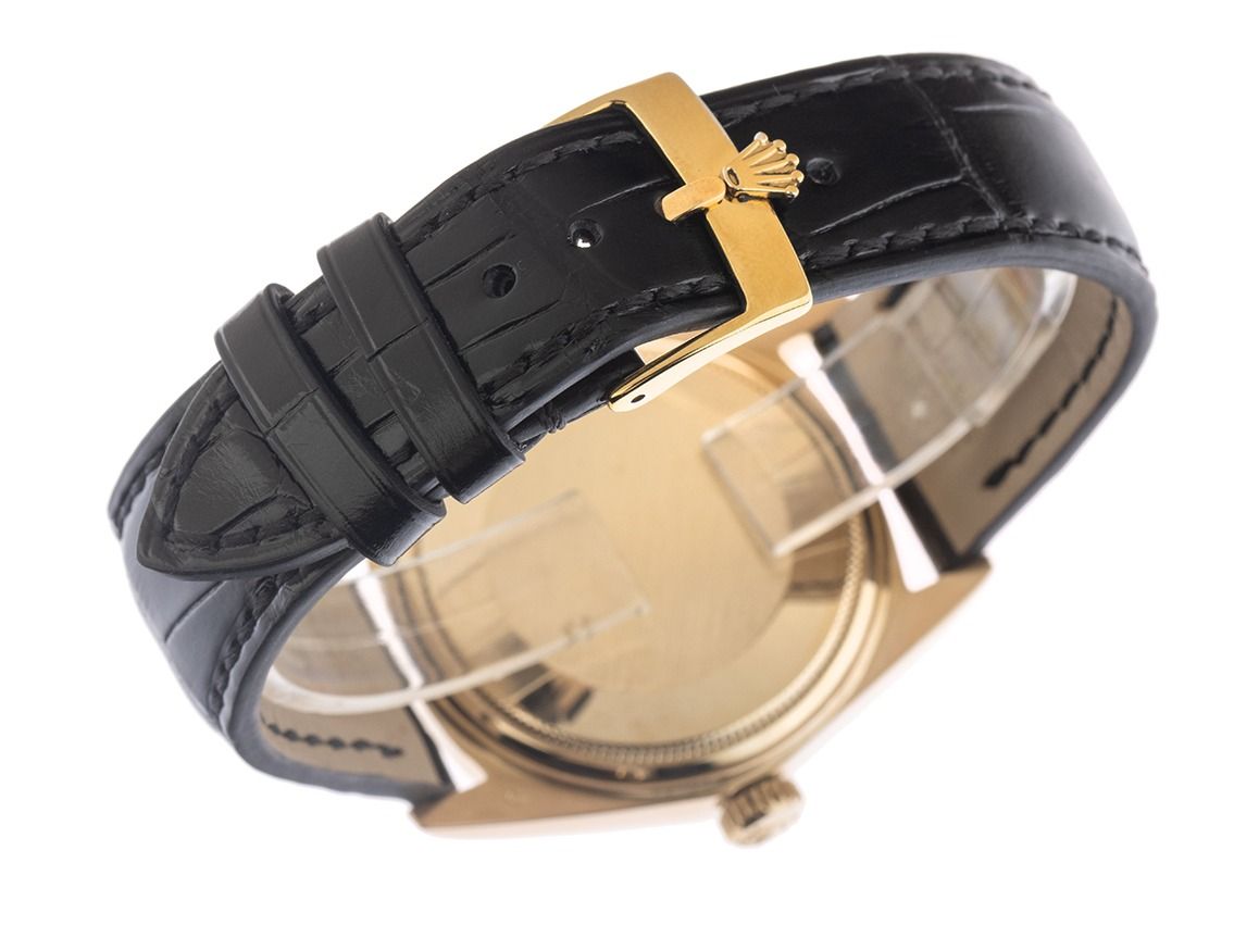 Gehäuse 18kt Gelbgold poliert und satiniert, Gehäusedurchmesser ohne Krone 36mm, Gehäusehöhe 12,6mm. Lünette 18kt Gelbgold geriffelt und poliert. Rolex Armband Krokoleder schwarz mit Ziernaht, Anstoßbreite 20mm, Rolex Stiftschließe Gelbgold vergoldet mit Hersteller-Logo. Zifferblatt Buckley Dial champagnerfarben mit schwarzen römischen Ziffern und gelbgoldenen Zeigern sowie gekröpfter Minuterie. Uhrwerk Automatik, Chronometer, Rolex Manufakturkaliber 1570 mit 26 Edelsteinen. Anzeige von Stunde, Minute und Sekunde über Zeiger aus der Mitte, Datumsanzeige unter Glaslupe bei 3 Uhr mit open 6/9 (offene 6 und 9 in der Datumsanzeige), Wochentagsanzeige in Englisch bei 12 Uhr. Plexiglas gewölbt. Krone verschraubbar mit Hersteller-Logo. Boden 18kt Gelbgold verschraubt. Gewicht der Uhr inklusive Armband 57g. Referenznummer: 1803, Gehäusenummer: 3456XXX, Baujahr: 1972, ID: P2361140000126H-15900, Artikelnummer: 10000084428. Mit Gangkontrolle und kompletter äußerlicher Aufarbeitung von Januar 2026. Original Rolex Box mit Umkarton und Beschreibung, Ledermäppchen, Rolex Block, Übersetzungsheft und Watchregister Auszug von Januar 2026, The Watch Register Zertifikat / ohne Eintrag (Internationale Datenbank für verlorene oder gestohlene Uhren). Superschnäppchen, Kapitalanlage mit Wertsteigerungspotential, sehr seltenes Sammlerstück. Sehr guter Zustand. Lieferzeit sofort.