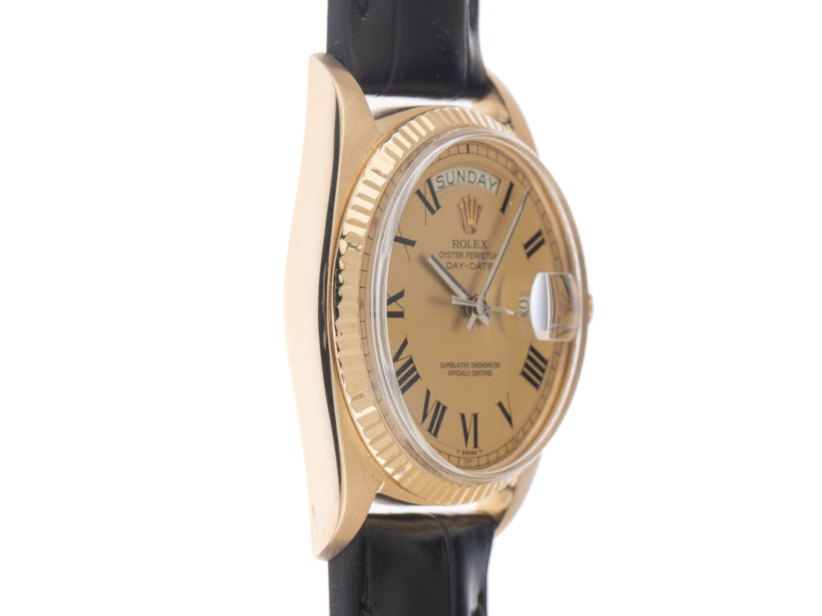 Rolex Day-Date 18kt Gelbgold Automatik Armband KrokolederGehäuse 18kt Gelbgold poliert und satiniert, Gehäusedurchmesser ohne Krone 36mm, Gehäusehöhe 12,6mm. Lünette 18kt Gelbgold geriffelt und poliert. Rolex Armband Krokoleder schwarz mit Ziernaht, Anstoßbreite 20mm, Rolex Stiftschließe Gelbgold vergoldet mit Hersteller-Logo. Zifferblatt Buckley Dial champagnerfarben mit schwarzen römischen Ziffern und weißgoldenen Zeigern sowie gekröpfter Minuterie. Uhrwerk Automatik, Chronometer, Rolex Manufakturkaliber 1570 mit 26 Edelsteinen. Anzeige von Stunde, Minute und Sekunde über Zeiger aus der Mitte, Datumsanzeige unter Glaslupe bei 3 Uhr mit open 6/9 (offene 6 und 9 in der Datumsanzeige), Wochentagsanzeige in Englisch bei 12 Uhr. Plexiglas gewölbt. Krone verschraubbar mit Hersteller-Logo. Boden 18kt Gelbgold verschraubt. Gewicht der Uhr inklusive Armband 57g. Referenznummer: 1803, Gehäusenummer: 3456XXX, Baujahr: 1972, ID: P2361140000126H-15900, Artikelnummer: 10000084428. Mit Gangkontrolle und kompletter äußerlicher Aufarbeitung von Januar 2026. Original Rolex Box mit Umkarton und Beschreibung, Ledermäppchen, Rolex Block, Übersetzungsheft und Watchregister Auszug von Januar 2026, The Watch Register Zertifikat / ohne Eintrag (Internationale Datenbank für verlorene oder gestohlene Uhren). Superschnäppchen, Kapitalanlage mit Wertsteigerungspotential, sehr seltenes Sammlerstück. Sehr guter Zustand. Lieferzeit sofort.