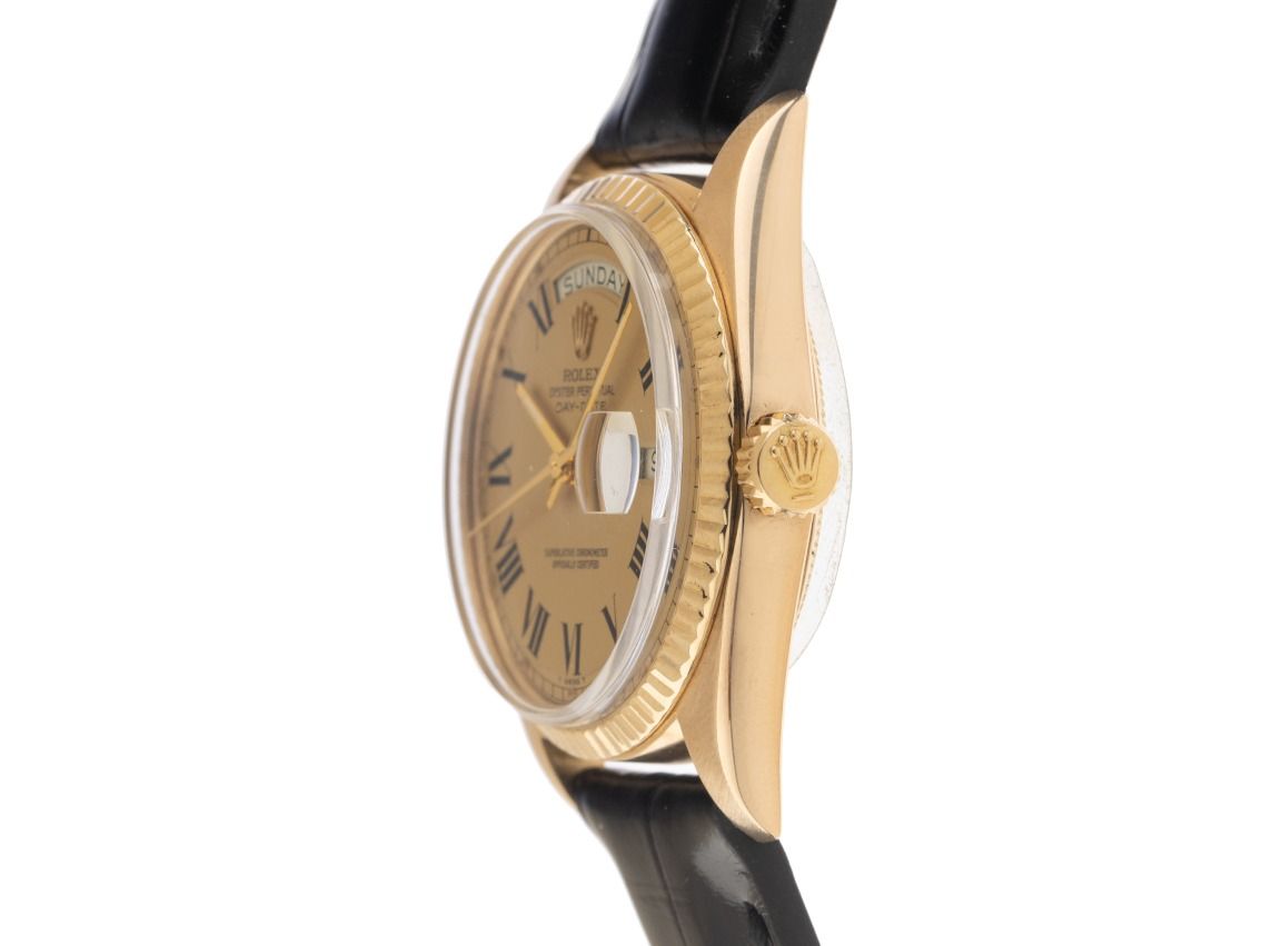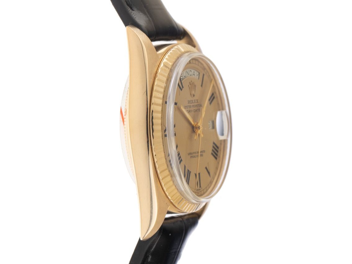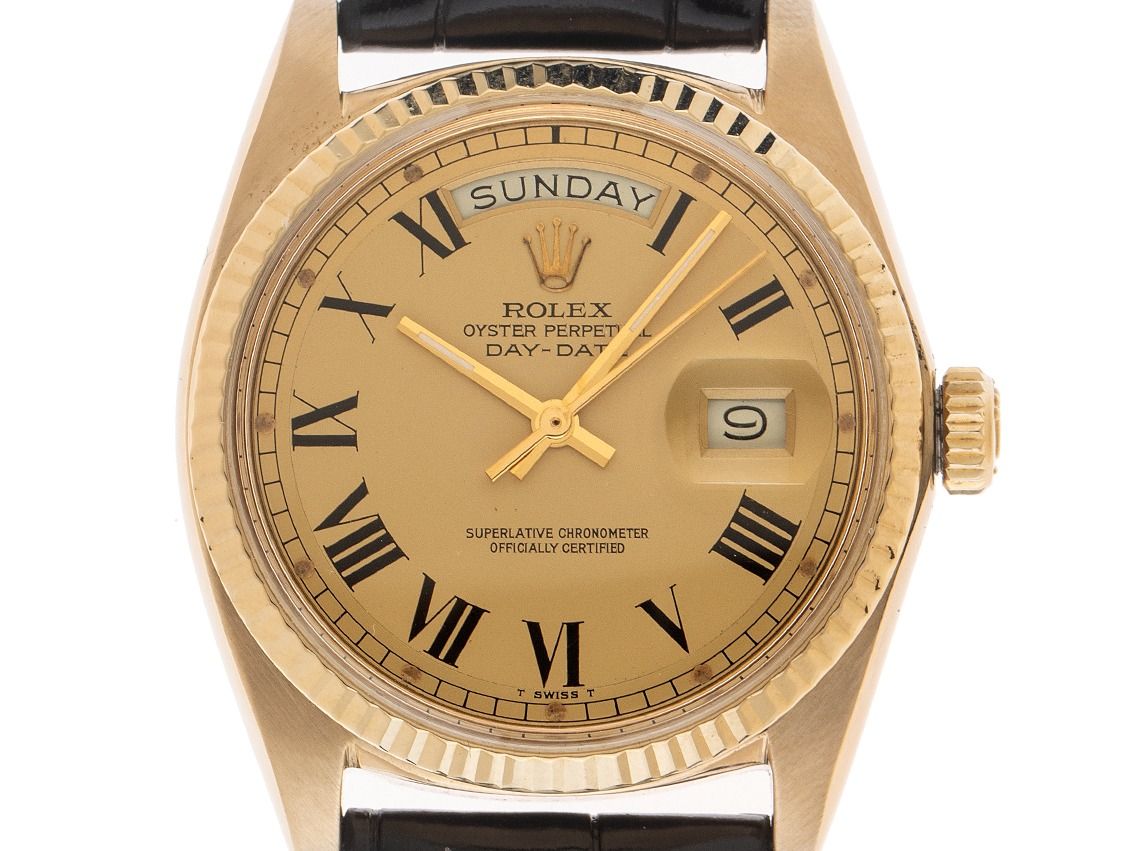 Rolex Day-Date 18kt Gelbgold Automatik Armband KrokolederGehäuse 18kt Gelbgold poliert und satiniert, Gehäusedurchmesser ohne Krone 36mm, Gehäusehöhe 12,6mm. Lünette 18kt Gelbgold geriffelt und poliert. Rolex Armband Krokoleder schwarz mit Ziernaht, Anstoßbreite 20mm, Rolex Stiftschließe Gelbgold vergoldet mit Hersteller-Logo. Zifferblatt Buckley Dial champagnerfarben mit schwarzen römischen Ziffern und gelbgoldenen Zeigern sowie gekröpfter Minuterie. Uhrwerk Automatik, Chronometer, Rolex Manufakturkaliber 1570 mit 26 Edelsteinen. Anzeige von Stunde, Minute und Sekunde über Zeiger aus der Mitte, Datumsanzeige unter Glaslupe bei 3 Uhr mit open 6/9 (offene 6 und 9 in der Datumsanzeige), Wochentagsanzeige in Englisch bei 12 Uhr. Plexiglas gewölbt. Krone verschraubbar mit Hersteller-Logo. Boden 18kt Gelbgold verschraubt. Gewicht der Uhr inklusive Armband 57g. Referenznummer: 1803, Gehäusenummer: 3456XXX, Baujahr: 1972, ID: P2361140000126H-15900, Artikelnummer: 10000084428. Mit Gangkontrolle und kompletter äußerlicher Aufarbeitung von Januar 2026. Original Rolex Box mit Umkarton und Beschreibung, Ledermäppchen, Rolex Block, Übersetzungsheft und Watchregister Auszug von Januar 2026, The Watch Register Zertifikat / ohne Eintrag (Internationale Datenbank für verlorene oder gestohlene Uhren). Superschnäppchen, Kapitalanlage mit Wertsteigerungspotential, sehr seltenes Sammlerstück. Sehr guter Zustand. Lieferzeit sofort.