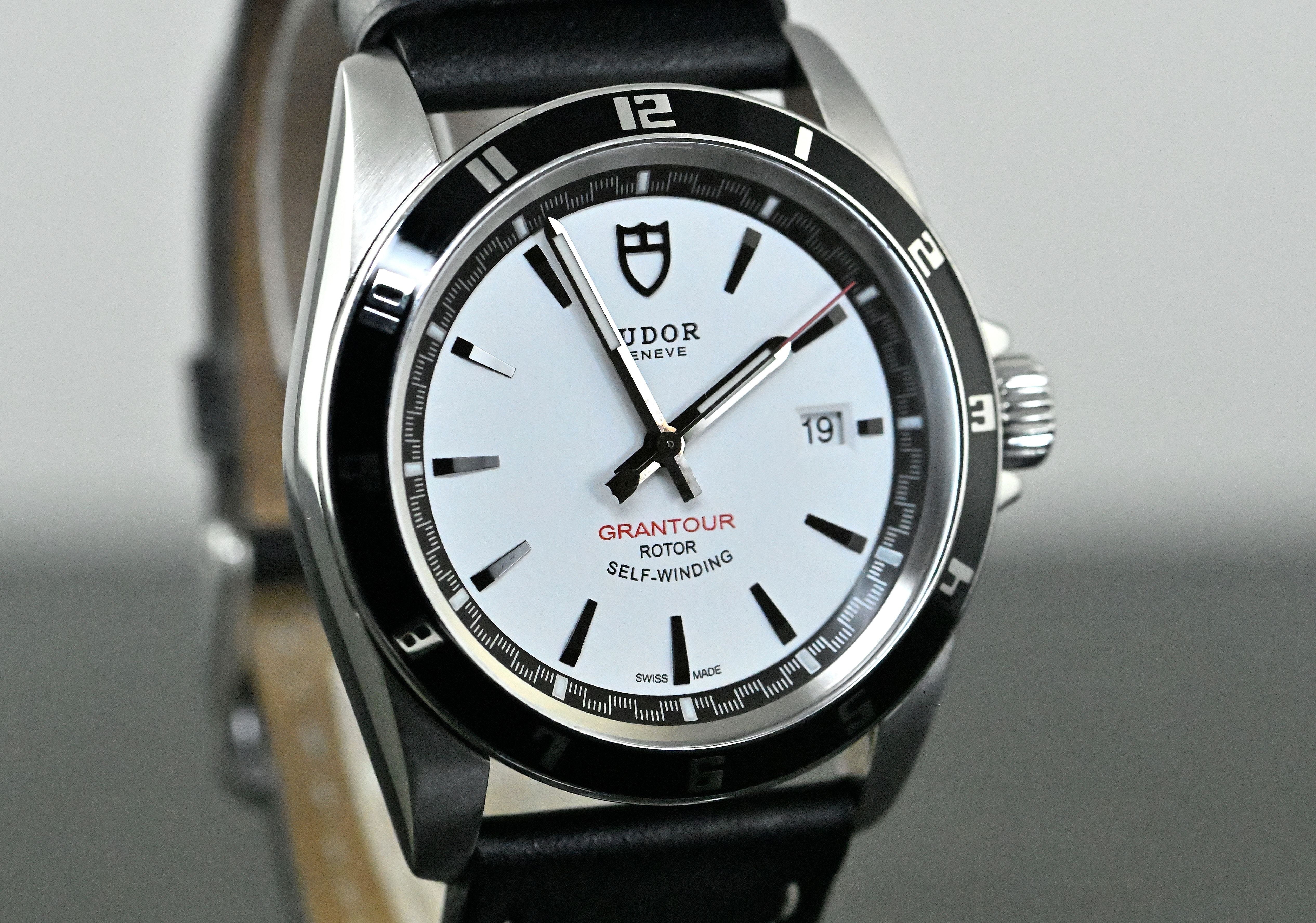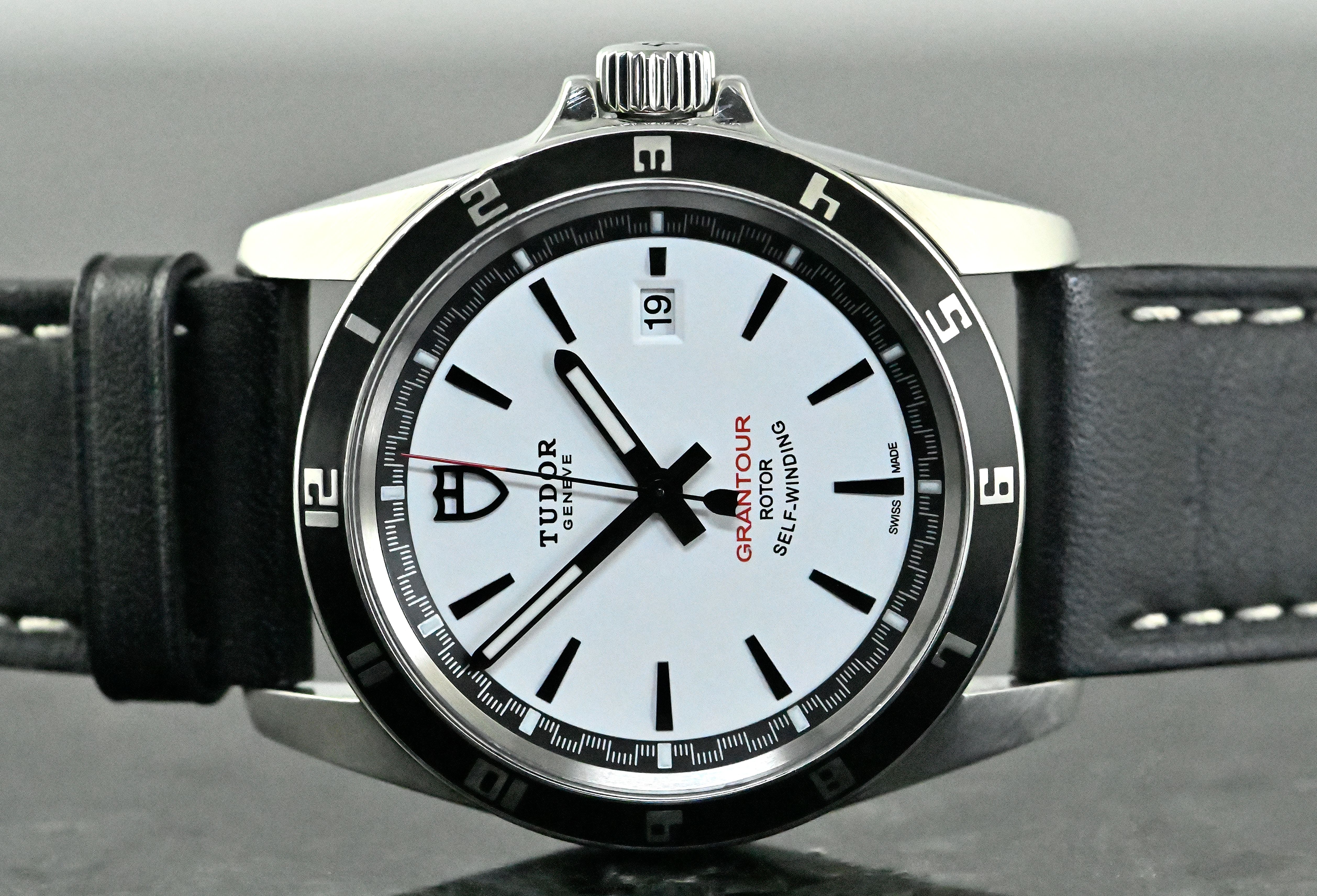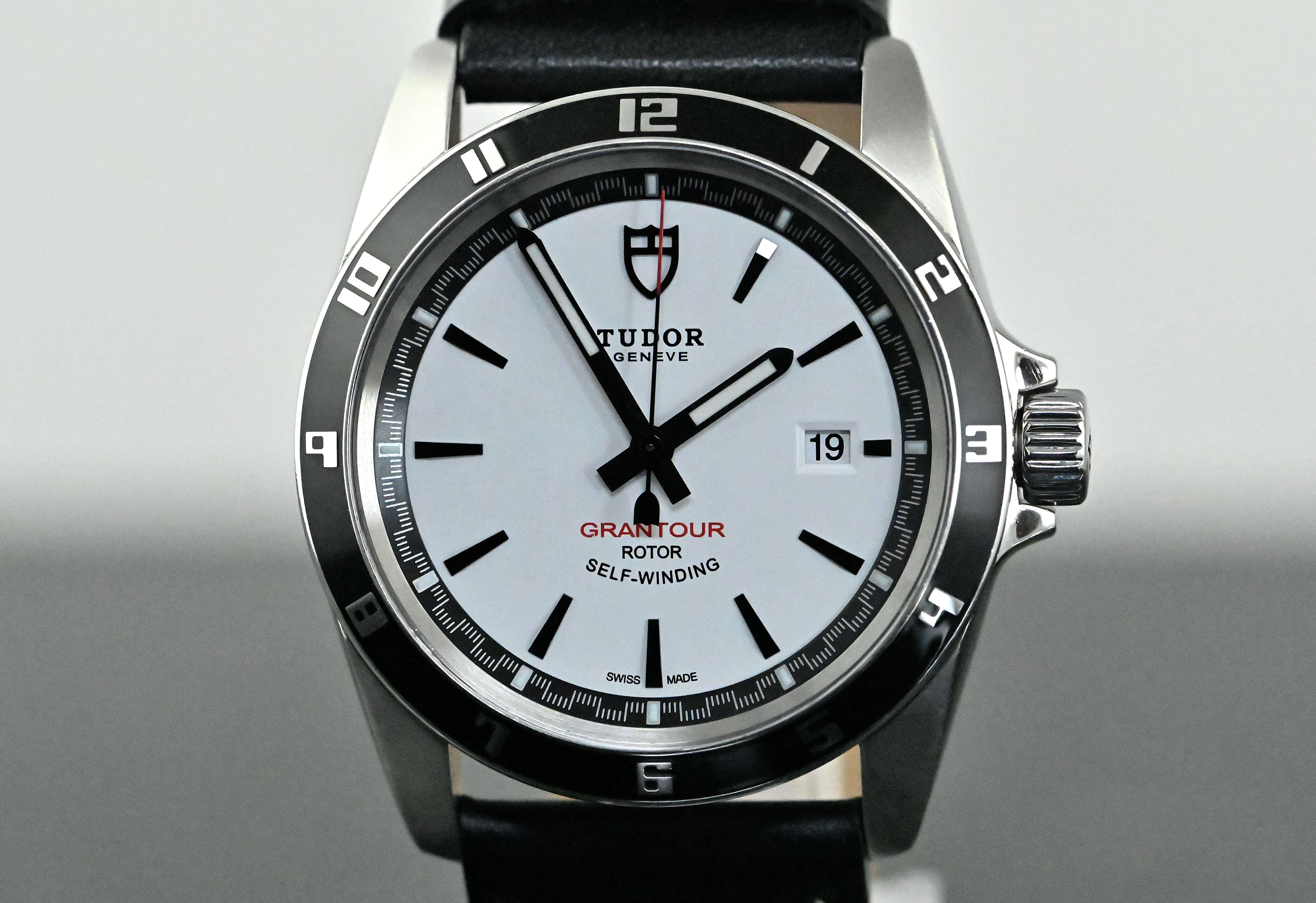 Tudor Grantour Date “white dial” | reference 20500N | in steel | Tudor automatic caliber 2824 with date and central seconds | good condition | neutral leather strap with a pin buckle | the original Tudor steel bracelet and a rubber strap with a original Tudor steel folding clasp are also included | full set with the original box and outer carton - warranty certificate (sold on June 1. 2012) - booklets / operating instructions - Tudor steel bracelet - rubber strap with Tudor steel folding clasp.