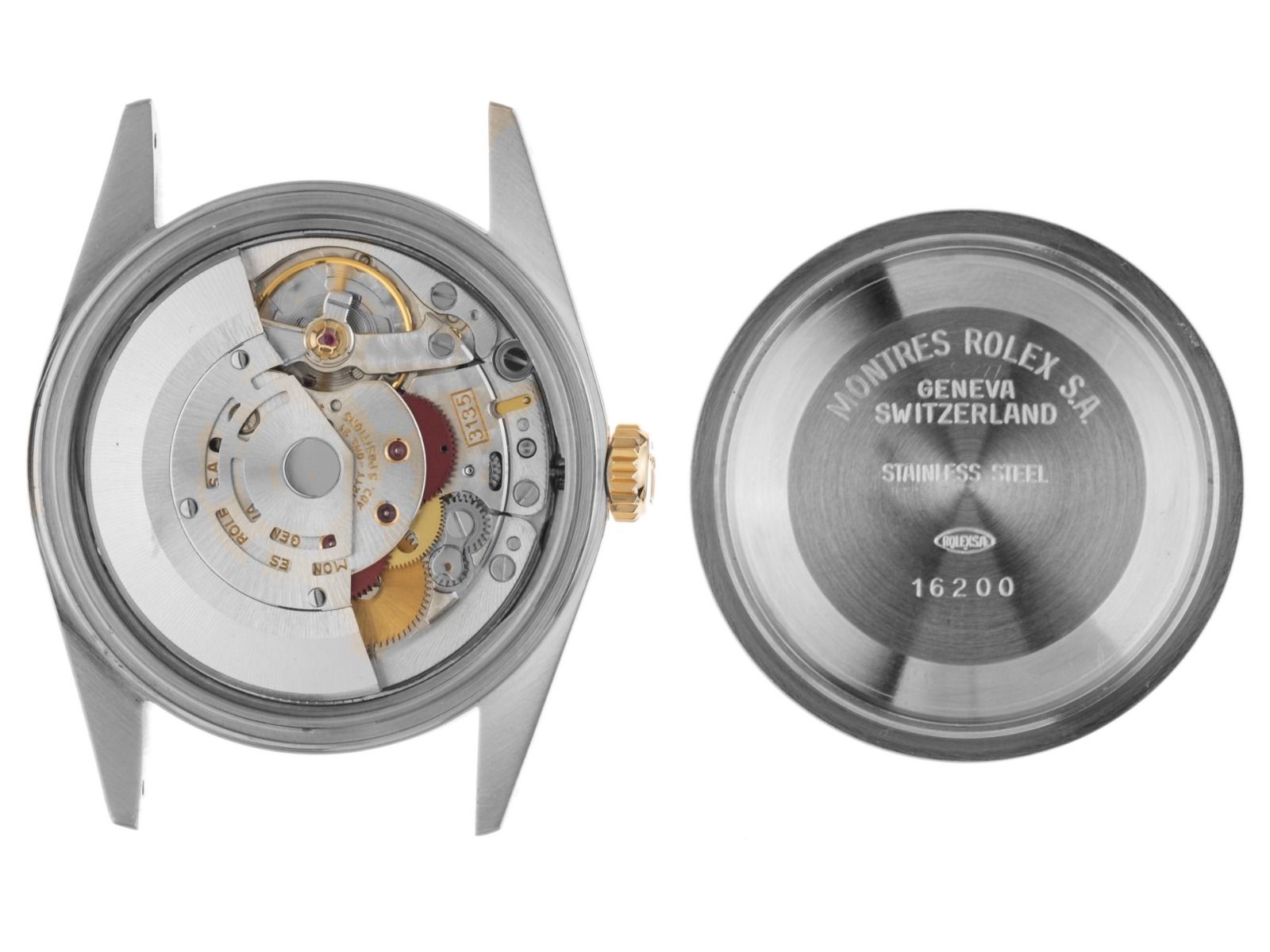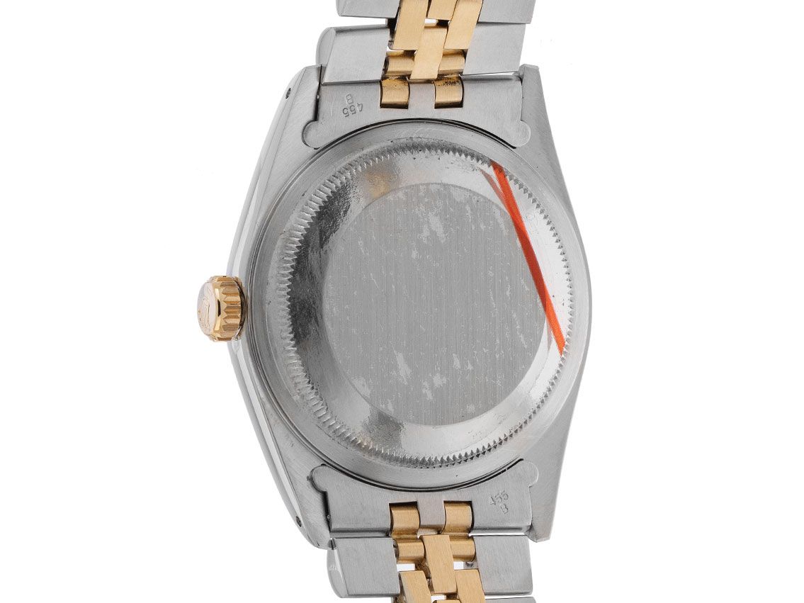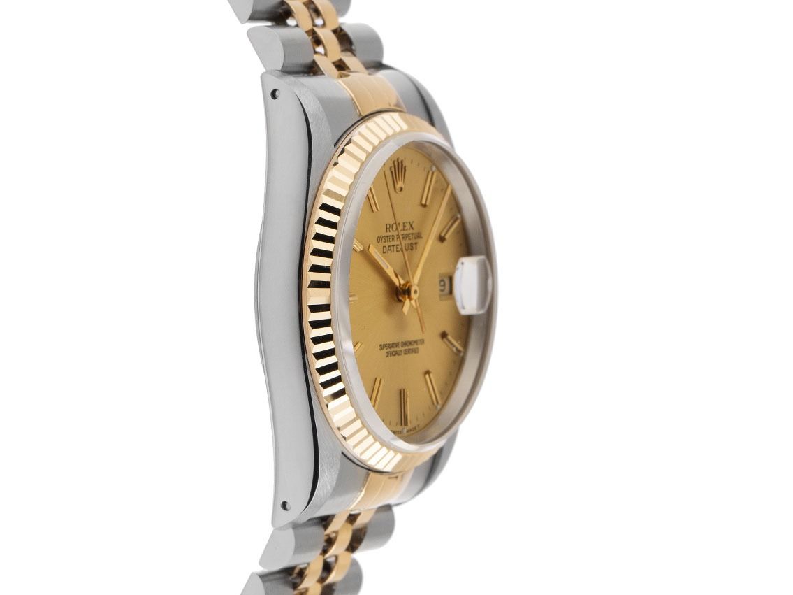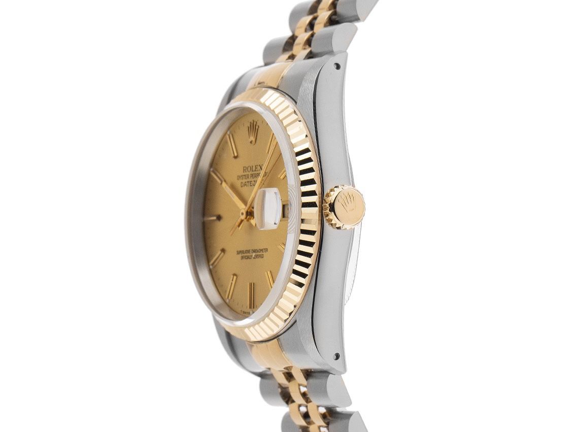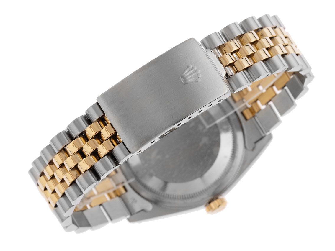 Gehäuse aus poliertem und satiniertem Edelstahl, Gehäusedurchmesser ohne Krone 36mm, Gehäusehöhe 11,9mm. Lünette aus 18kt Gelbgold, geriffelt und poliert. Armband Jubilé aus poliertem und satiniertem Edelstahl / 18kt Gelbgold, Faltschließe aus Edelstahl mit Hersteller-Logo. Zifferblatt in champagnerfarben mit aufgesetzten gelbgoldenen Indexen und gelbgoldenen Zeigern, "T SWISS MADE T" Aufschrift bei 6 Uhr. Uhrwerk Automatik, Chronometer mit Zeugnis, Rolex Manufakturkaliber 3135 mit 31 Edelsteinen. Anzeige von Stunde, Minute und Sekunde über Zeiger aus der Mitte mit Sekundenstopp zur sekundengenauen Einstellung der Uhrzeit, Datumsanzeige mit Schnellverstellung unter Glaslupe bei 3 Uhr. Saphirglas kratzfest. Krone verschraubbar mit Hersteller-Logo. Boden aus Edelstahl, verschraubt. Gewicht der Uhr inklusive Armband 101g, Länge des Armbandes inklusive Gehäuse 180mm. Referenznummer: 16233, Gehäusenummer: X352XXX, Baujahr: 1991, ID: P2413133720126H-10500, Artikelnummer: 10000084564. Mit Gangkontrolle und kompletter äußerlicher Aufarbeitung von Januar 2026. Original Rolex Box mit Umkarton und Garantie-Papieren von Januar 1993, LC 400 / Hong Kong sowie Beschreibung, Ledermäppchen, Übersetzungsheft, Rolex Chronometer-Siegel und Watchregister-Auszug von Januar 2026, The Watch Register Zertifikat / ohne Eintrag (Internationale Datenbank für verlorene oder gestohlene Uhren), inkl. Rolex Service Card von Mai 2024, Full Set. Kapitalanlage mit Wertsteigerungspotential, extrem seltenes Sammlerstück, fast nicht getragen. Sehr guter Zustand. Lieferzeit sofort.