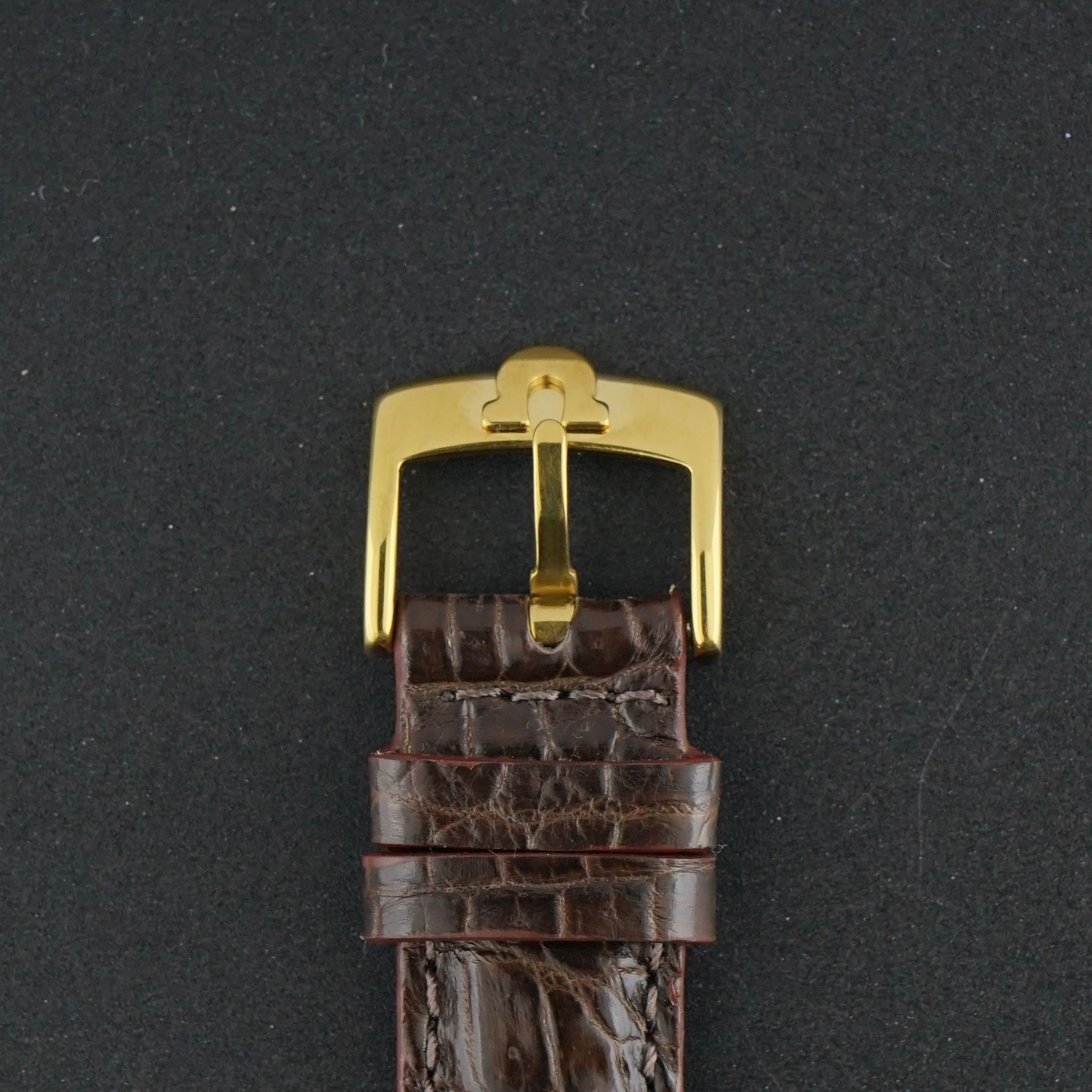 Es hat eine goldfarbene Zifferblatt mit vertikalem Streifenmuster, das einen raffinierten und klassischen Look bietet. Die Uhr ist mit einem braunen Oberlederarmband mit Krokodilmotiv ausgestattet, dem einzigen nicht-originalen Bestandteil. Alle anderen Teile sind original und in ausgezeichnetem Zustand, was sie zu einer idealen Dresswatch oder Sammlerstück macht.