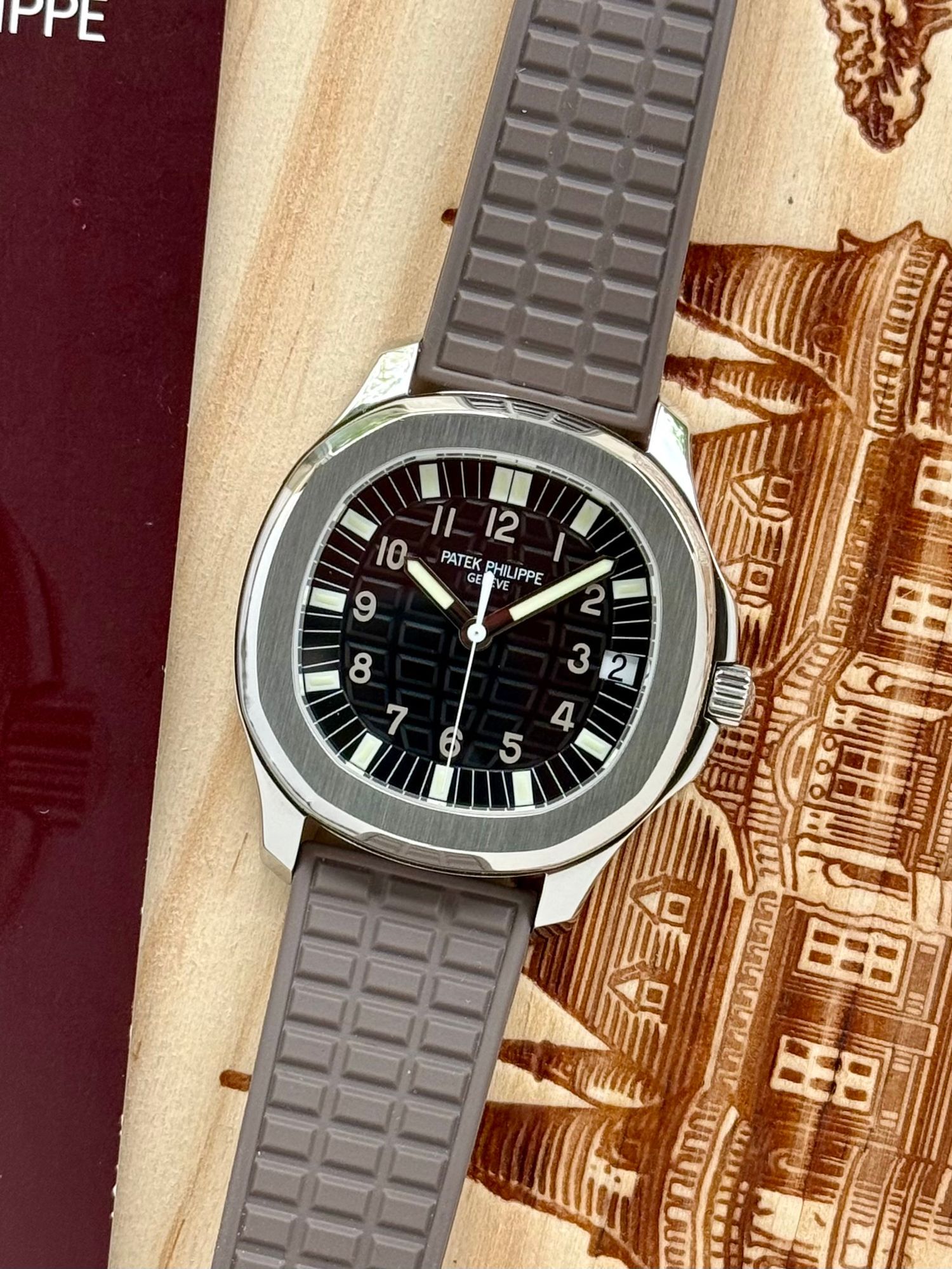 Wenn du dir das Zifferblatt genau ansiehst, siehst du das semi-glänzende Zifferblatt mit dem ikonischen Aquanaut-Muster, das perfekt mit dem Profil des Gummistraps integriert ist. Das alles vervollständigt den sportlichen, luxuriösen und vintage Look dieser Patek Philippe. Auf dem Zifferblatt und den Zeigern finden wir Luminova, was dir die Möglichkeit gibt, die Zeit im Dunkeln abzulesen.
