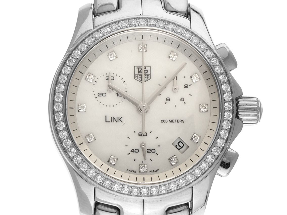 Tag Heuer Link Lady Stahl Perlmutt Diamanten Quarz Armband StahlGehäuse Edelstahl poliert, Gehäusedurchmesser ohne Krone 33mm, Gehäusehöhe 11,0mm. Lünette Edelstahl mit Diamanten besetzt, zusammen ca. 0,91ct TW / VSI (feines Weiß mit sehr kleinen Einschlüssen). Armband Edelstahl poliert , Sicherheitsfaltschließe Edelstahl mit Hersteller-Logo. Uhrwerk quarzgesteuert. Zifferblatt Perlmutt hell mit 12 aufgesetzten Diamant Indexen und Edelstahl Zeigern. Anzeige von Stunde und Minute über Zeiger aus der Mitte, kleine Sekunde mit Sekundenstopp zur sekundengenauen Einstellung der Uhrzeit, Datumsanzeige mit Schnellverstellung zwischen 4 und 5 Uhr. Saphirglas kratzfest. Krone verschraubbar mit Flankenschutz und Hersteller-Logo. Boden Edelstahl verschraubt und graviert. Gewicht der Uhr inklusive Armband 92g, Länge des Armbandes inklusive Gehäuse 155mm. Referenznummer: CJF1314.BA0580, Gehäusenummer: RBA6XXX, ID: P240620600126H-3900, Artikelnummer: 10000084553. Original Tag Heuer Box mit Umkarton und Garantie Papiere von Mai 2010 sowie Watchregister Auszug von Januar 2026, The Watch Register Zertifikat / ohne Eintrag (Internationale Datenbank für verlorene oder gestohlene Uhren), Full Set. Superschnäppchen, sehr seltenes Sammlerstück. Sehr guter Zustand. Lieferzeit sofort.
