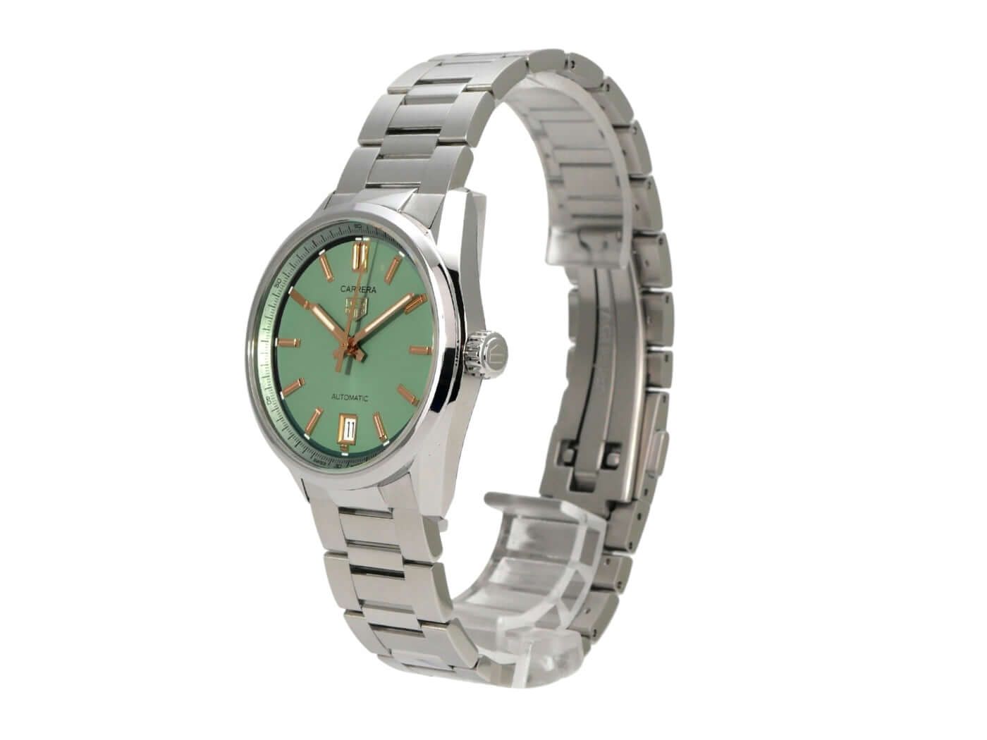 TAG Heuer Carrera Date WBN2312.BA0001Case made of polished and brushed stainless steel, case diameter 36 mm, stainless steel bezel, brushed stainless steel band with folding clasp, green dial with applied luminous hour markers, luminous hands, self-winding movement, TAG Heuer 7 caliber, date display with quick adjustment, sapphire glass, screw-down crown, stainless steel back with viewing window, water-resistant up to 5 bar.