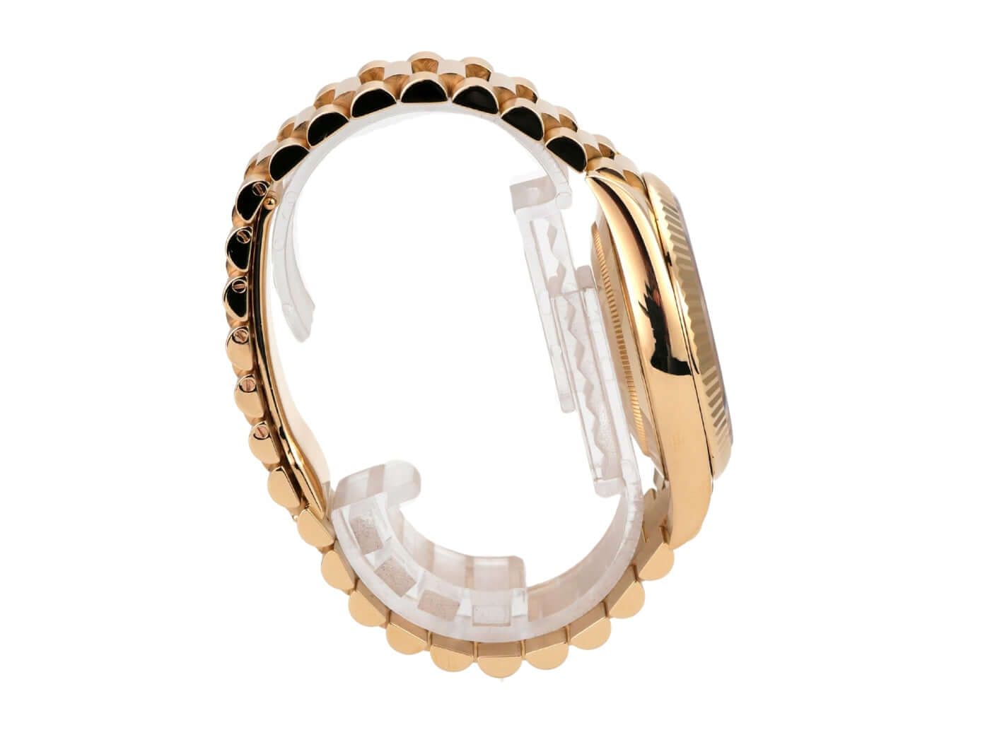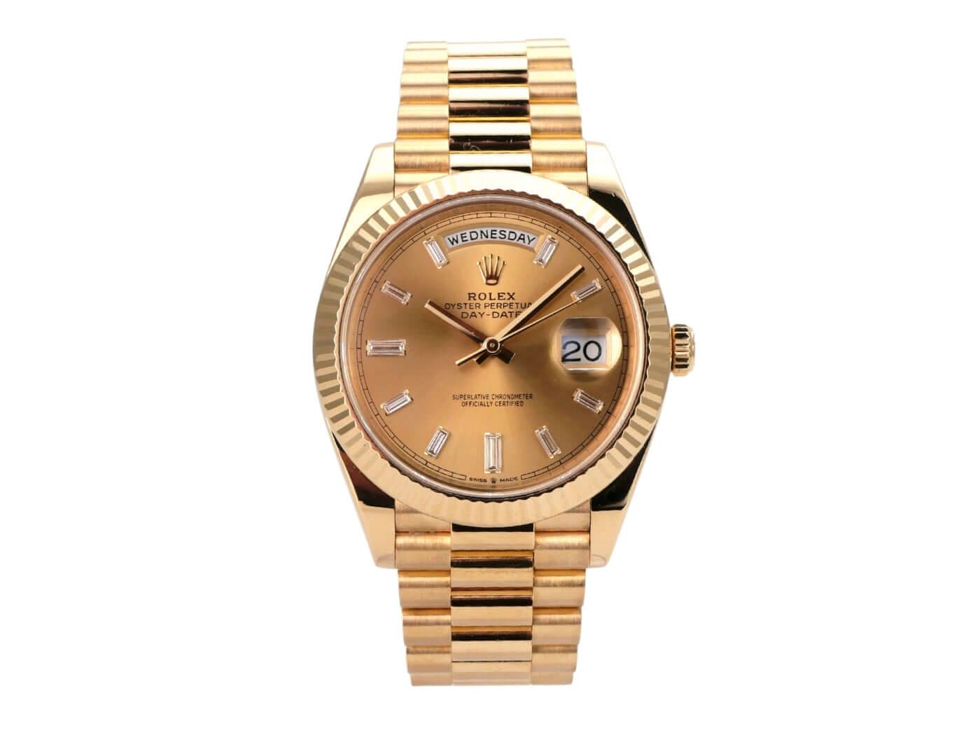 Gehäuse aus 18 ct poliertem Gelbgold, Gehäusedurchmesser 40 mm, Lünette aus 18 ct geriffeltem Gelbgold, Präsidentenarmband aus 18 ct poliertem und satiniertem Gelbgold mit Faltschließe, champagnerfarbene Diamant-Wijzerplaat, automatisches Uhrwerk, Chronometer, Rolex Manufakturkaliber 3255, Anzeige von Stunden und Minuten aus der Mitte, Datum mit Lupe bei 3 Uhr, kratzfestes Saphirglas, verschraubter Gehäuseboden aus 18 ct Gelbgold, wasserdicht bis 10 bar.