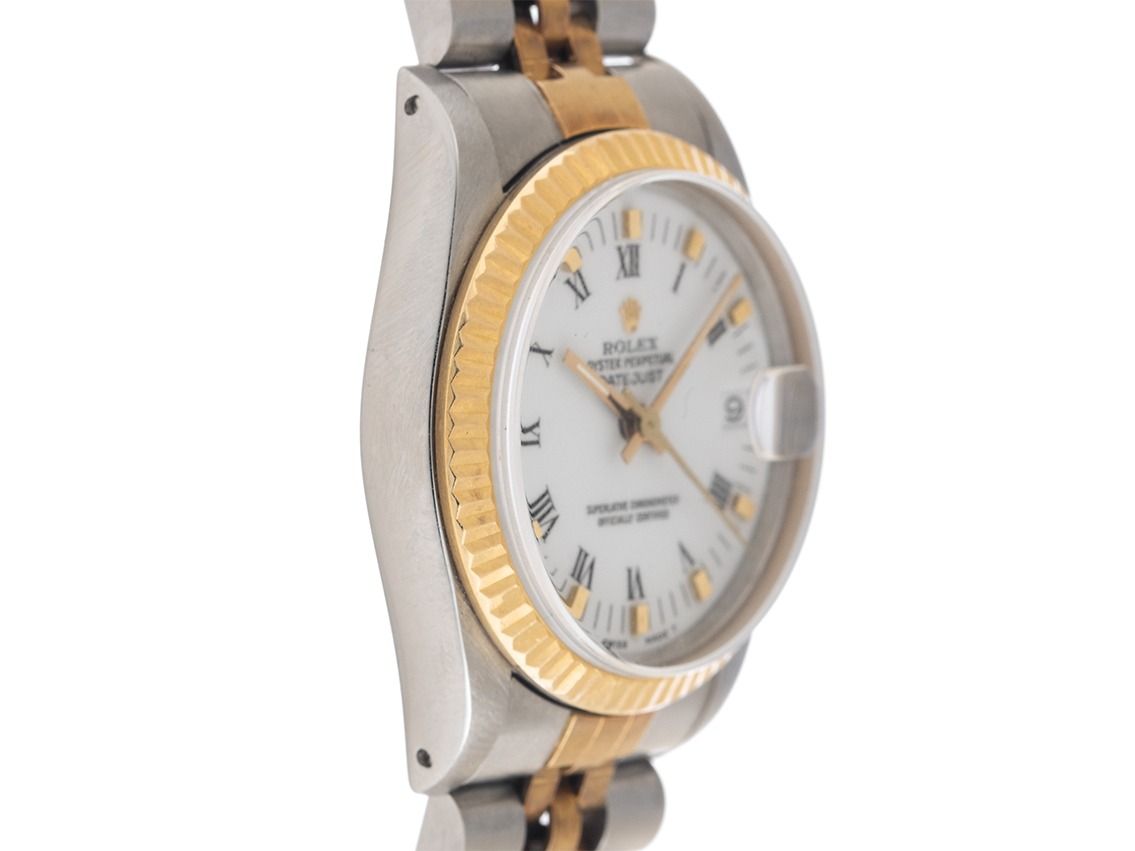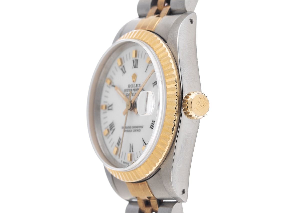 Gehäuse aus poliertem und satiniertem Edelstahl, Gehäusedurchmesser ohne Krone 31mm, Gehäusehöhe 11,0mm. Lünette aus geriffeltem und poliertem 18kt Gelbgold. Armband Jubilé aus poliertem und satiniertem Edelstahl / 18kt Gelbgold, Faltschließe aus Edelstahl mit Hersteller-Logo. Zifferblatt in Weiß mit römischen Ziffern und gelbgoldenen Zeigern. Uhrwerk Automatik, Chronometer mit Zeugnis, Rolex Manufakturkaliber 2135 mit 29 Edelsteinen. Anzeige von Stunde, Minute und Sekunde über Zeiger aus der Mitte mit Sekundenstopp zur sekundengenauen Einstellung der Uhrzeit, Datumsanzeige mit Schnellverstellung unter Glaslupe bei 3 Uhr. Saphirglas kratzfest. Krone verschraubbar mit Hersteller-Logo. Boden aus Edelstahl verschraubt. Gewicht der Uhr inklusive Armband 71g, Länge des Armbandes inklusive Gehäuse 160mm. Referenznummer: 68273, Gehäusenummer: 8899XXX, ID: P0809134000425H-10200, Artikelnummer: 10000079740. Mit Gangkontrolle und kompletter äußerlicher Aufarbeitung von April 2025. Original Rolex Box mit Umkarton und Garantie-Papieren von Dezember 1985 sowie Beschreibung, Übersetzungsheft, Ledermäppchen, Rolex Chronometer-Siegel, Tag und Watchregister-Auszug von April 2025, The Watch Register Zertifikat / ohne Eintrag (Internationale Datenbank für verlorene oder gestohlene Uhren), LC 400 / Hong Kong, Full Set. Superschnäppchen, Kapitalanlage mit Wertsteigerungspotential, aus erster Hand. Sehr guter Zustand. Lieferzeit sofort.