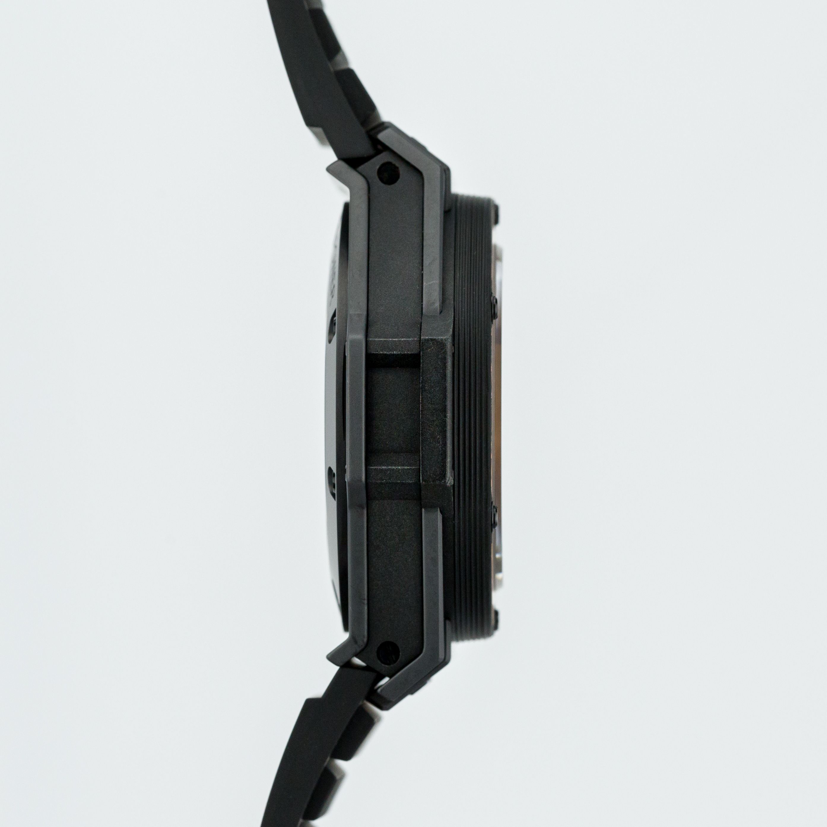 Die hier präsentierte Uhr ist definitiv eines der interessantesten Hublot-Modelle, die durch unsere Hände gegangen sind. Fangen wir damit an, dass die Uhr in grandiosen 48 mm daherkommt – eine Größe, mit der die meisten Uhrenmarken nicht aufwarten können. Sie würde an den meisten Handgelenken kaum gut aussehen, aber sie wird sicherlich an der Hand derjenigen hervorstechen, die es wagen, eine Uhr in so einer unkonventionellen Größe zu erwerben. Das zweite, was uns an diesem Modell stark beeindruckt, ist die unglaublich schöne Kombination aus mattem Schwarz und 18-karätigem Roségold, die wir an der gesamten Uhr erkennen können – der Lünette, der Krone, der Schließe und sogar durch das Werk, das wir sowohl durch den Saphirboden als auch durch das skelettierte Zifferblatt genießen können, was das Gefühl vermittelt, dass wir jeden einzelnen Teil des Werks berühren können, egal wie klein und kaum wahrnehmbar er ist.