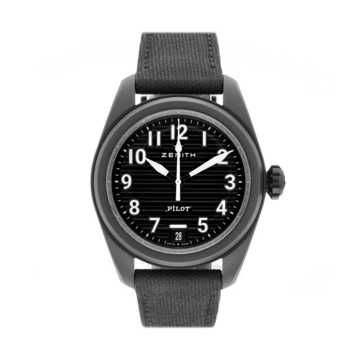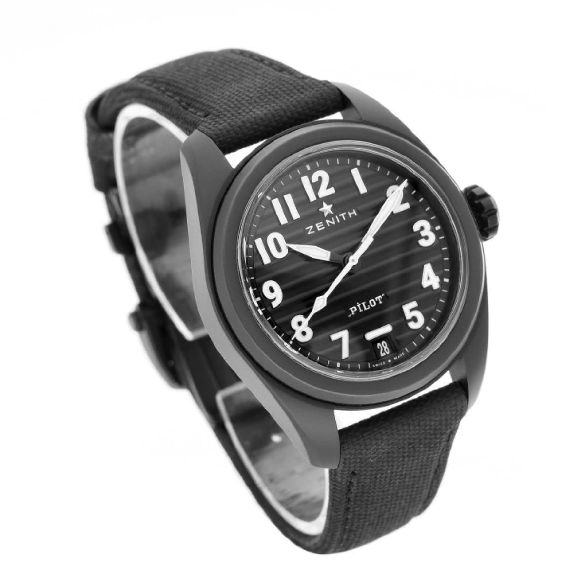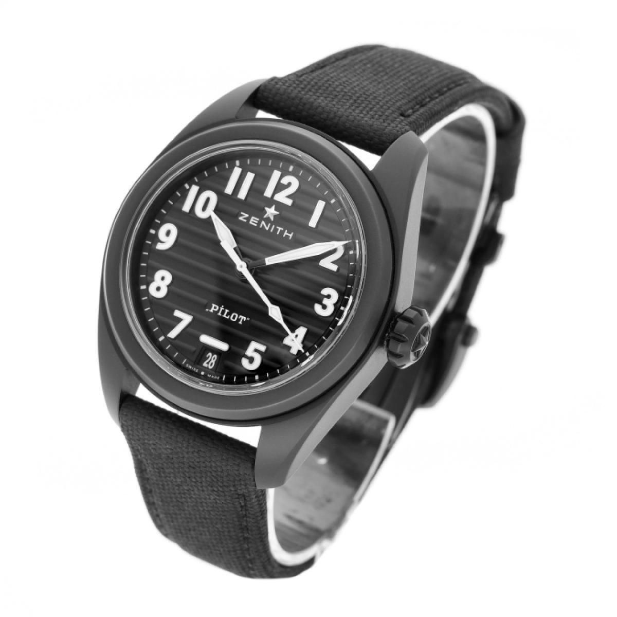 Zenith Pilot aus 2023 mit einem 40 mm Keramikgehäuse und doppelter Faltschließe. Diese Herren-Zenith-Uhr ist in sehr gutem Zustand.
