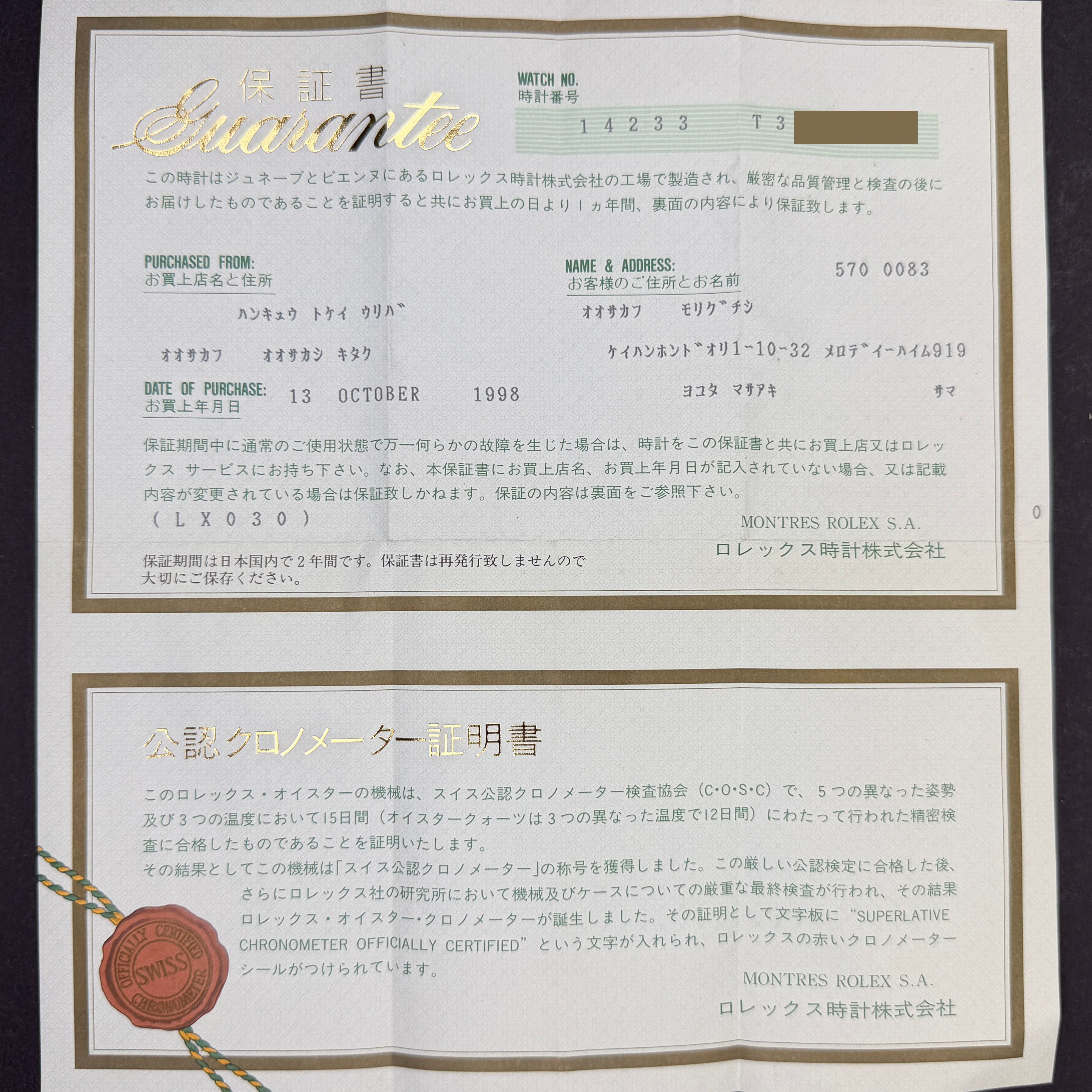 This Rolex Oyster Perpetual 14233 features a Champagne dial and is crafted from 18K yellow gold and stainless steel, with a production year of 1996.Case No: T37XXXX