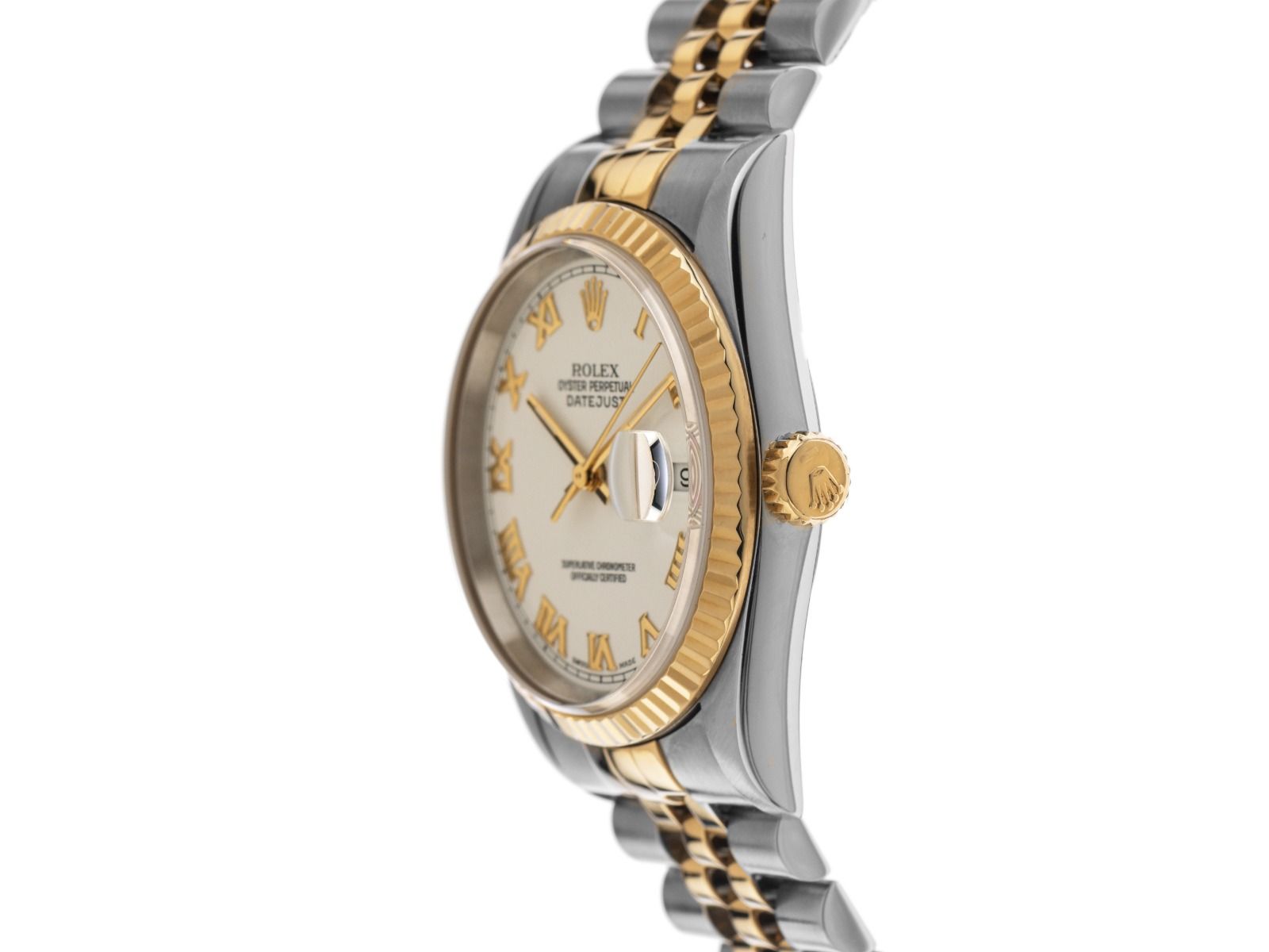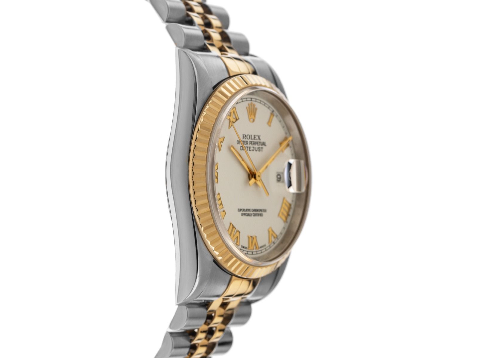 Rolex Datejust Stahl 18kt Gelbgold Automatik Armband JubiléGehäuse Edelstahl poliert und satiniert, Gehäusedurchmesser ohne Krone 36mm, Gehäusehöhe 11,4mm. Lünette 18kt Gelbgold geriffelt und poliert. Armband Jubilé Edelstahl / 18kt Gelbgold poliert und satiniert, Faltschließe Edelstahl mit Hersteller-Logo. Zifferblatt weiß mit aufgesetzten gelbgoldenen römischen Ziffern und gelbgoldenen Zeigern. Uhrwerk Automatik, Chronometer mit Zeugnis, Rolex Manufakturkaliber 3135 mit 31 Edelsteinen. Anzeige von Stunde, Minute und Sekunde über Zeiger aus der Mitte mit Sekundenstopp zur sekundengenauen Einstellung der Uhrzeit, Datumsanzeige mit Schnellverstellung unter Glaslupe bei 3 Uhr. Saphirglas kratzfest. Krone 18kt Gelbgold verschraubbar mit Hersteller-Logo. Boden Edelstahl verschraubt und verklebt. Gewicht der Uhr inklusive Armband 104g, Länge des Armbandes inklusive Gehäuse 195mm. Referenznummer: 16233, Gehäusenummer: T723XXX, Baujahr: 1996, ID: P2396127000226H-10500, Artikelnummer: 10000084532. Mit Gangkontrolle und kompletter äußerlicher Aufarbeitung von Februar 2026. Original Rolex Box mit Umkarton und Garantie Papiere von Juli 1998, LC 100 / Germany EU, sowie Beschreibung, Übersetzungsheft, Ledermäppchen, Rolex Chronometer-Siegel und Watchregister Auszug von Januar 2026, The Watch Register Zertifikat / ohne Eintrag (Internationale Datenbank für verlorene oder gestohlene Uhren), Full Set. Superschnäppchen, Kapitalanlage mit Wertsteigerungspotential, sehr seltenes Sammlerstück. Sehr guter Zustand. Lieferzeit sofort.