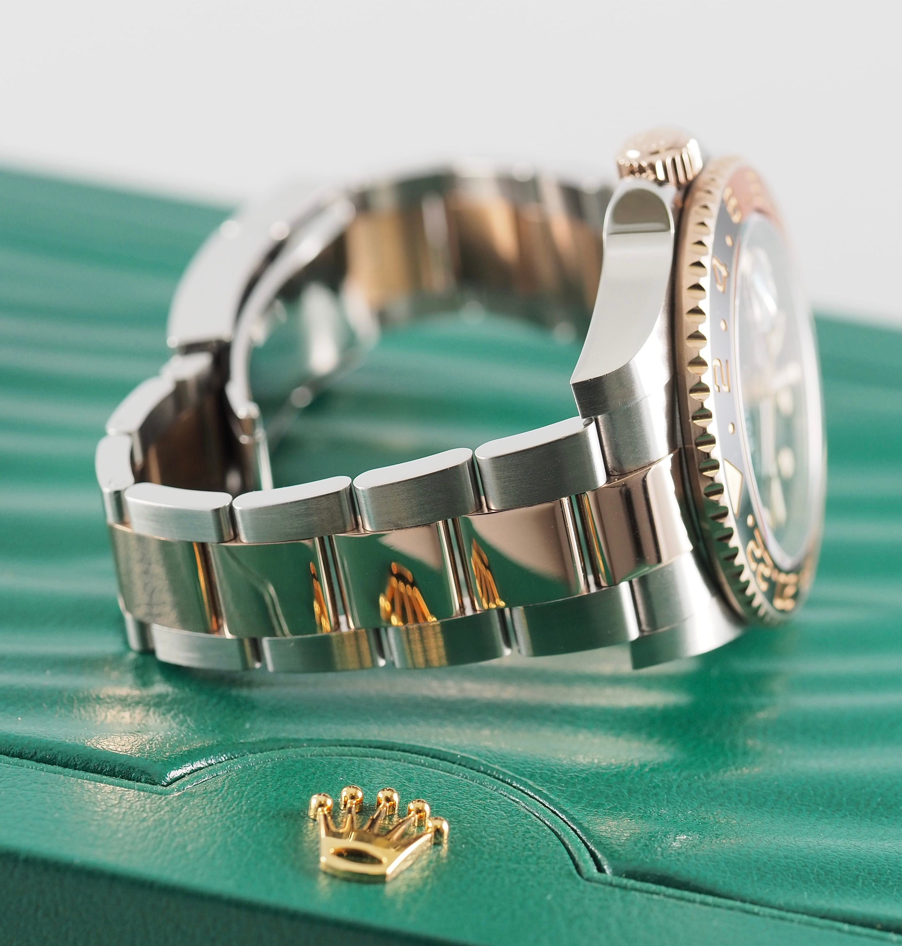 Fitted with the two-tone rose gold oyster bracelet, fitted to the sharp GMT-Master case with the rose golden bezel with the iconic rootbeer bezel.