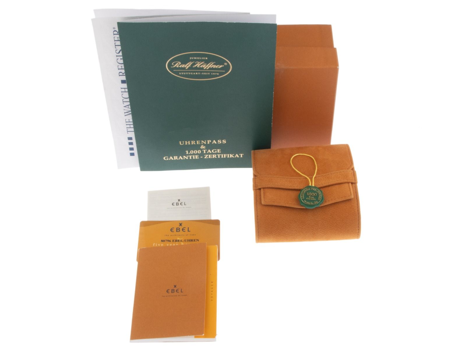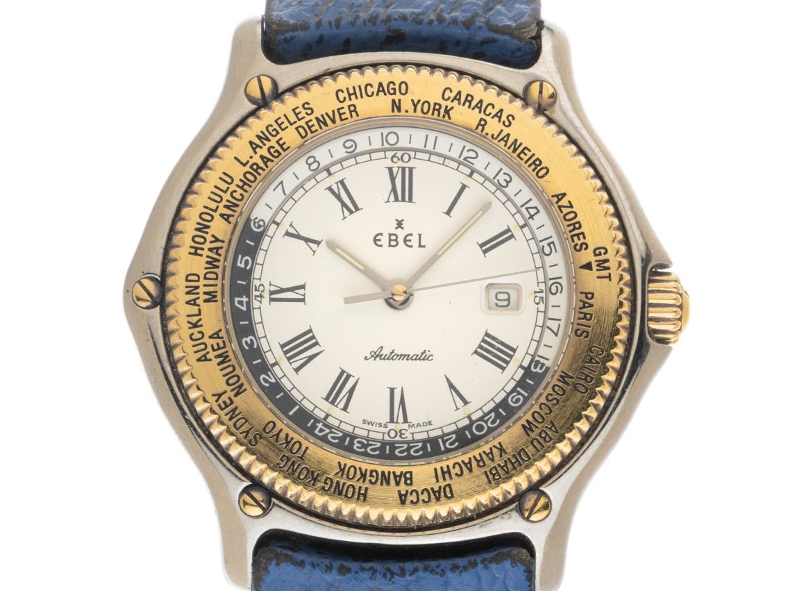 Gehäuse Edelstahl poliert und 5-fach verschraubt. Gehäusedurchmesser ohne Krone 38mm, Gehäusehöhe 9,7mm. Lünette 18kt Gelbgold geriffelt und satiniert mit gravierter Zeitzonen-Skala, beidseitig drehbar. Armband Leder blau mit Ebel Faltschließe Edelstahl, Anstoßbreite 20mm. Zifferblatt weiß mit römischen Ziffern und Edelstahl Zeigern. Uhrwerk Automatik, Kaliber Ebel 124 mit 21 Edelsteinen. Anzeige von Stunde, Minute und Sekunde über Zeiger aus der Mitte mit Sekundenstopp zur sekundengenauen Einstellung der Uhrzeit. Datumsanzeige bei 3 Uhr, zweite Zeitzone (GMT) ablesbar über Lünette und gekröpfter 24 Stunden Skala. Saphirglas kratzfest. Krone geriffelt mit Flankenschutz. Boden Edelstahl 8-fach verschraubt und graviert. Gewicht der Uhr inklusive Armband 75g. Referenznummer: 1124913-3001, Gehäusenummer: 34612XXX, ID: KW178920000226H-2800, Artikelnummer: 10000084740. Mit Gangkontrolle und kompletter äußerlicher Aufarbeitung von Februar 2026. Original Ebel Box mit Umkarton und Garantie Papiere von Juli 1998 sowie Beschreibung und Watchregister Auszug von Februar 2026, The Watch Register Zertifikat / ohne Eintrag (Internationale Datenbank für verlorene oder gestohlene Uhren), Full Set. Superschnäppchen, aus erster Hand, sehr guter Zustand. Lieferzeit sofort.