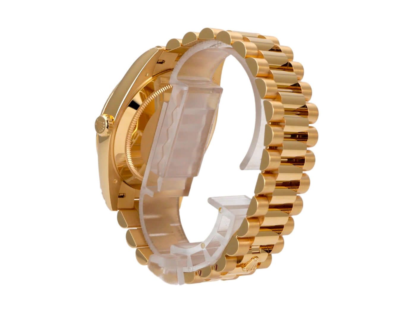 Gehäuse aus poliertem 18 kt Gelbgold, Gehäusedurchmesser 40 mm, Lünette aus geriffeltem 18 kt Gelbgold, Präsidentenarmband aus poliertem und satiniertem 18 kt Gelbgold mit Faltschließe, grüne Ombre-Zifferblatt mit aufgesetzten goldenen römischen Ziffern, automatisches Uhrwerk, Chronometer, Rolex Manufakturkaliber 3255, Datum mit Zyklop-Linse bei 3 Uhr, Wochentag, kratzfestes Saphirglas, verschraubter Gehäuseboden aus 18 kt Gelbgold, wasserdicht bis 10 bar.