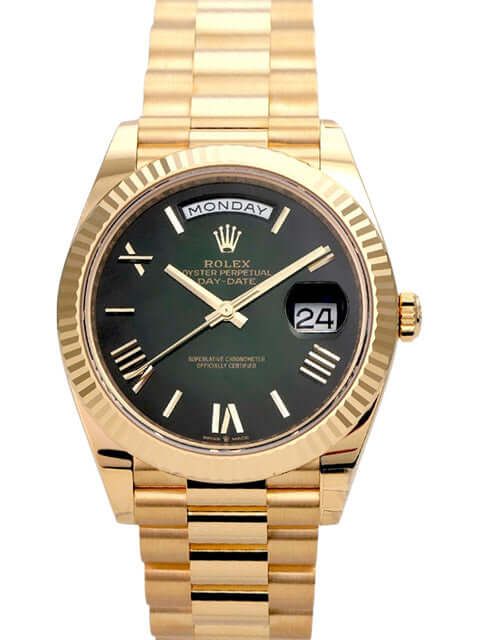 Rolex Day-Date 40 18 kt Yellow Gold Ref. 228238 Green Ombre RomanCase made of polished 18 kt yellow gold, case diameter 40 mm, bezel made of fluted 18 kt yellow gold, President bracelet made of polished and satin-finished 18 kt yellow gold with folding clasp, green ombré dial with applied gold Roman numerals, automatic movement, chronometer, Rolex manufacture caliber 3255, date with cyclops lens at 3 o'clock, day of the week, scratch-resistant sapphire crystal, screw-down case back made of 18 kt yellow gold, water-resistant up to 10 bar.