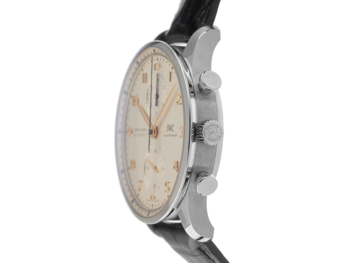 IWC Portugieser Stahl Automatik Chronograph Armband Krokoleder FaltschließeGehäuse Edelstahl poliert und satiniert, Gehäusedurchmesser ohne Krone 41mm, Gehäusehöhe 13,0mm. IWC Armband Krokoleder mit Ziernaht, Anstoßbreite 20mm, Doppelfaltschließe Edelstahl mit Hersteller-Logo. Zifferblatt silberfarben mit aufgesetzten gelbgoldenen arabischen Ziffern und gelbgoldenen Zeigern. Uhrwerk Automatik, Chronograph, IWC Manufakturwerk 69355 mit 27 Edelsteinen, Gangreserve ca. 46 Stunden. Anzeige von Stunde und Minute über Zeiger aus der Mitte, kleine Sekunde mit Sekundenstopp zur sekundengenauen Einstellung der Uhrzeit bei 6 Uhr. Saphirglas kratzfest und gewölbt. Krone mit Hersteller-Logo. Boden Edelstahl 4-fach verschraubt und graviert mit Saphirglas Sichtfenster. Gewicht der Uhr inklusive Armband 86g. Wasserdicht bis 3 ATM. Referenznummer: IW371604, ID: P2513104000226H-9100, Artikelnummer: 10000084794. Original IWC Box mit Umkarton und Garantie Papiere von April 2025, Erstkaufrechnung von Juwelier Altherr sowie Watchregister Auszug von Februar 2026, The Watch Register Zertifikat / ohne Eintrag (Internationale Datenbank für verlorene oder gestohlene Uhren), Full Set. Ungetragen. Lieferzeit sofort.