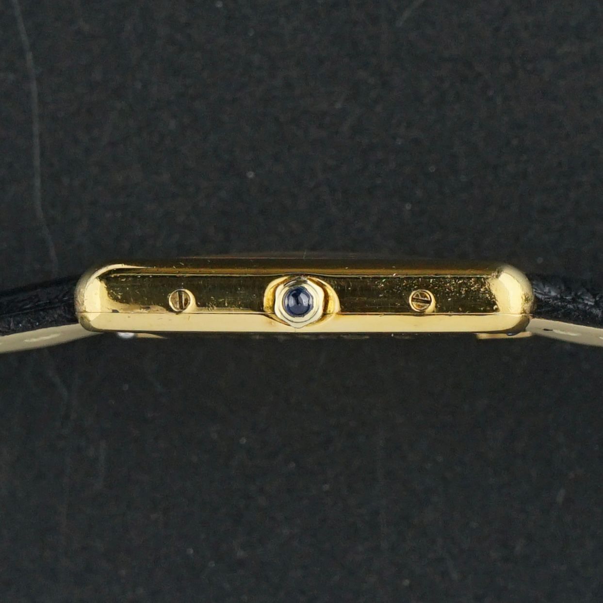 A Vintage Cartier Tank Vermeil, produced in the 1990s. It features a vertically brushed light gray dial with an hour marker sector and patina spots in the center sector of the watch, which magically disappear when viewed under certain light angles. It has blued hands and the blue ruby cabochon crown.The case is very well preserved, with no silver shining through the gold plating, which is especially important for a vermeil example. Inside is a Cartier quartz movement, overhauled in February 2026, currently running and functioning excellently.