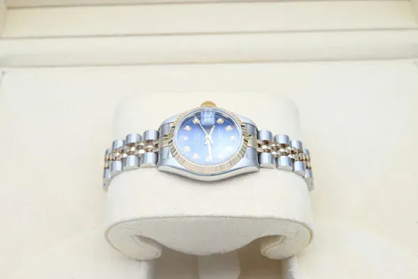 Rolex Lady-Datejust 69173 mit der blauen Diamant-Wijzerplaat aus 1994 in ausgezeichnetem Zustand, inklusive der Originalverpackung und Papiere. Alle unsere Uhren wurden gründlich von unserem eigenen Uhrmacher überprüft und bei Bedarf gewartet.