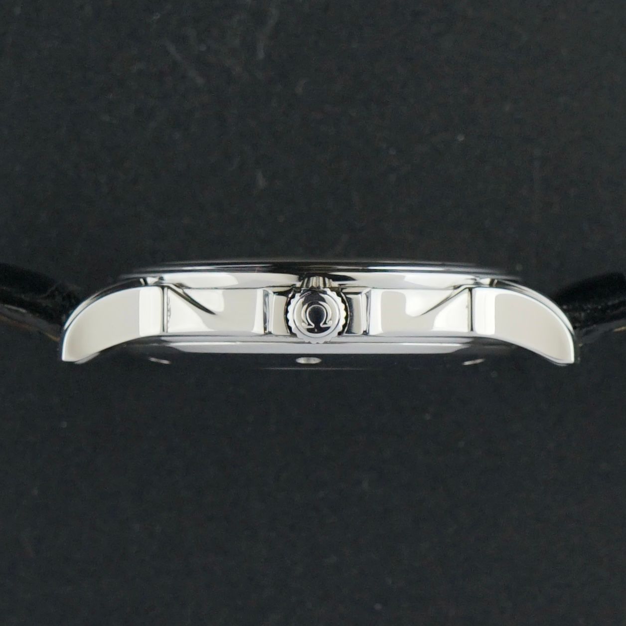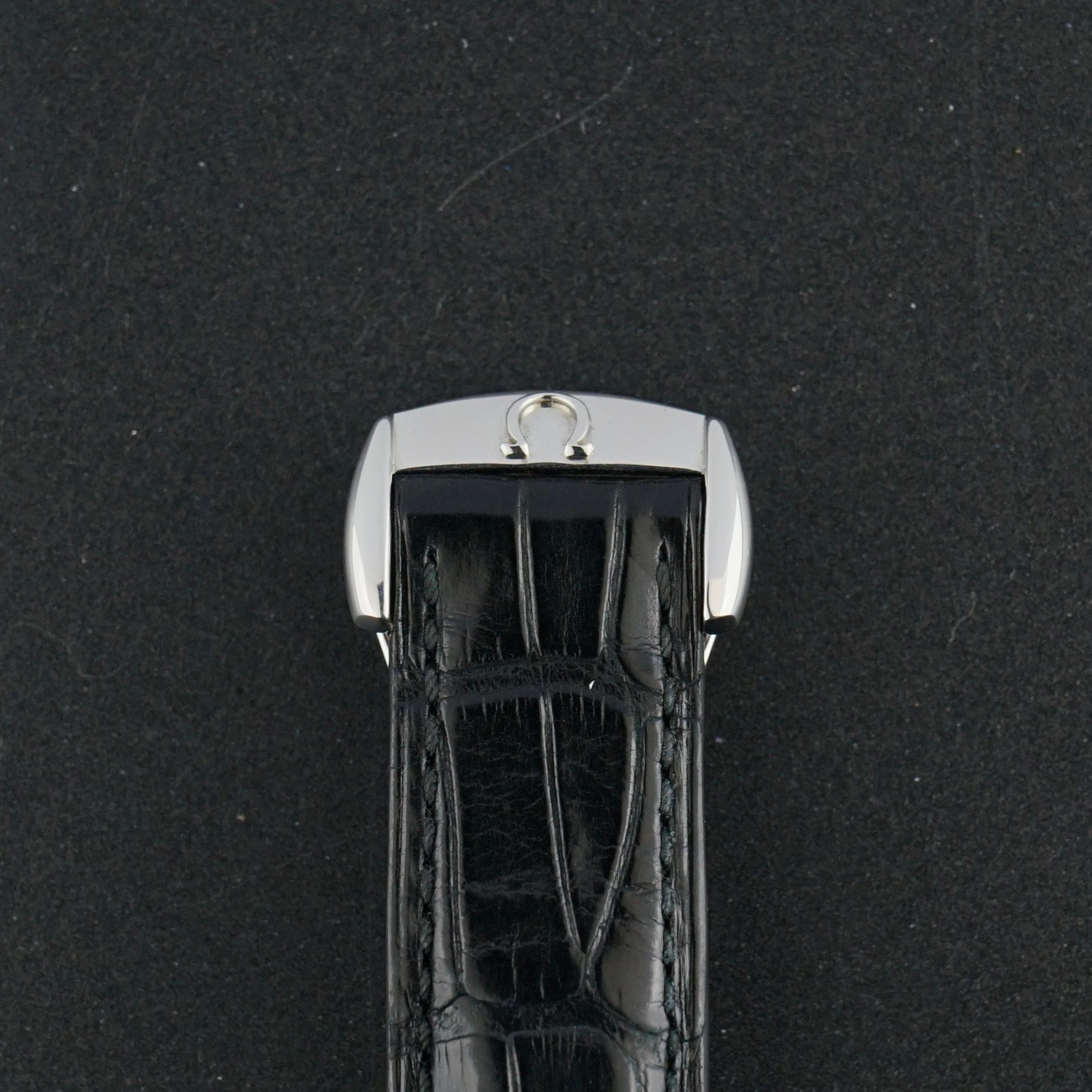 The watch comes with its original black Omega leather strap with crocodile motif and the original Omega folding clasp. Additionally, it includes the original tag displaying the serial number, reference number and movement number.