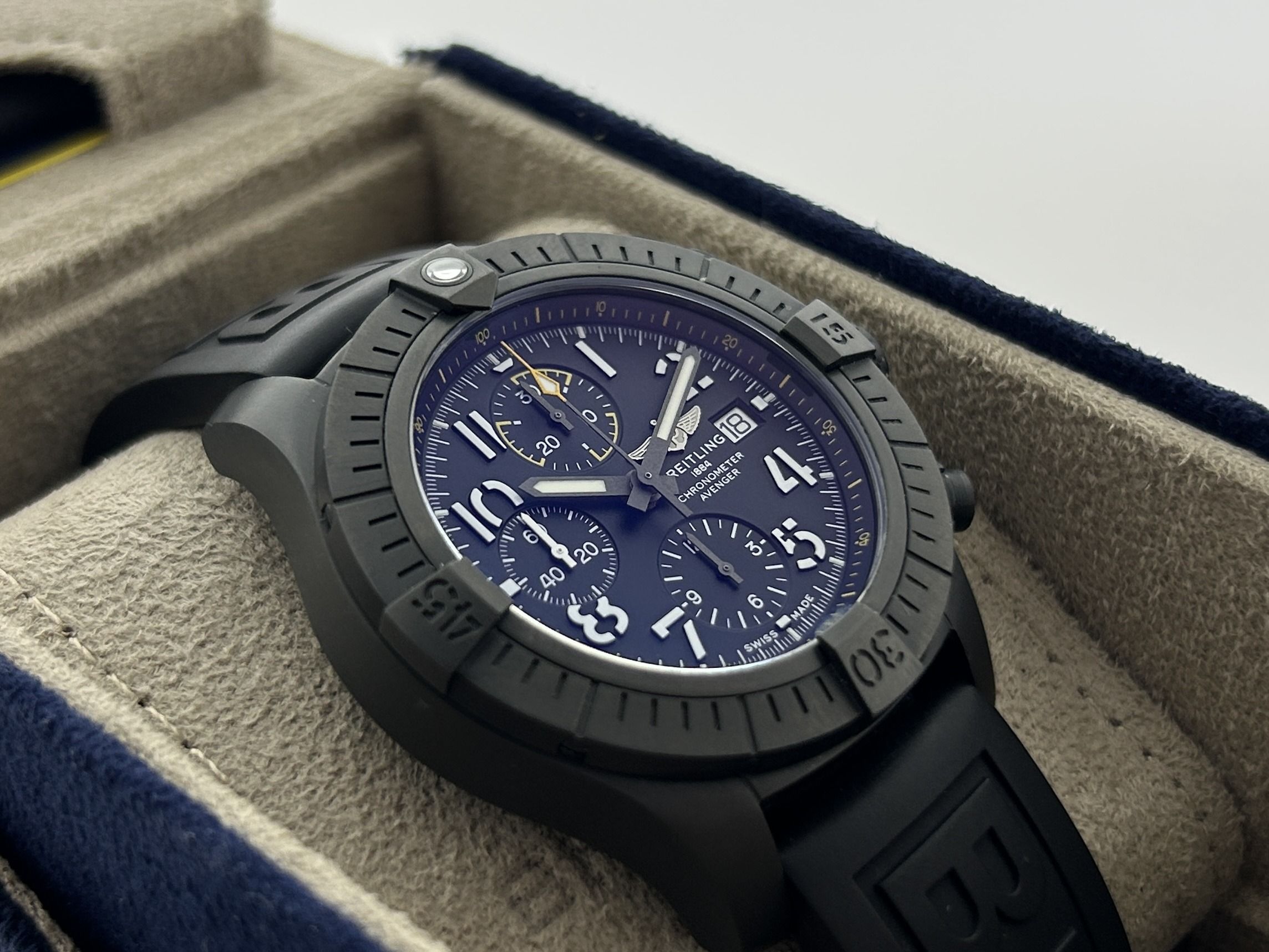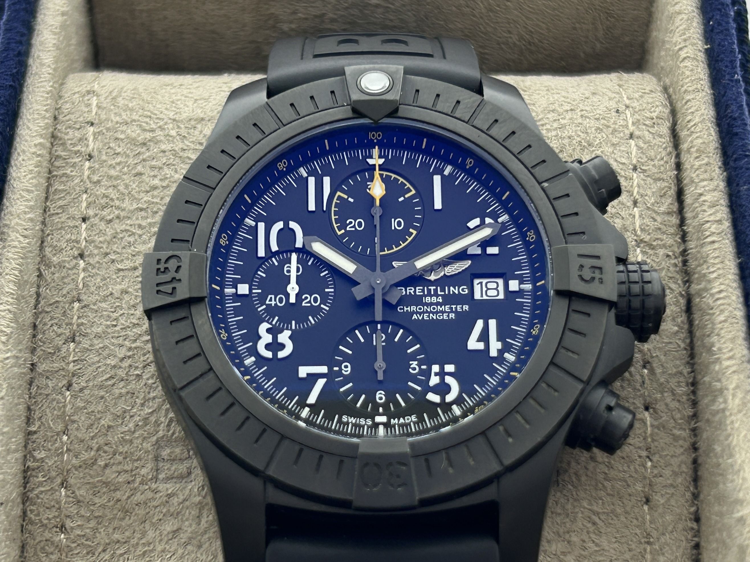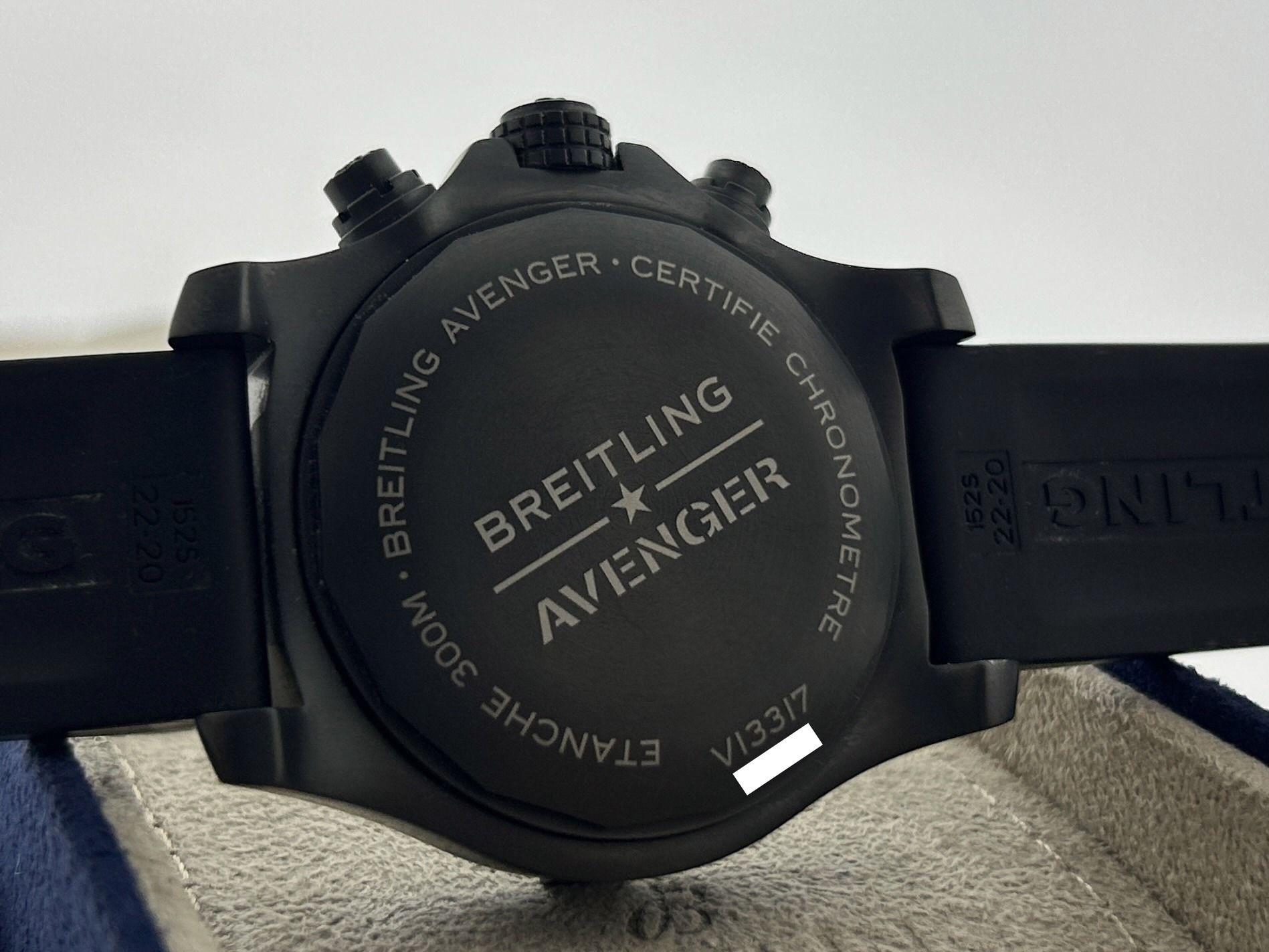 Eine Breitling Avenger Chronograph, Ref. V13317, Fullset, aus 2024. Die Uhr hat ein 45 mm schwarzes Titan-Gehäuse mit einer schwarzen, titanbeschichteten, einseitig drehbaren Lünette und einem schwarzen Gummiband. Die Breitling hat ein schwarzes Zifferblatt mit 3 Totalisatoren und einem Datumsfenster bei 3 Uhr. Die Uhr ist Fullset mit ihrer originalen Box und dem Zertifikat aus 2024. Die Breitling hat ein zusätzliches Set Armbänder.