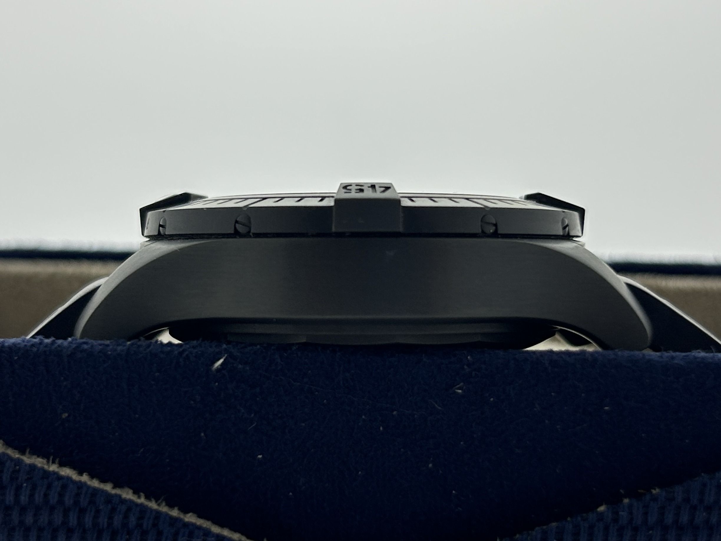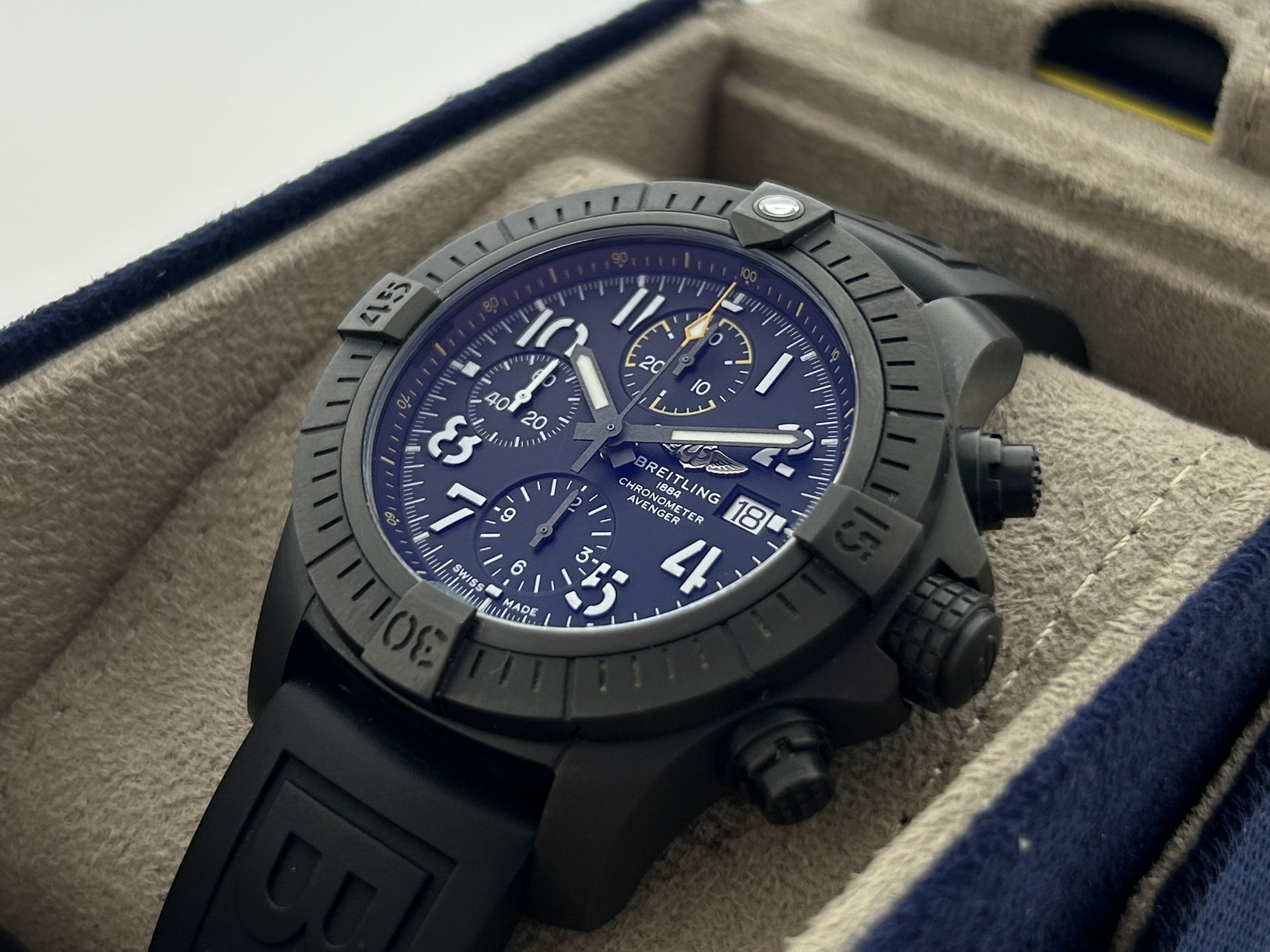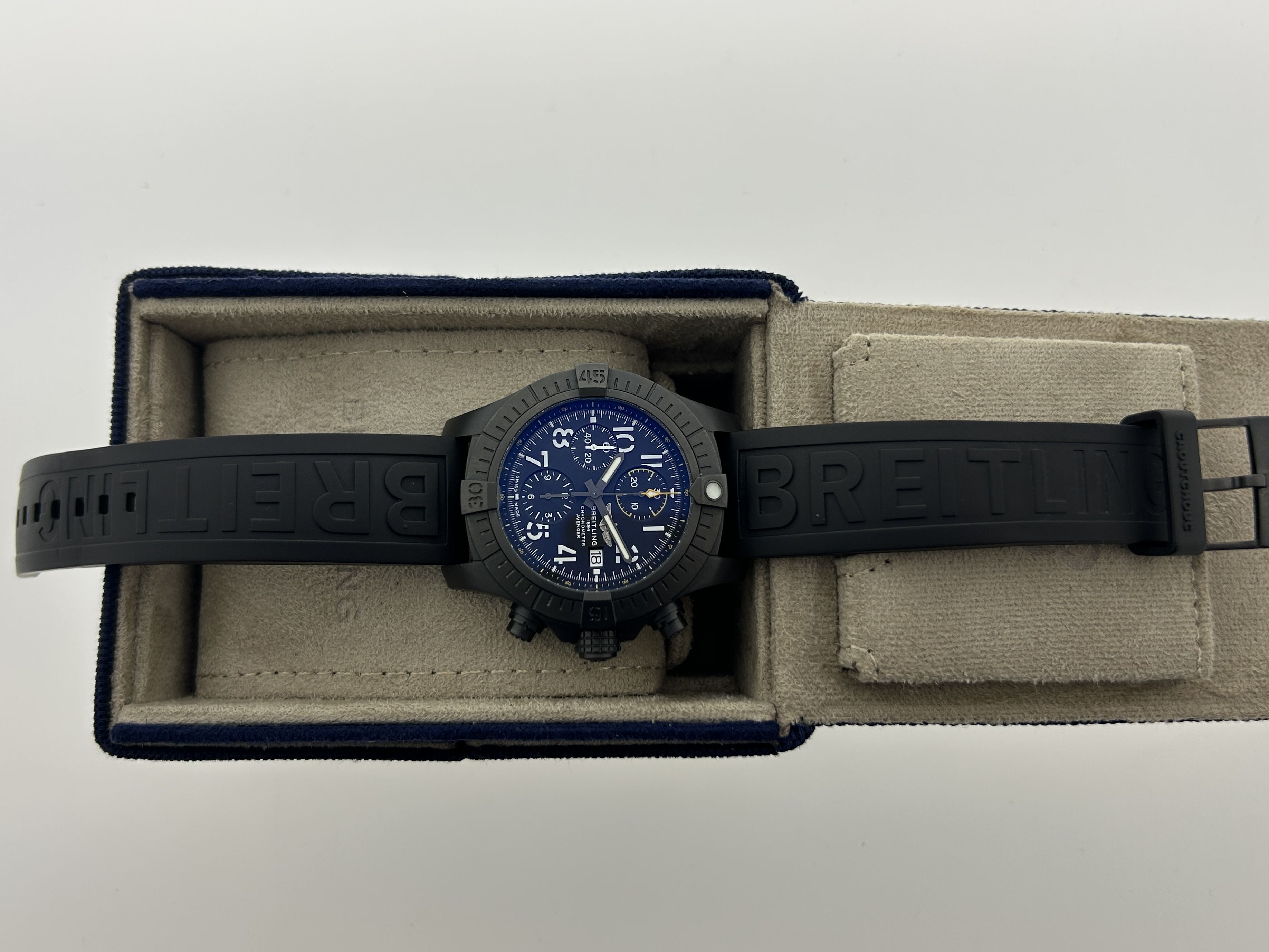 Eine Breitling Avenger Chronograph, Ref. V13317, Fullset, aus 2024. Die Uhr hat ein 45 mm schwarzes Titan-Gehäuse mit einer schwarzen, titanbeschichteten, einseitig drehbaren Lünette und einem schwarzen Gummiband. Die Breitling hat ein schwarzes Zifferblatt mit 3 Totalisatoren und einem Datumsfenster bei 3 Uhr. Die Uhr ist Fullset mit ihrer originalen Box und dem Zertifikat aus 2024. Die Breitling hat ein zusätzliches Set Armbänder.