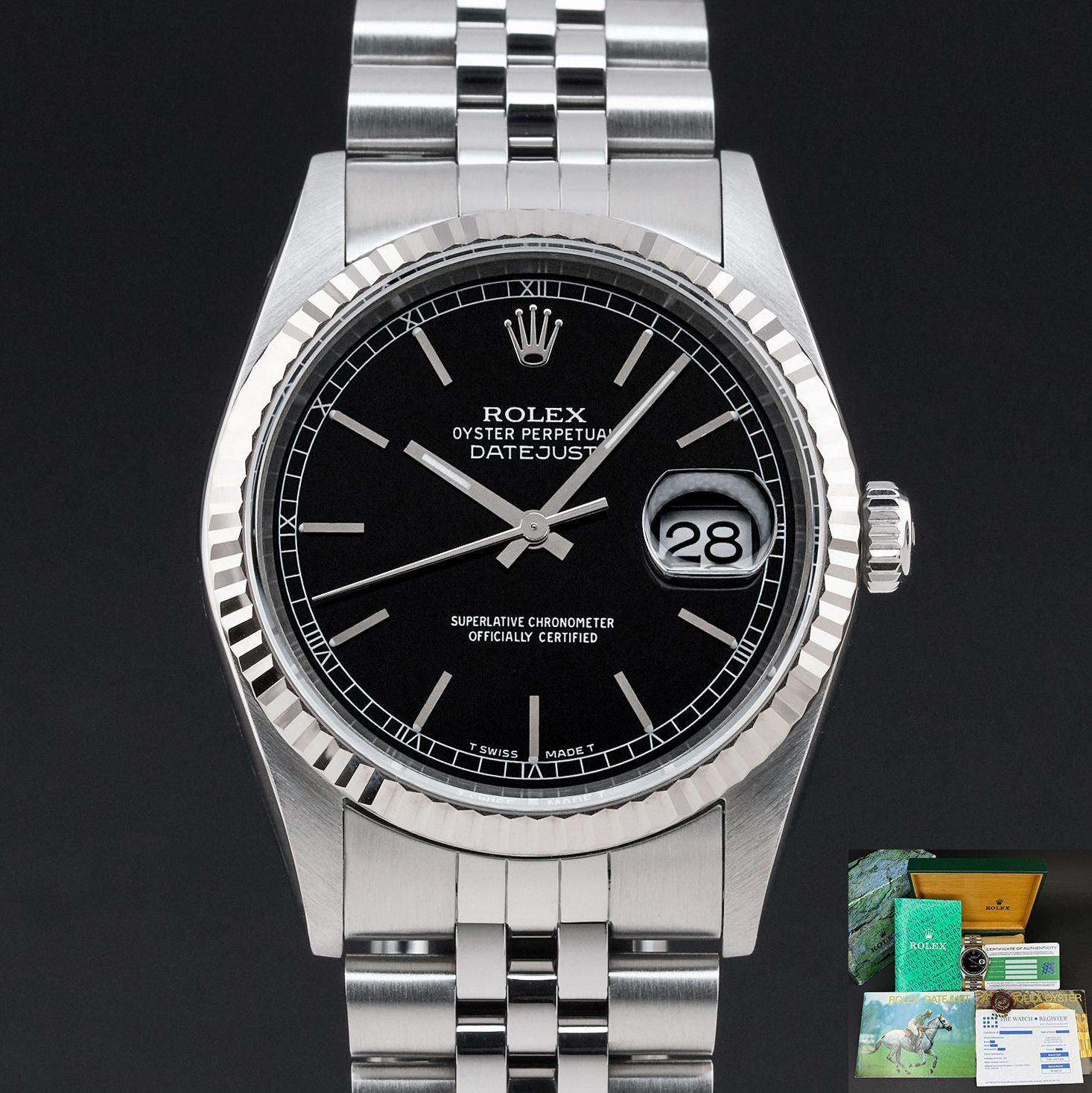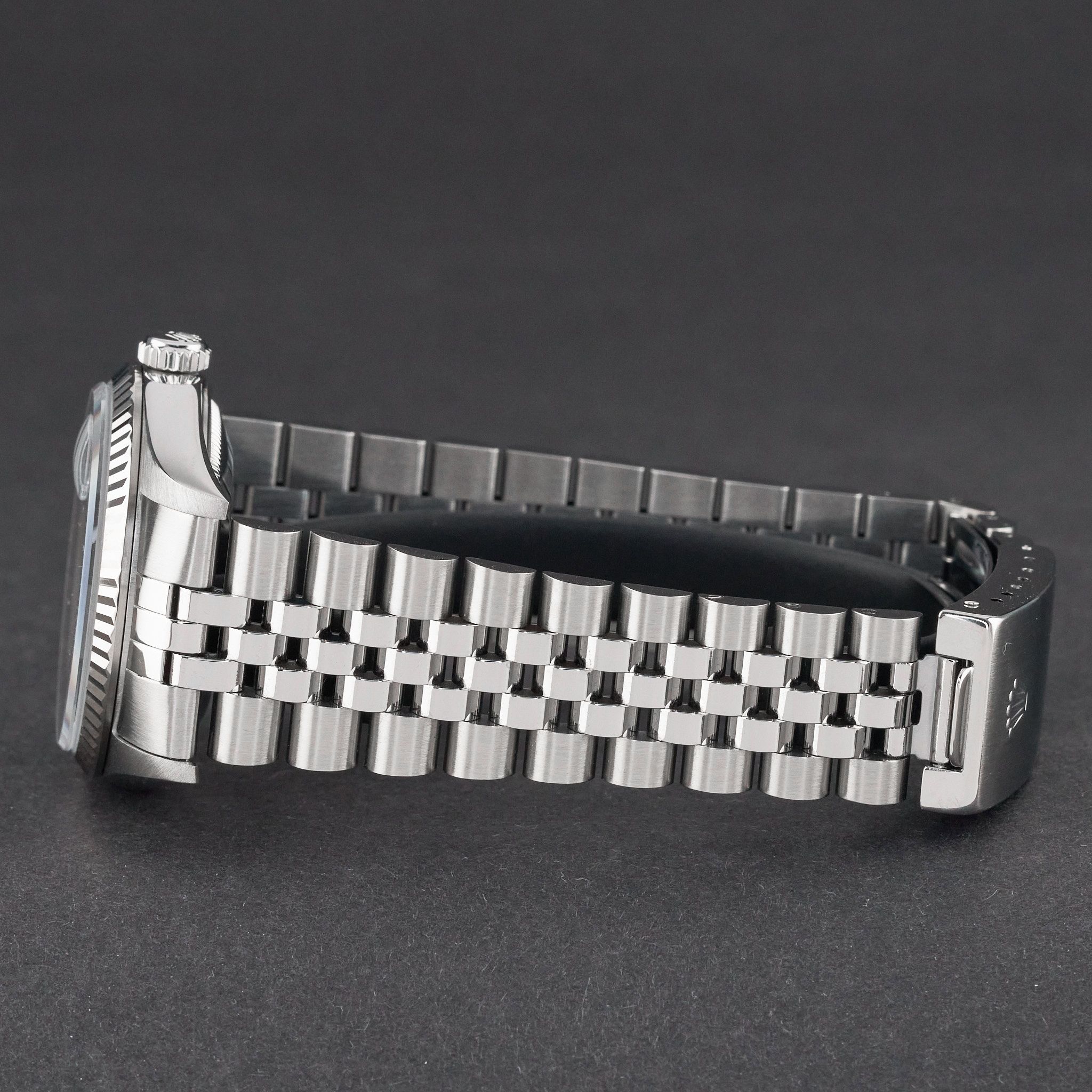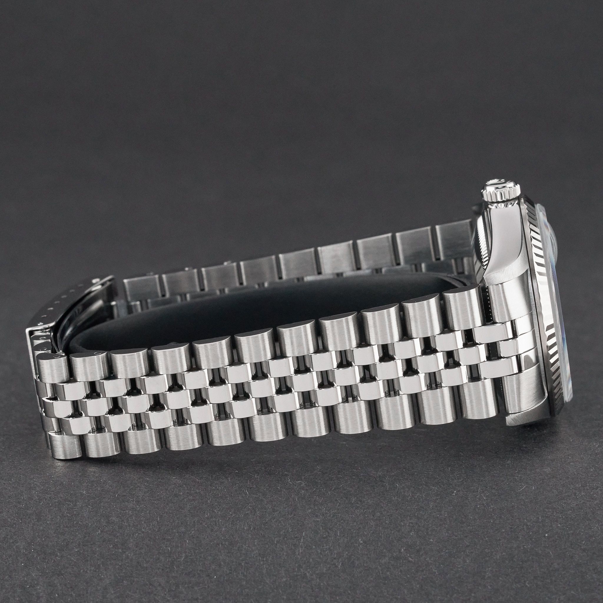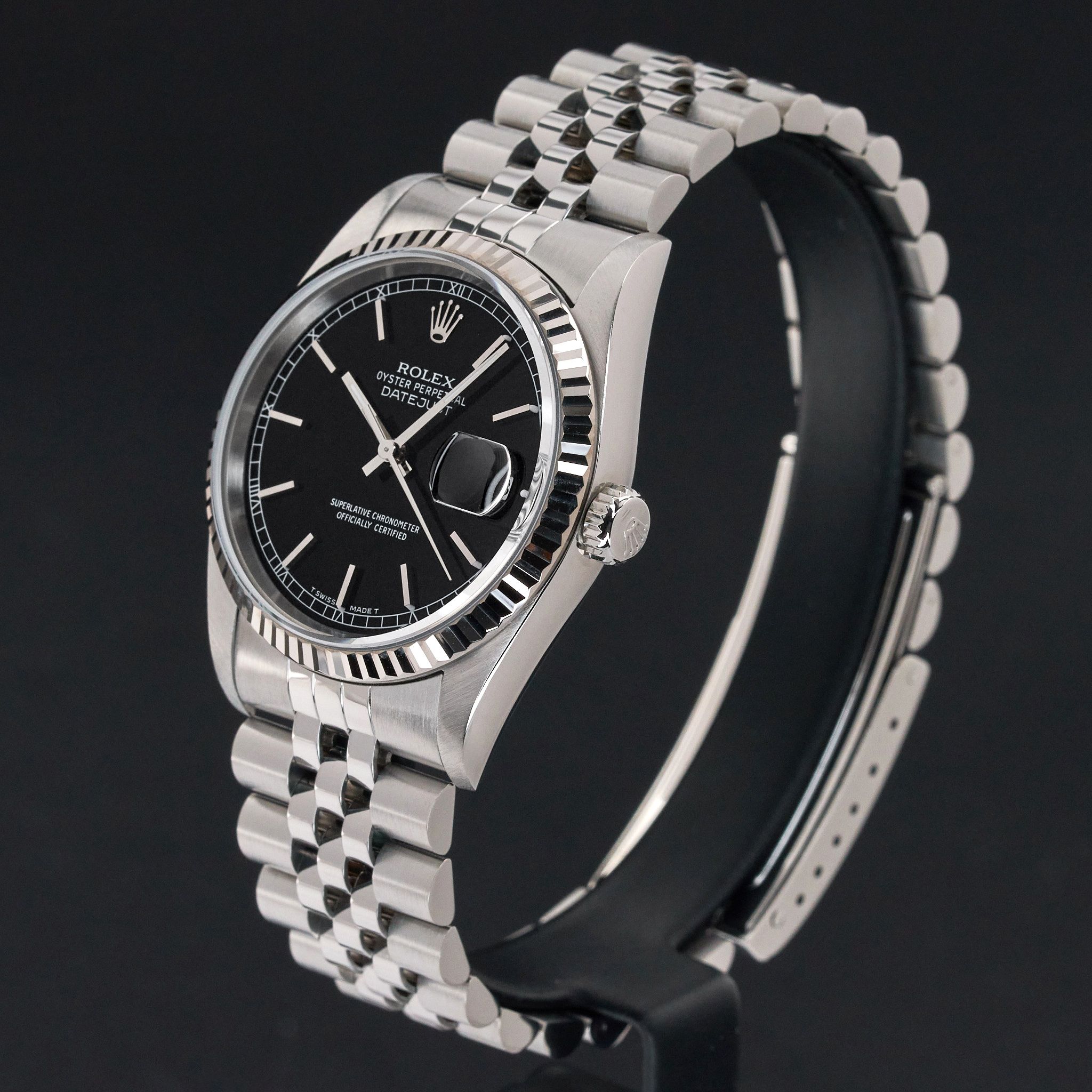 Diese Rolex Datejust 16234 verfügt über eine schwarze Zifferblatt und ist aus Edelstahl gefertigt, mit einem Produktionsjahr von 1997.