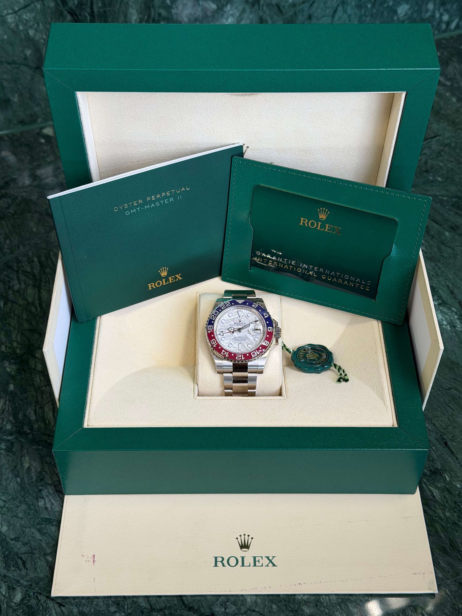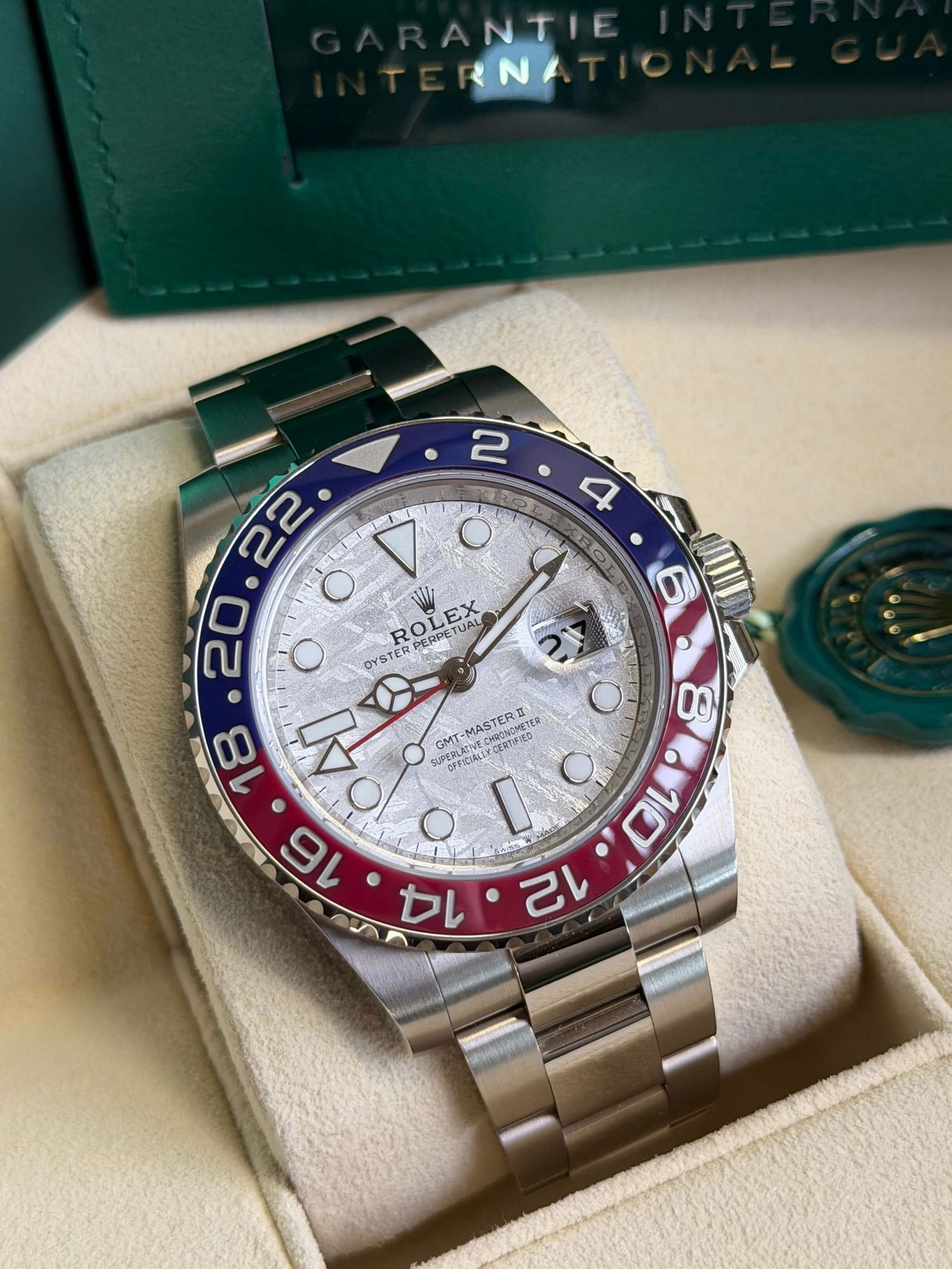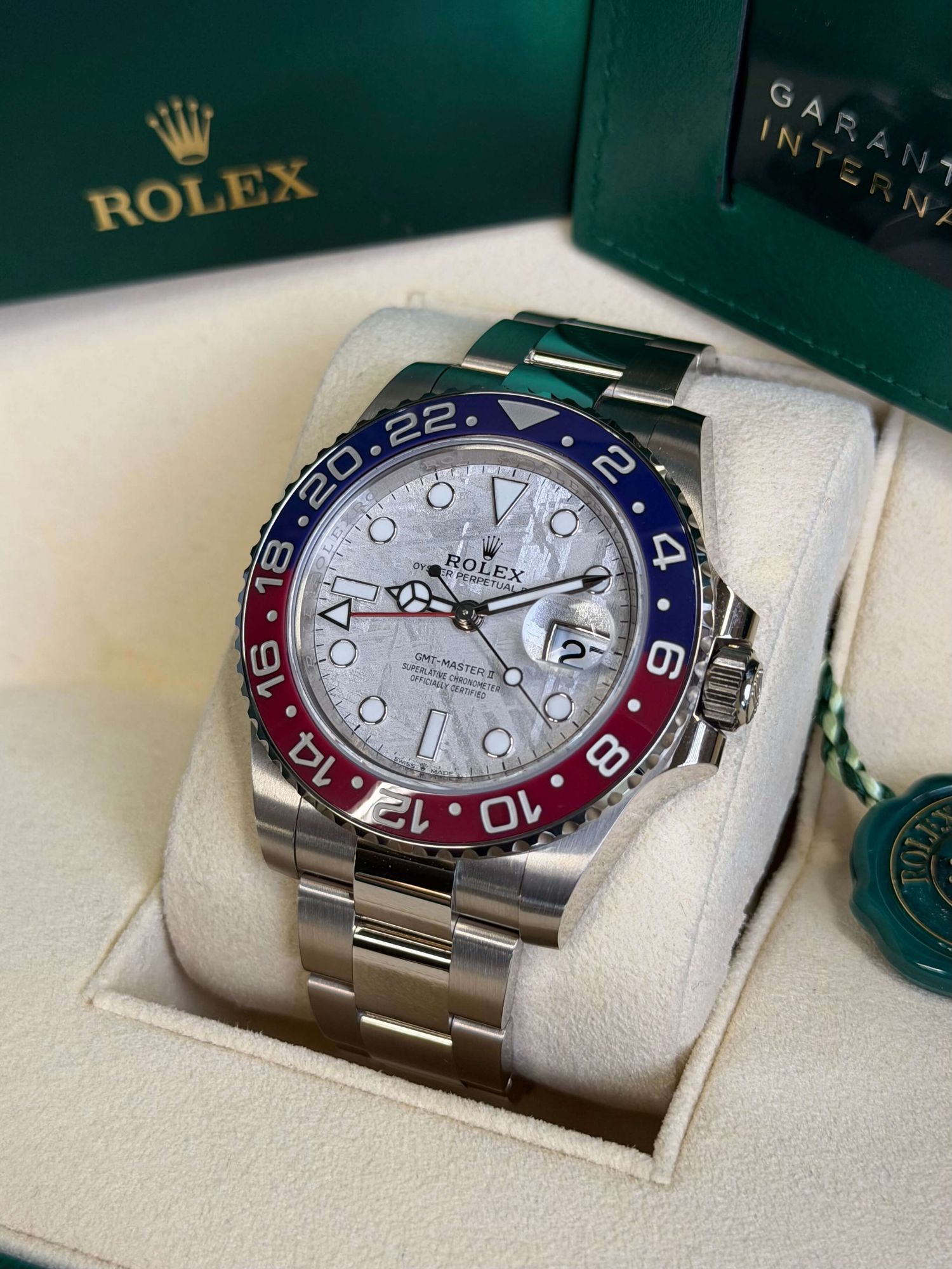 Die Rolex GMT-Master II Ref. 126719BLRO mit Meteoriten-Zifferblatt ist eine der exklusivsten Ausführungen innerhalb der GMT-Master-Linie. Dieses Exemplar stammt aus 2024, befindet sich in sehr gutem, unpoliertem Zustand und wird als Full Set geliefert.