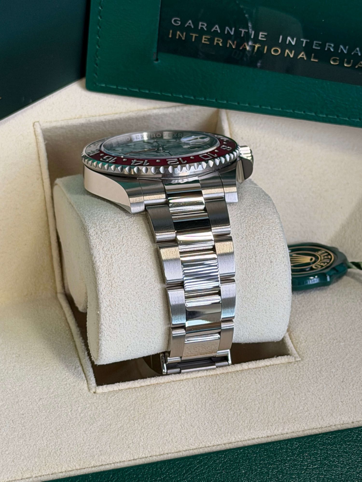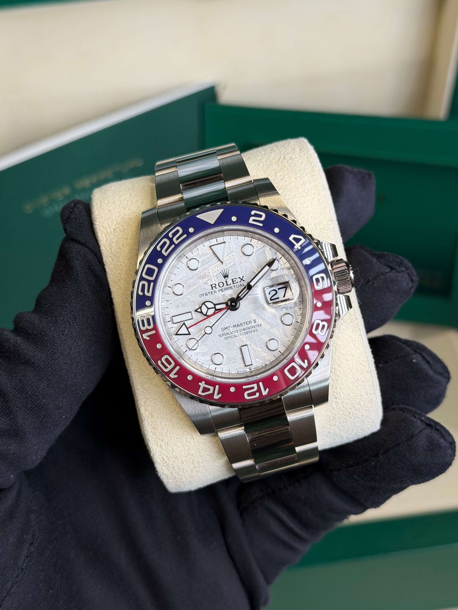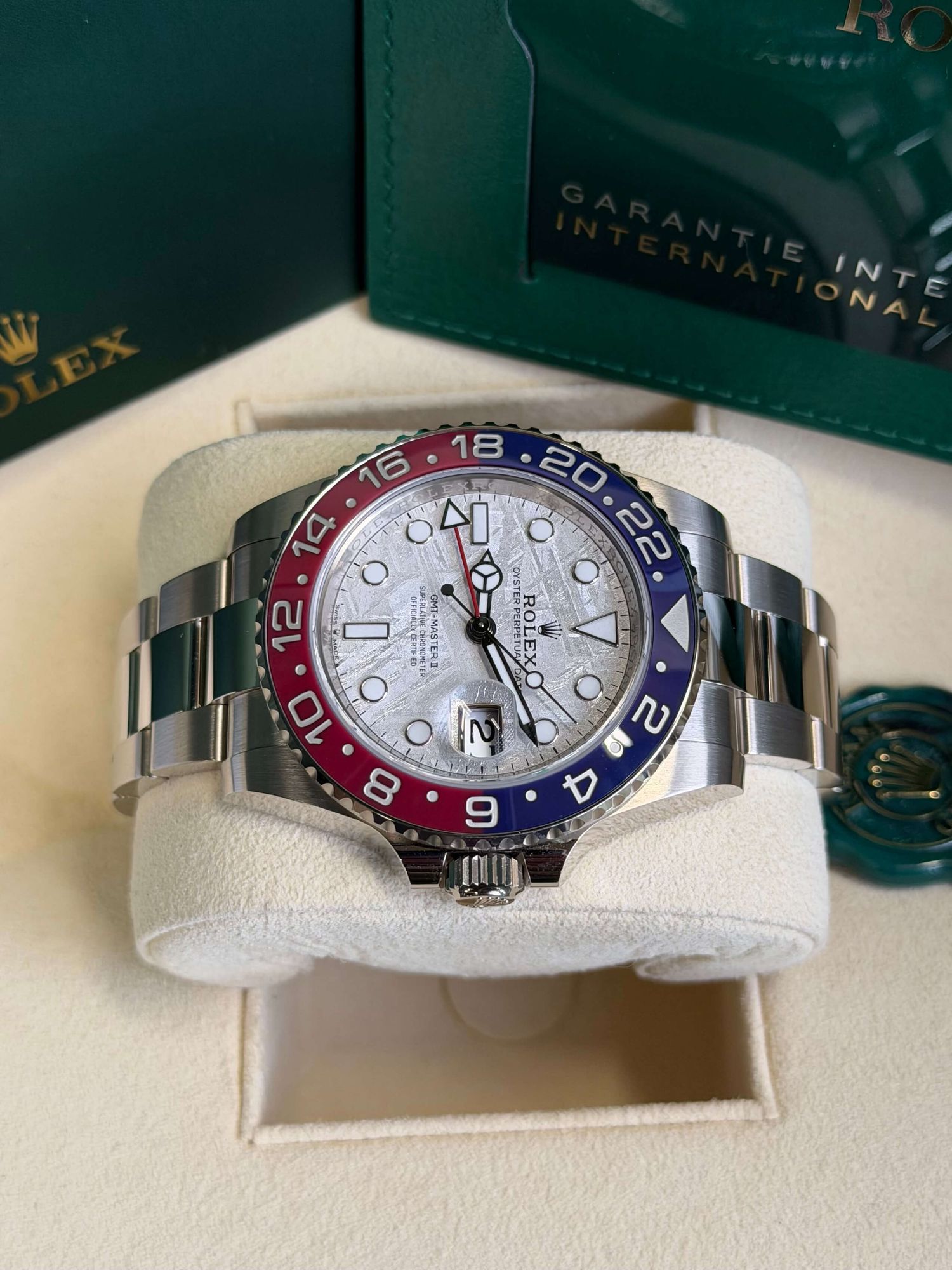 Die Rolex GMT-Master II Ref. 126719BLRO mit Meteoriten-Zifferblatt ist eine der exklusivsten Ausführungen innerhalb der GMT-Master-Linie. Dieses Exemplar stammt aus 2024, befindet sich in sehr gutem, unpoliertem Zustand und wird als Full Set geliefert.