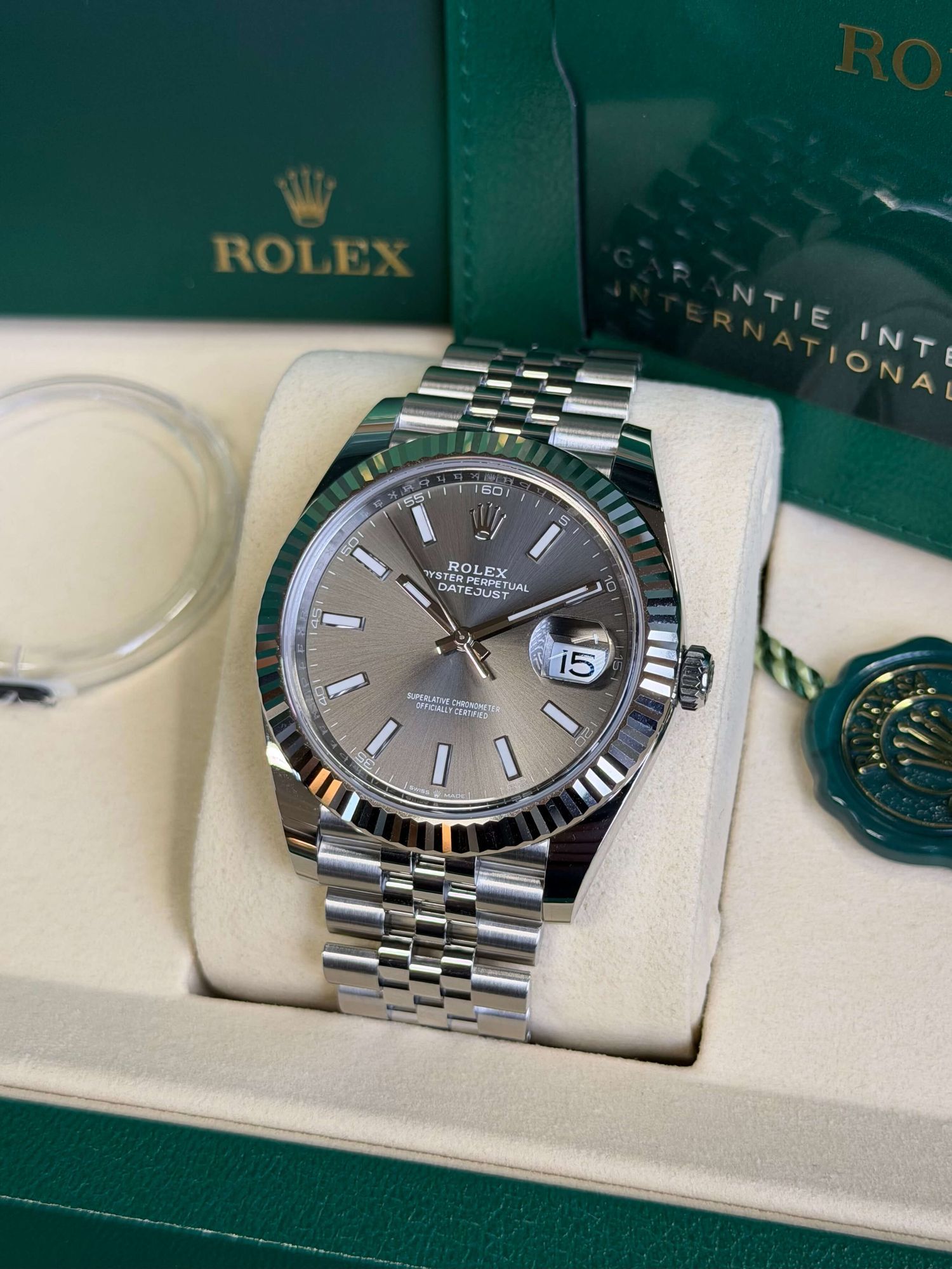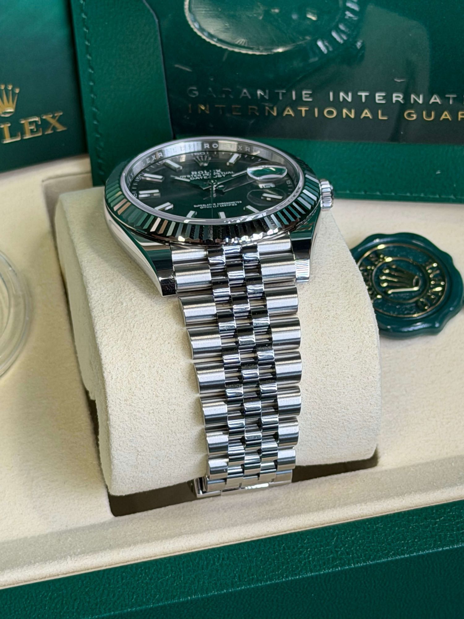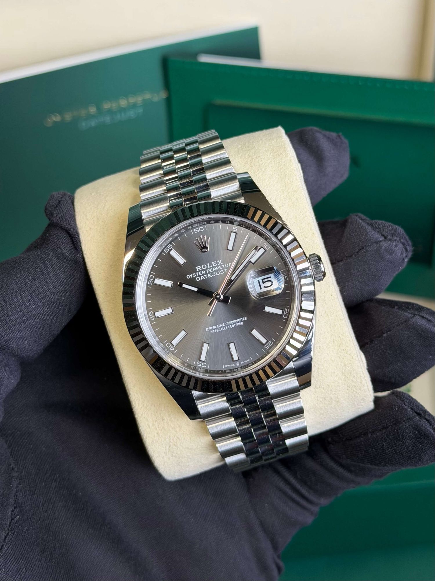 De Rolex Datejust 41 ref. 126334 met slate grijze wijzerplaat is een elegant en veelzijdig horloge dat klassieke Rolex-stijl combineert met een moderne, ingetogen uitstraling. Dit exemplaar is afkomstig uit 2026, verkeert in ongedragen staat en wordt aangeboden als full set .De 41 mm Oystersteel kast met fluted bezel van witgoud omlijst de verfijnde slate grijze wijzerplaat, die door zijn subtiele sunburst-afwerking schittering en diepte toont in diverse lichtomstandigheden. De combinatie van tijdloos design en moderne kleur maakt dit model zowel stijlvol als gemakkelijk te dragen bij elke gelegenheid.Aangedreven door het geavanceerde Rolex Calibre 3235 biedt dit horloge circa 70 uur gangreserve, een datumaanduiding met de kenmerkende Cyclops-lens en waterdichtheid tot 100 m. De Jubilee-bracelet voegt comfort en verfijning toe aan het geheel, wat deze een uitstekende keuze maakt voor wie een hedendaagse Datejust wil in onberispelijke, ongedragen conditie.Een schitterende uitvoering die luxe, techniek en tijdloze esthetiek naadloos verenigt.
