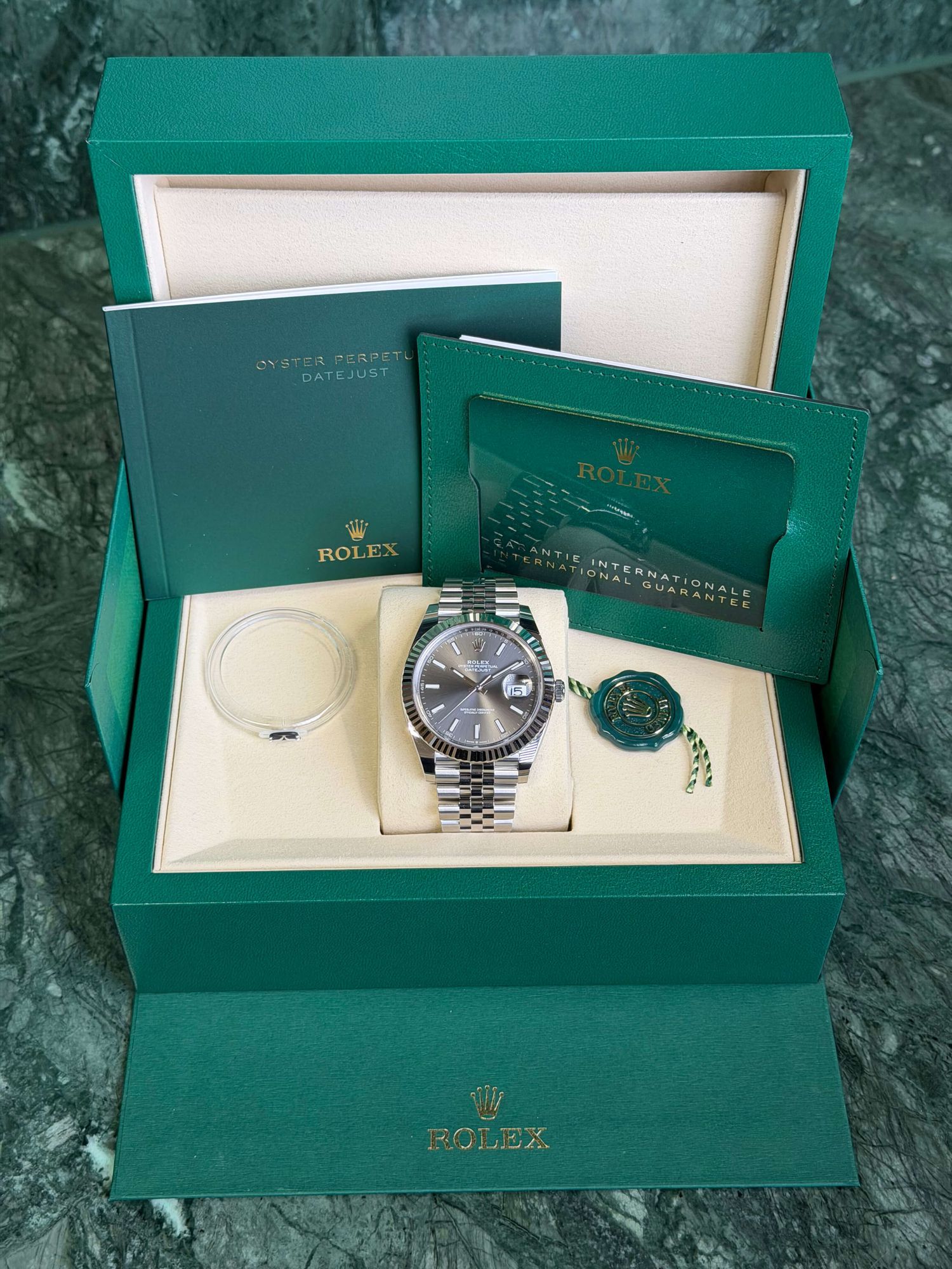Die Rolex Datejust 41 Ref. 126334 mit schiefergrauer Zifferblatt ist eine elegante und vielseitige Uhr, die klassischen Rolex-Stil mit einem modernen, zurückhaltenden Look kombiniert. Dieses Exemplar stammt aus 2026, ist ungetragen und wird als Full Set angeboten. Das 41 mm große Gehäuse aus Oystersteel mit der geriffelten Lünette aus Weißgold umrahmt das raffinierte schiefergraue Zifferblatt, das durch seine subtile Sunburst-Oberfläche in verschiedenen Lichtverhältnissen Glanz und Tiefe zeigt. Die Kombination aus zeitlosem Design und modernen Farben macht dieses Modell sowohl stilvoll als auch leicht tragbar für jede Gelegenheit. Angetrieben vom fortschrittlichen Rolex Kaliber 3235 bietet diese Uhr etwa 70 Stunden Gangreserve, eine Datumsanzeige mit der charakteristischen Cyclops-Linse und eine Wasserdichtigkeit von bis zu 100 m. Das Jubilee-Armband fügt dem Ganzen Komfort und Raffinesse hinzu, was sie zur ausgezeichneten Wahl für diejenigen macht, die eine zeitgemäße Datejust in einwandfreiem, ungetragenem Zustand suchen. Eine brillante Ausführung, die Luxus, Technik und zeitlose Ästhetik nahtlos vereint.