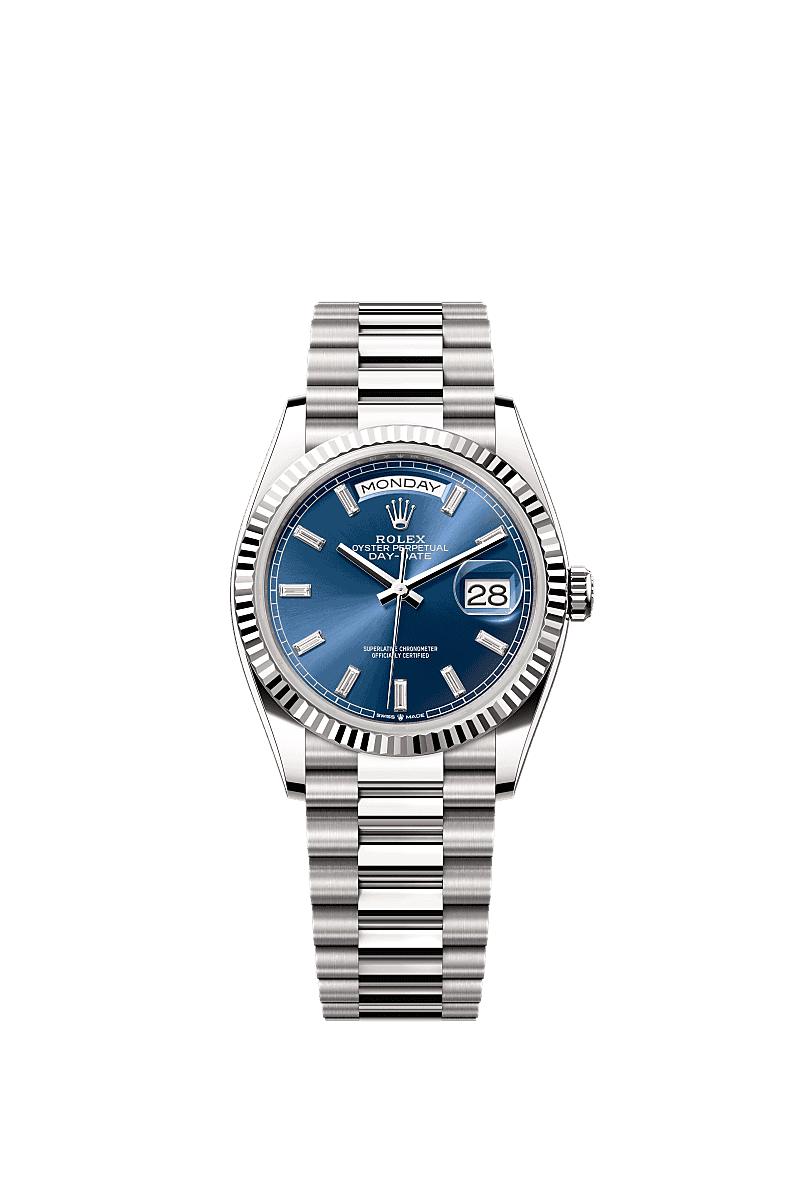 Rolex 128239-0069 - Day-Date 36 White Gold - Fluted / Bright Blue - Baguette / President