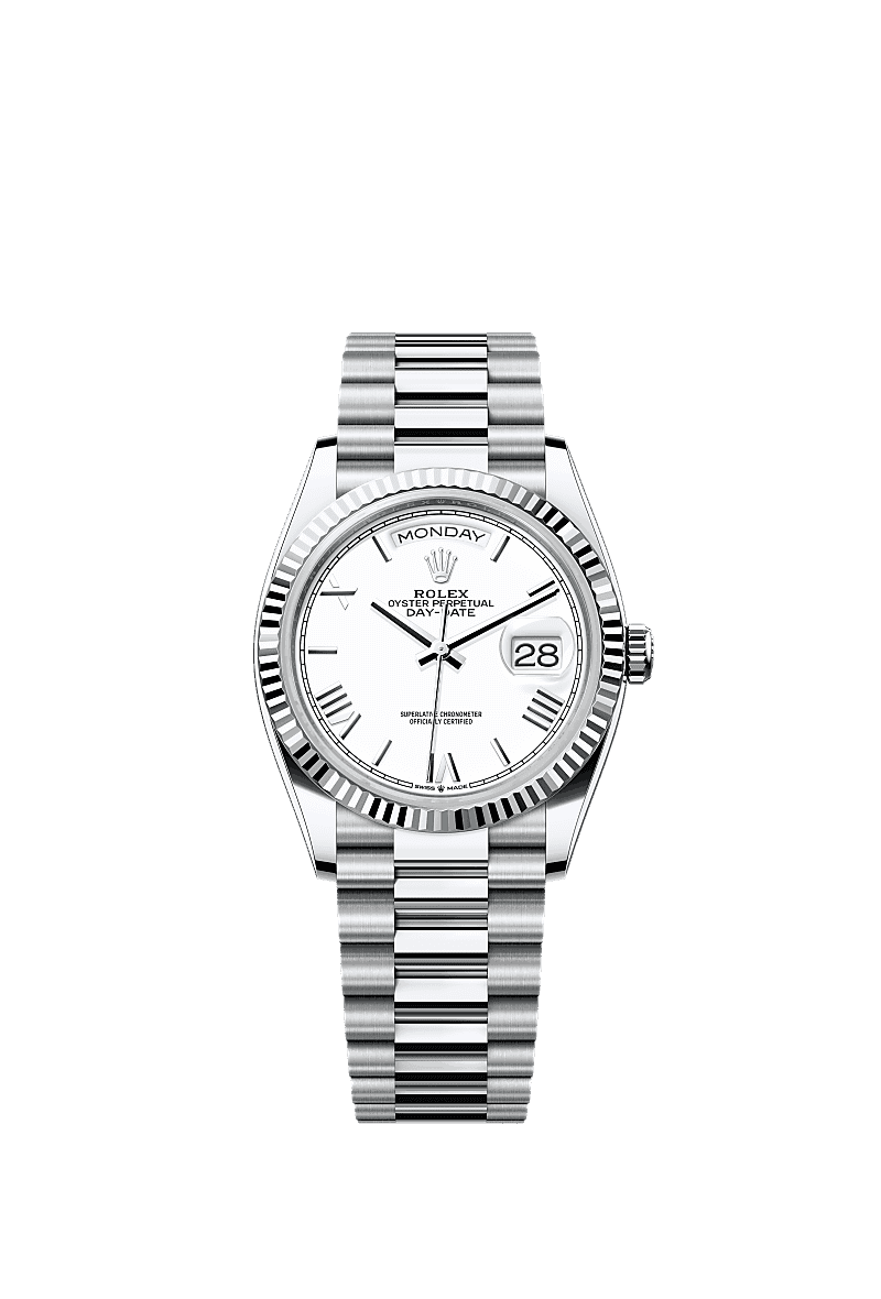 Rolex 128236-0017 - Day-Date 36 Platinum - Fluted / White - Roman / President