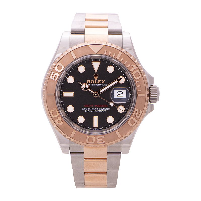Rolex Yacht-Master 40 in Everose Gold and steel with a black dial, reference 126621. Complete with Rolex warranty card, box and outer box, card holder, booklets, and the green Rolex tag. 5-year Rolex warranty.