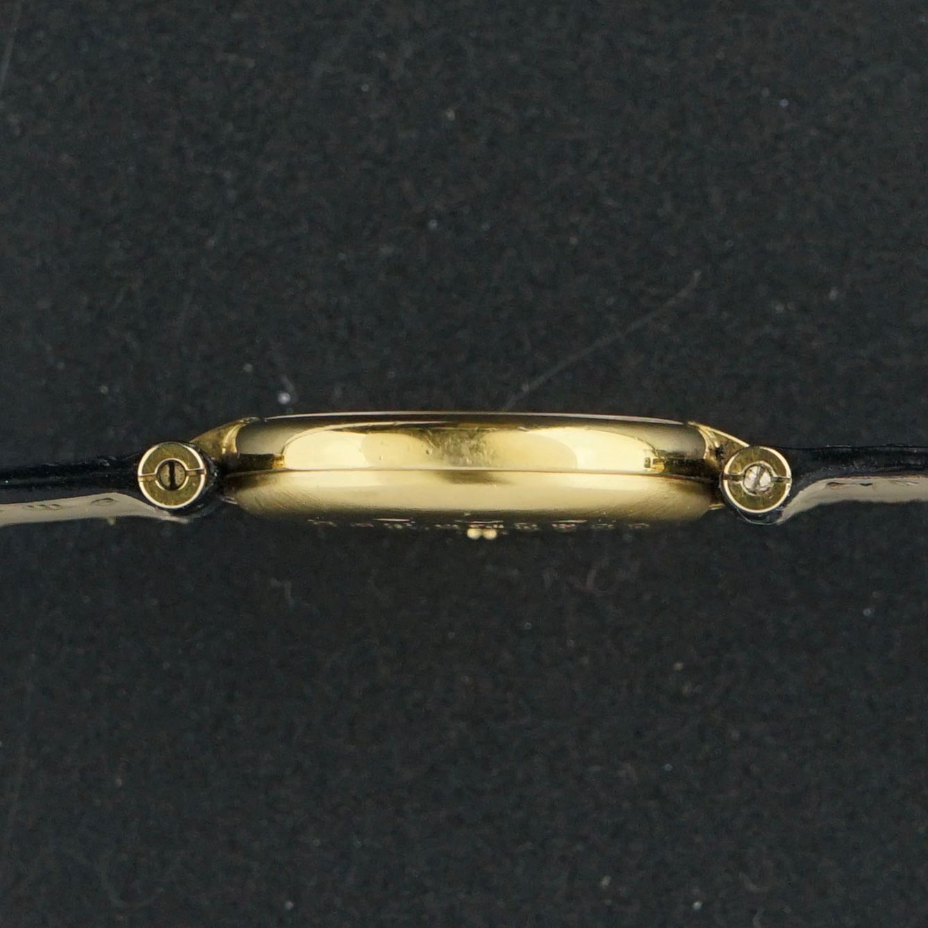 The watch comes with a brand-new original Cartier leather strap with crocodile motive and is fitted with its vintage original Cartier folding clasp. The clasp shows visible wear, especially on the underside, and could be replaced in the future if desired.