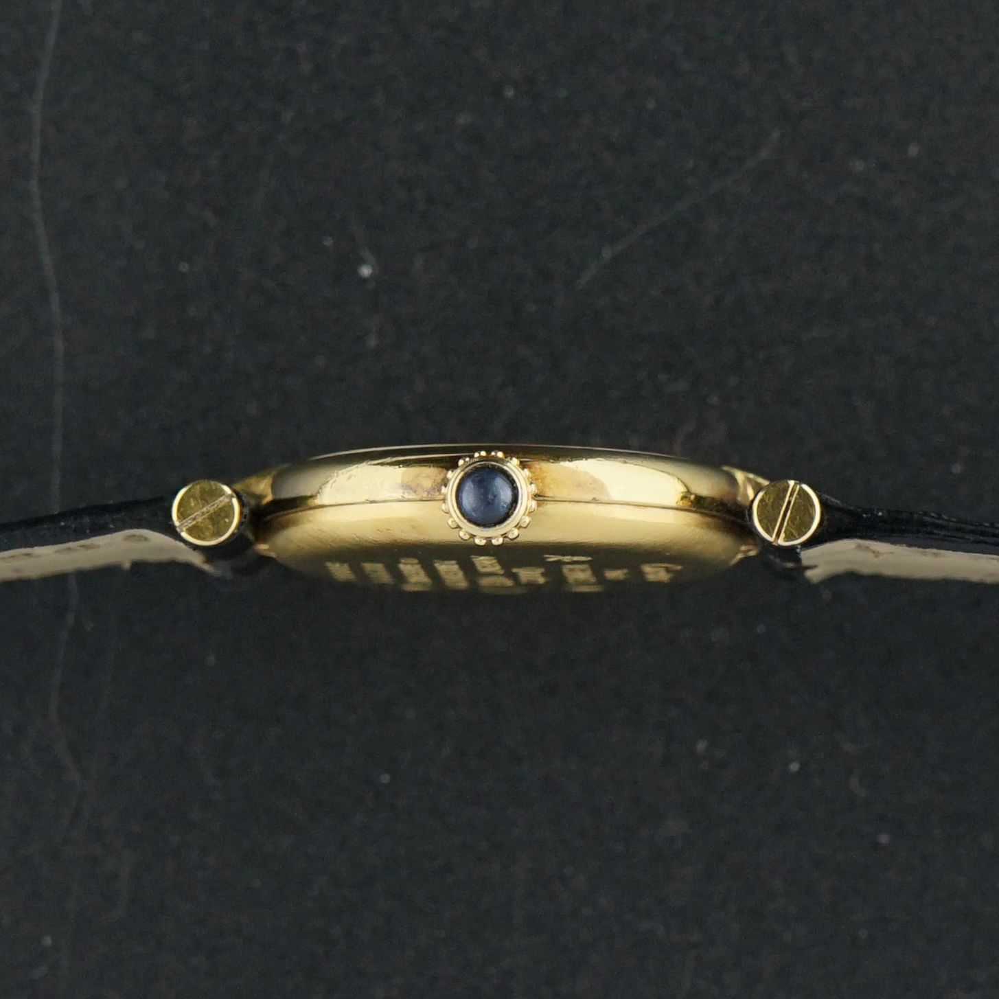 A Vintage Cartier Vendôme Vermeil produced in the 1990s. This classic Cartier features a silver case with gold plating, with some silver visibly showing through on certain parts of the front of the case, consistent with its age.The black dial is in beautiful shape and displays an attractive spider dial effect, visible only under specific light angles. It is fitted with the signature blue ruby cabochon crown. Inside runs a quartz movement, overhauled in February 2026, functioning properly.
