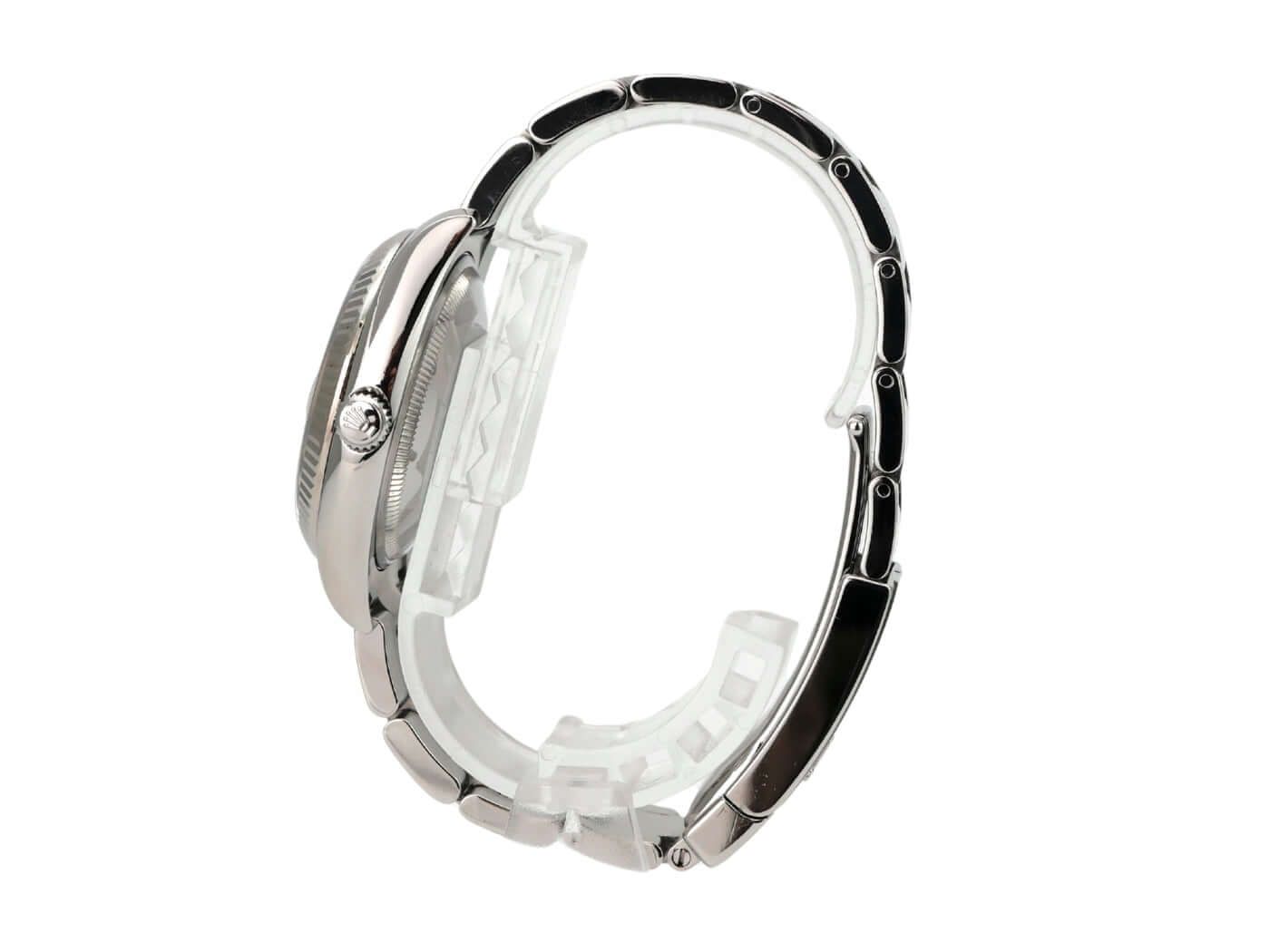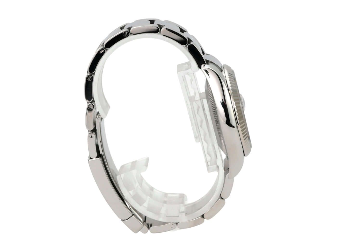Gehäuse aus poliertem und satiniertem Edelstahl, Gehäusedurchmesser 34 mm, Gehäusehöhe 11,8 mm, Lünette aus poliertem und geriffeltem Weißgold, Oyster Edelstahlarmband poliert und satiniert mit Faltschließe, silberne Zifferblatt mit 5 applizierten Diamanten und arabischen Ziffern, automatisches Uhrwerk, Rolex Manufakturkaliber 3135 mit 31 Steinen, 28.800 Schwingungen pro Stunde, Datumsanzeige mit Lupe, Chronometer, Saphirglas, verschraubte Krone, verschraubter Edelstahlboden, wasserdicht bis 10 bar.