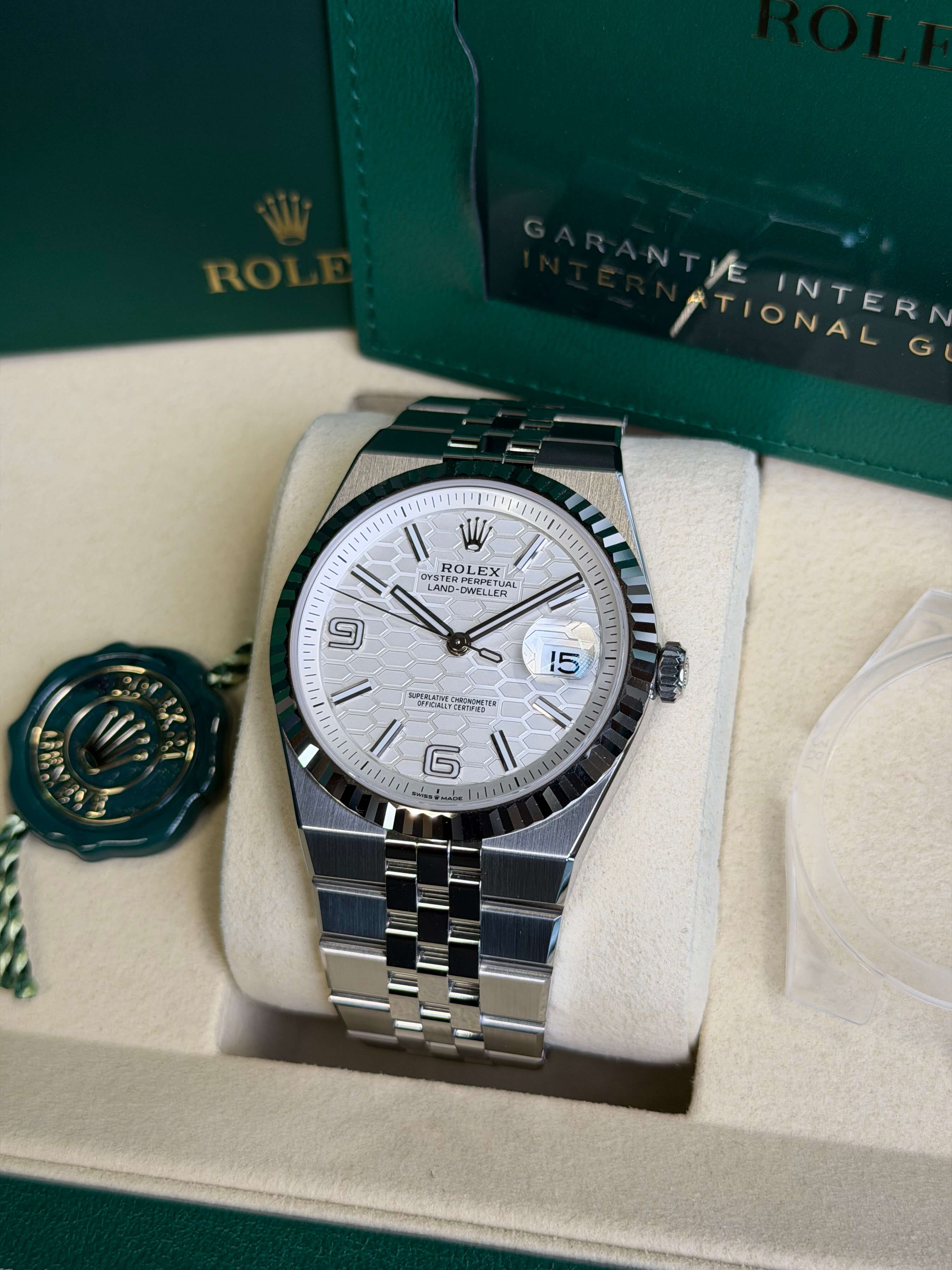 Met de nieuwe Flat Jubilee-armband en een intens witte wijzerplaat met honingraatmotief maakt de Rolex Land-Dweller ref. 127334 echt een modern stijlstatement. De 40 mm Oystersteel-kast is voorzien van een geribbelde lunette van 18 karaats witgoud. De wijzerplaat heeft een combinatie van lichtgevende open staafvormige uurmarkeringen en Arabische cijfers 6 en 9. Het horloge wordt aangedreven door kaliber 7135, het hoogfrequente uurwerk van Rolex dat op 5 Hz loopt, en is uitgerust met het Dynapulse-echappement. Het heeft een gangreserve van ongeveer 66 uur en is gecertificeerd als Superlative Chronometer. Een saffieren achterkant onthult de afwerking van het uurwerk.Dit ongedragen Rolex Land-Dweller 40 White Dial Flat Jubilee White Rolesor horloge 127334 wordt geleverd met papieren en de doos van de fabrikant.