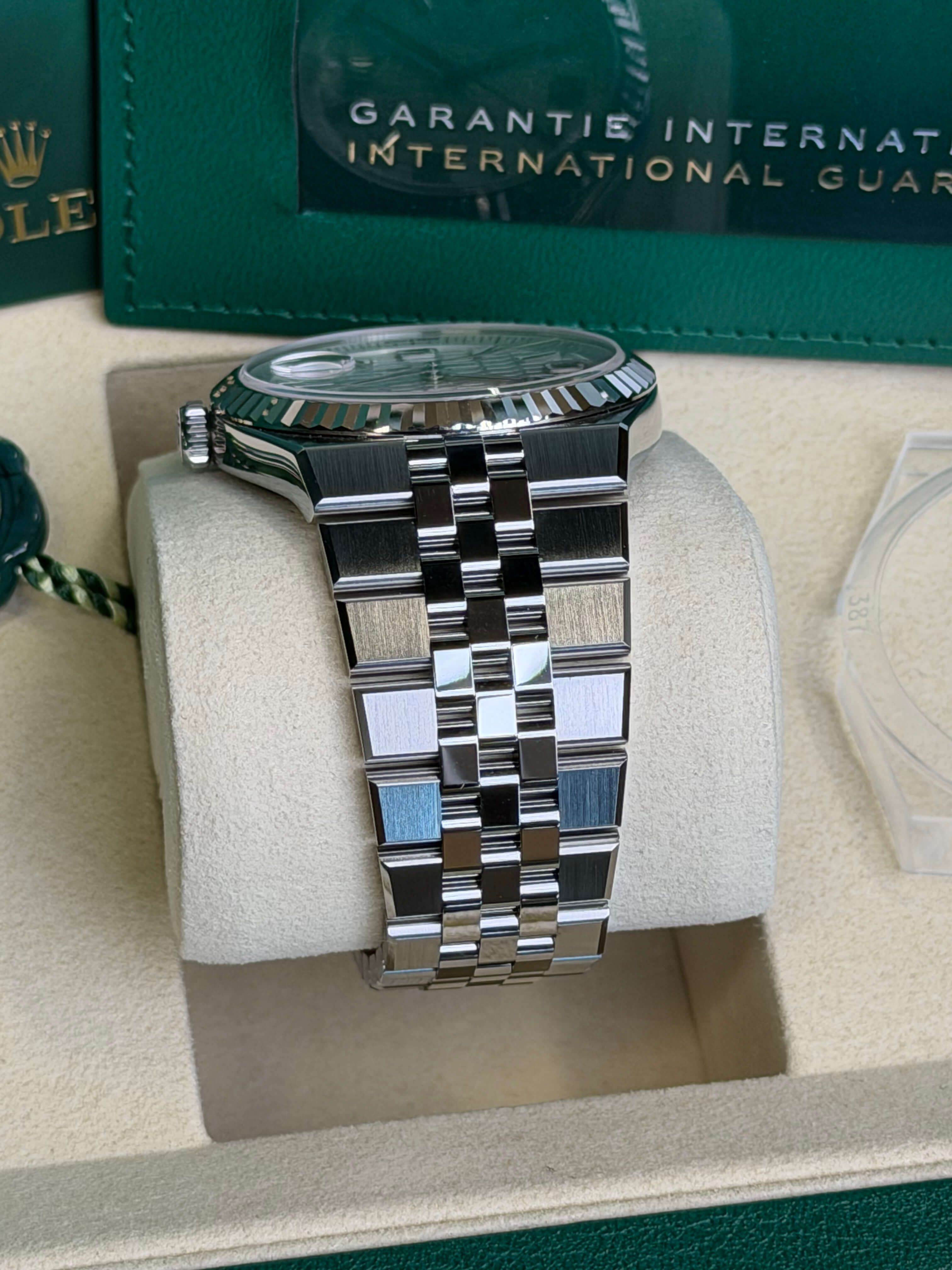 Mit dem neuen Flat Jubilee-Armband und einem intensiv weißen Zifferblatt mit Wabenmuster setzt die Rolex Land-Dweller Ref. 127334 wirklich ein modernes Stil-Statement. Das 40 mm Gehäuse aus Oystersteel ist mit einer geriffelten Lünette aus 18 Karat Weißgold ausgestattet. Das Zifferblatt verfügt über eine Kombination aus leuchtenden offenen Stab-Stundenmarkierungen und arabischen Ziffern 6 und 9. Die Uhr wird vom Kaliber 7135 angetrieben, dem hochfrequenten Uhrwerk von Rolex, das mit 5 Hz läuft, und ist mit dem Dynapulse-Hemmung ausgestattet. Sie hat eine Gangreserve von etwa 66 Stunden und ist als Superlative Chronometer zertifiziert. Ein Saphirboden gibt einen Blick auf die Verarbeitung des Uhrwerks frei. Diese ungetragene Rolex Land-Dweller 40 White Dial Flat Jubilee White Rolesor Uhr 127334 wird mit Papieren und der Originalverpackung geliefert.