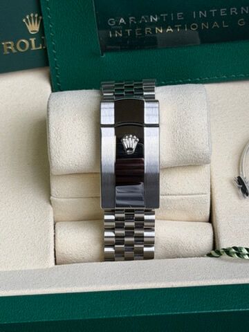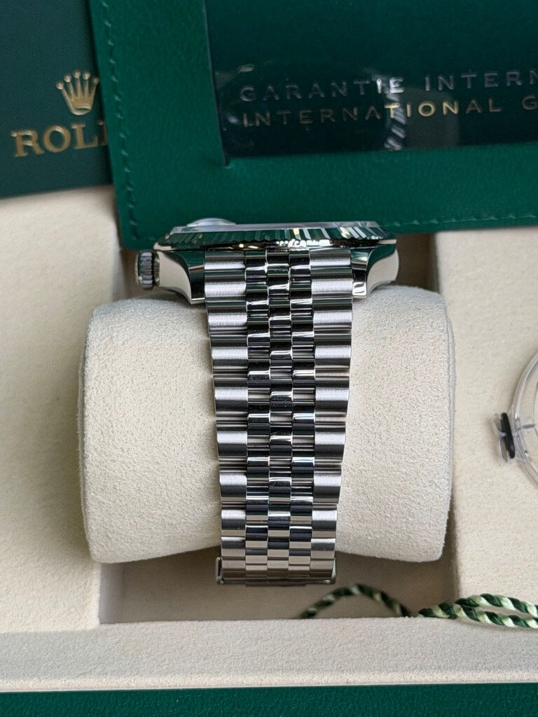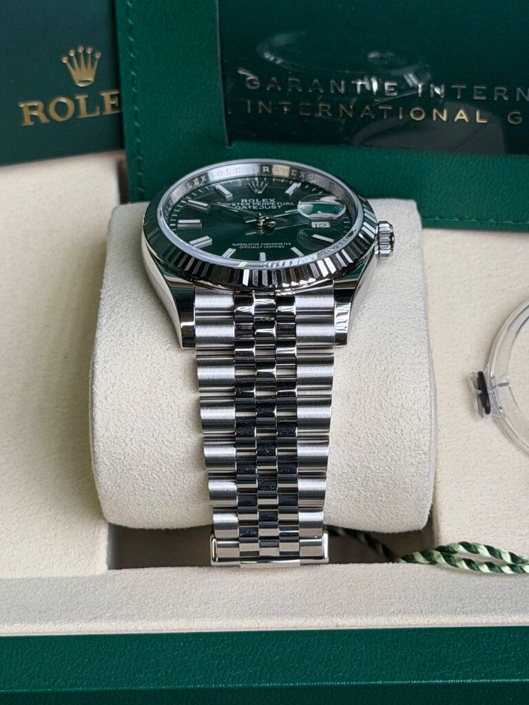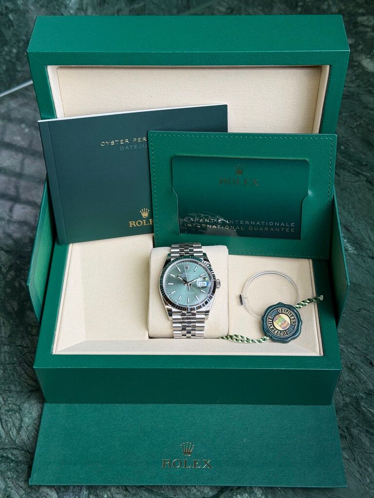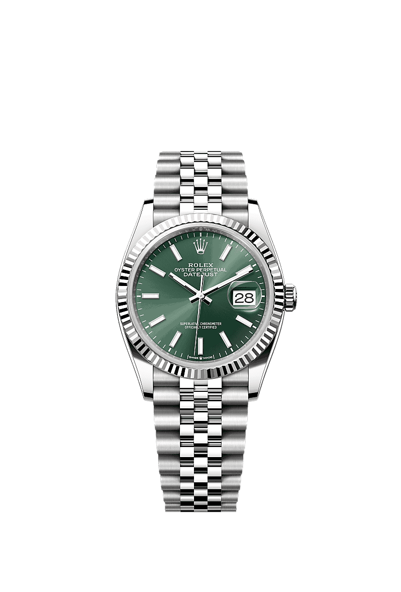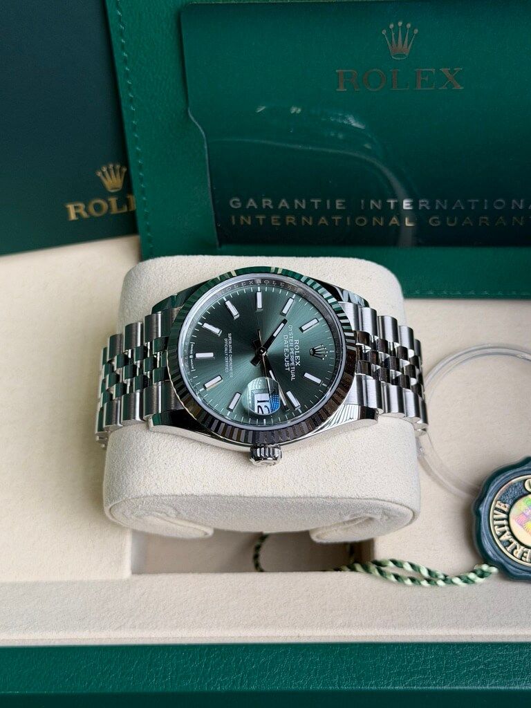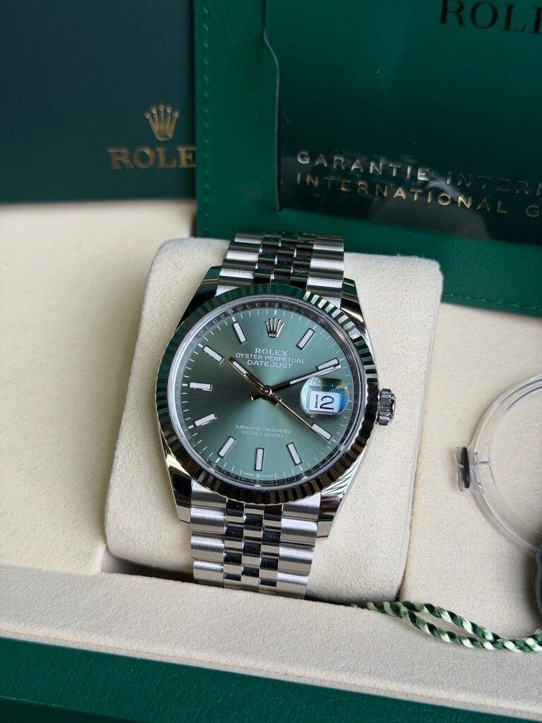 Die Rolex Datejust 36 Ref. 126234 mit grüner Zifferblatt ist ein moderner Klassiker, der Eleganz und frischen Stil in einem Uhr vereint. Dieses Modell verfügt über ein 36 mm Gehäuse aus Oystersteel mit einer geriffelten Lünette aus 18 kt Weißgold, was einen subtilen, aber luxuriösen Look verleiht und perfekt mit dem lebhaften mintgrünen Sunburst-Zifferblatt kontrastiert, das bei Licht von sanften Pastelltönen zu tieferem Grün wechselt, dank der feinen Verarbeitung. Angetrieben vom Rolex Kaliber 3235 Automatikwerk bietet diese Uhr etwa 70 Stunden Gangreserve, eine Datumsanzeige mit Lupe und eine robuste Wasserdichtigkeit bis 100 m, was die Datejust zu einem zuverlässigen täglichen Begleiter macht. Mit ihrem zeitlosen Design und der auffälligen Farbe ist die 126334 grün eine stilvolle Wahl für alle, die Klassik und Modernität in einer ikonischen Rolex-Uhr kombinieren möchten.