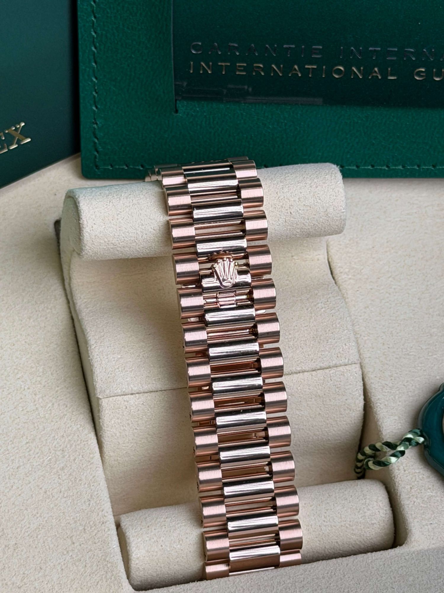 De Rolex Day-Date 40 ref. 228235 met prachtige ombre wijzerplaat is een meesterwerk van stijl en techniek. Uitgevoerd in warm 18 kt Everose goud en voorzien van de iconische fluted bezel combineert dit horloge klassieke Rolex elegantie met een moderne en verfijnde uitstraling. De unieke ombre dial met zijn subtiele kleurverloop geeft diepte en karakter en trekt de aandacht zonder opdringerig te zijn.Om de pols draagt de comfortabele President band bij aan het ultieme gevoel van prestige. Aangedreven door het geavanceerde Calibre 3255 biedt deze Day-Date uitzonderlijke precisie een gangreserve van circa 70 uur en ongeëvenaarde betrouwbaarheid. Een tijdloos statement voor de echte liefhebber van topklasse horlogerie.