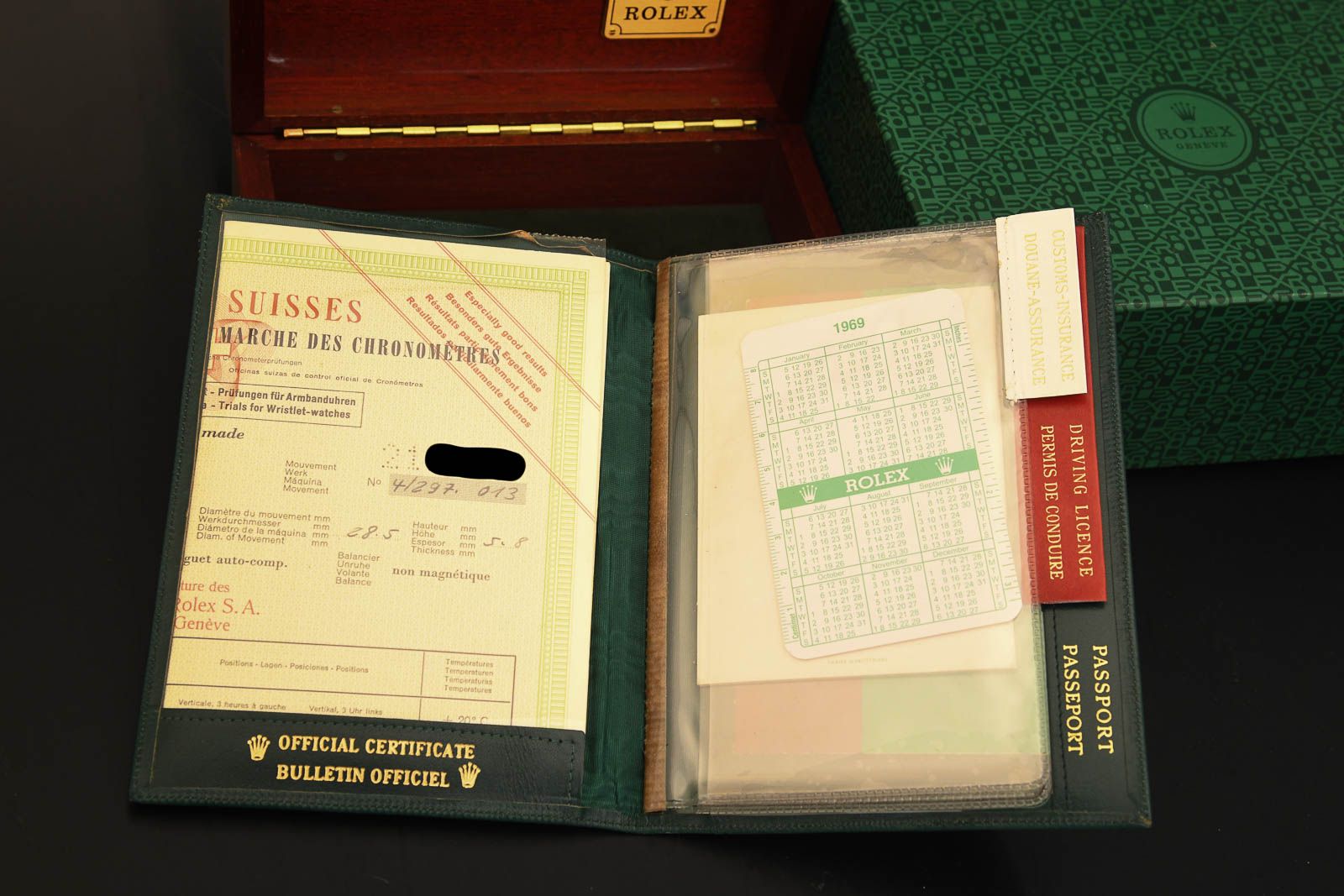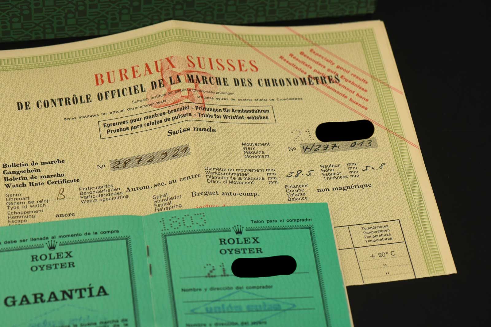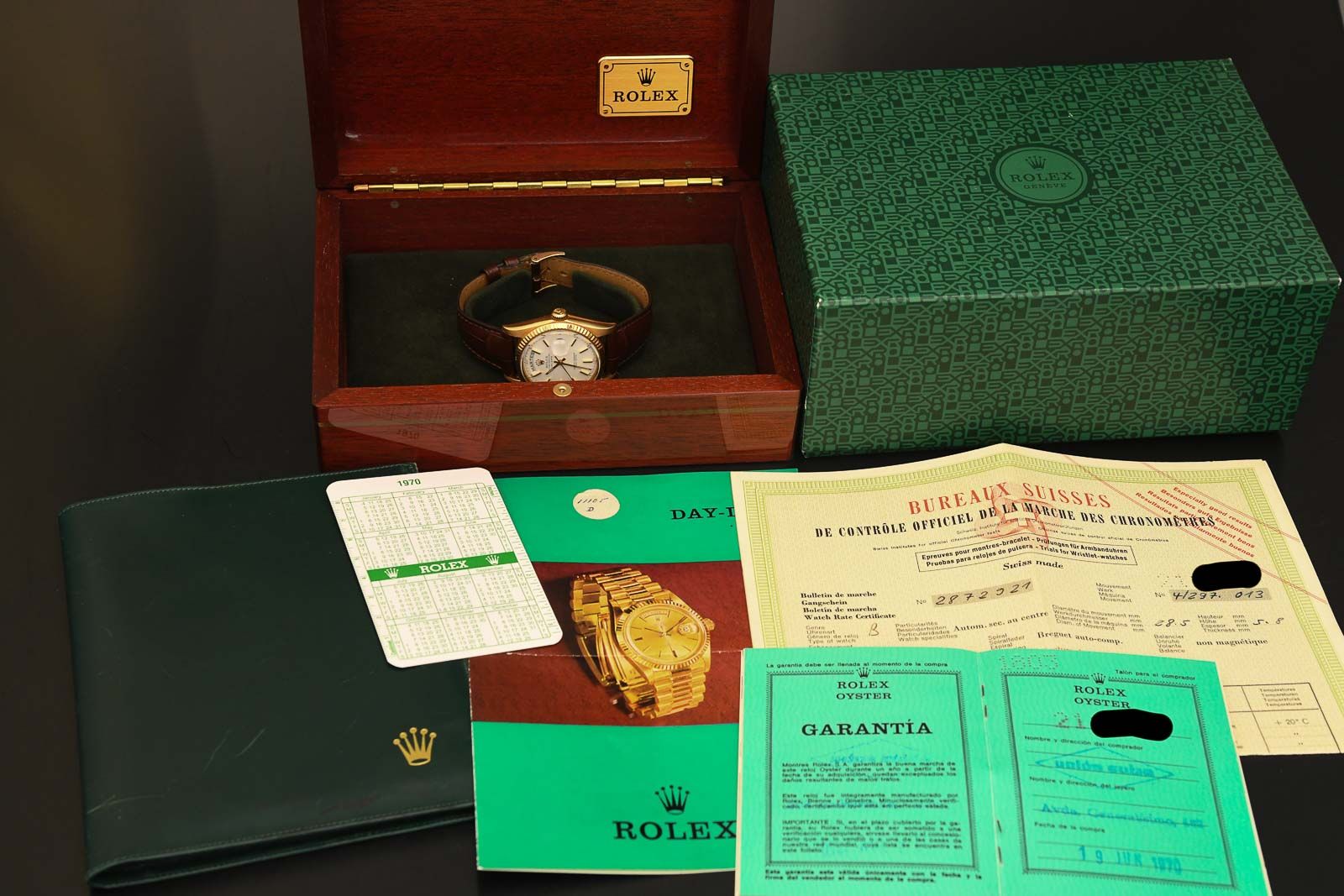 ROLEX 1803 Day Date 1969 Rare Red Quarter Dial as Full Set. Very beautiful Rolex 1803 with the sought-after RED QUARTER dial. This beautiful and rare variant was installed at the end of the 1960s, in 1968/69. As can be seen in the photos, the model presented here is in very good condition, with all luminous dots perfectly preserved. The highlight, apart from the dial, is the original papers, here in a double-punched version; the large certificate of accuracy alone is rare to find. The watch was purchased on 19 June 1970 from Union Suiza in Madrid. Also great is the passport holder for all documents, which I have only seen in this form once before.