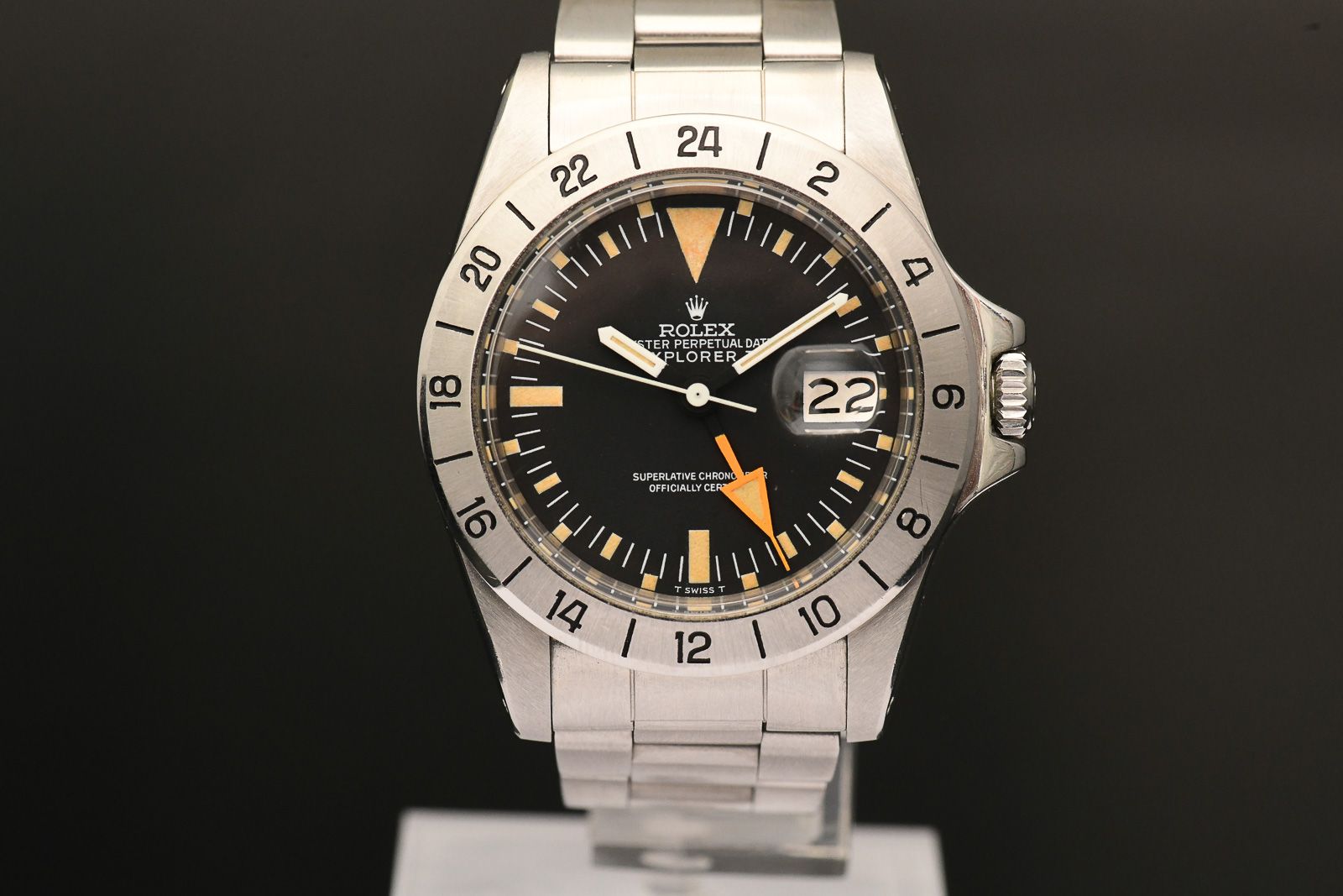 Rolex 1655 Freccione 1972 Orange Hand in TOP Condition. Very nice Rolex Explorer 2 straight hand from 1972 with Mk1 dial and Mk2 bezel. This combination was originally installed by Rolex. With this 1655 aka Freccione, everything just fits. This model has a super case with thick horns and a clean finish, just the way you like it. The dial and the hands have a so-called Pumkin patina that is sought after and appreciated by enthusiasts worldwide. The original tritium luminous material is very clean and evenly aged. The 78360 bracelet with 580 end pieces is from the early 1980s and wears excellently. Watches in this condition are getting harder and harder to find, so please don’t hesitate and no trade offers please.