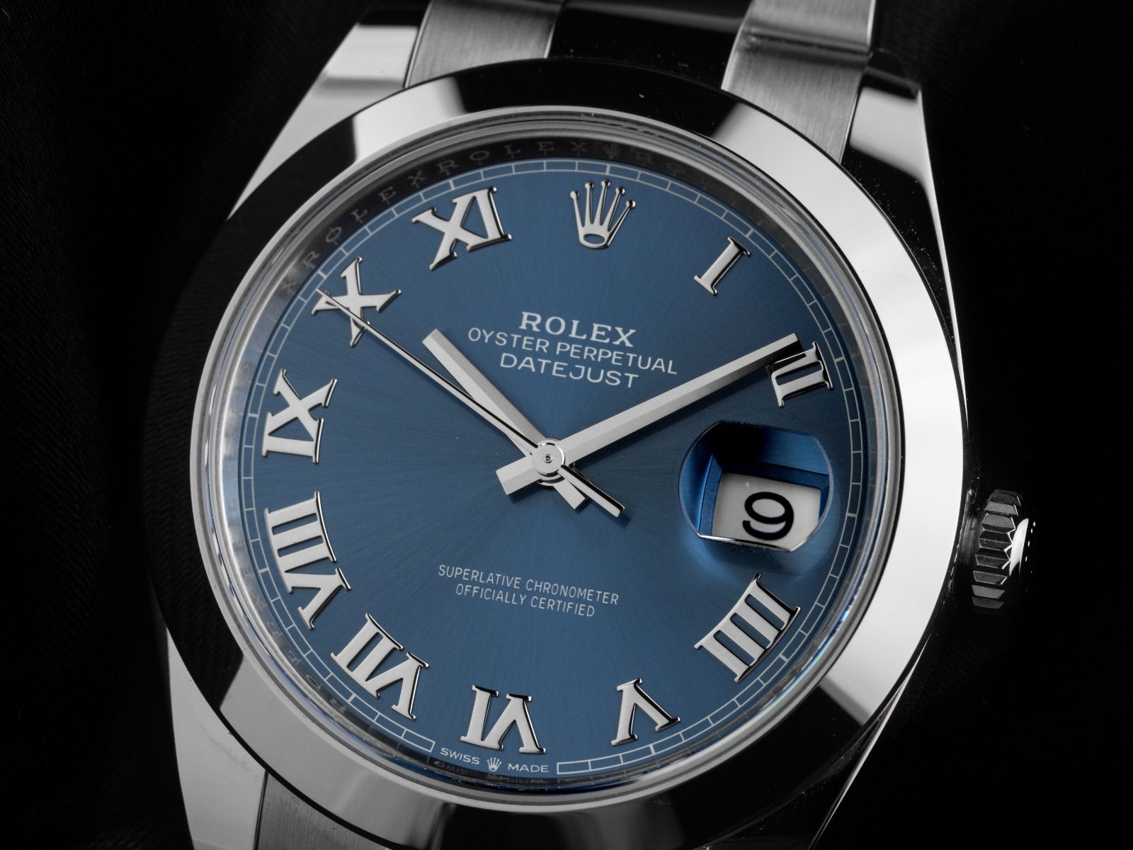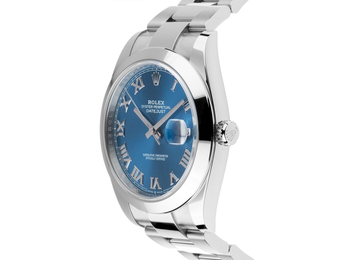 Gehäuse aus poliertem und satiniertem Edelstahl, Gehäusedurchmesser ohne Krone 41mm, Gehäusehöhe 11,5mm. Lünette aus glattem und poliertem Edelstahl. Armband Oyster aus poliertem und satiniertem Edelstahl, Rolex Faltschließe aus Edelstahl mit Hersteller-Logo. Zifferblatt blau mit aufgesetzten weißgoldenen römischen Ziffern und weißgoldenen Zeigern. Uhrwerk Automatik, Chronometer mit Zeugnis, Rolex Manufakturkaliber 3235 mit 31 Edelsteinen. Anzeige von Stunde, Minute und Sekunde über Zeiger aus der Mitte mit Sekundenstopp zur sekundengenauen Einstellung der Uhrzeit, Datumsanzeige mit Schnellverstellung unter Glaslupe bei 3 Uhr. Saphirglas kratzfest. Krone verschraubbar mit Hersteller-Logo. Boden aus Edelstahl verschraubt. Gewicht der Uhr inklusive Armband 137g, Länge des Armbandes inklusive Gehäuse 170mm. Referenznummer: 126300, Gehäusenummer: 1454NXXX, ID: P2530154000226H-11900/8600, Artikelnummer: 10000084843. Original Rolex Box mit Umkarton und Garantie-Papieren von August 2025, neue Rolex Garantiekarte ohne Ländercode sowie Beschreibung, Ledermäppchen, Rolex Chronometer-Siegel, Erstkaufrechnung und Watchregister-Auszug von Februar 2026, The Watch Register Zertifikat / ohne Eintrag (Internationale Datenbank für verlorene oder gestohlene Uhren), Full Set. Superschnäppchen, Kapitalanlage mit Wertsteigerungspotential, aus erster Hand, fast nicht getragen. Wie Neu. Lieferzeit sofort.