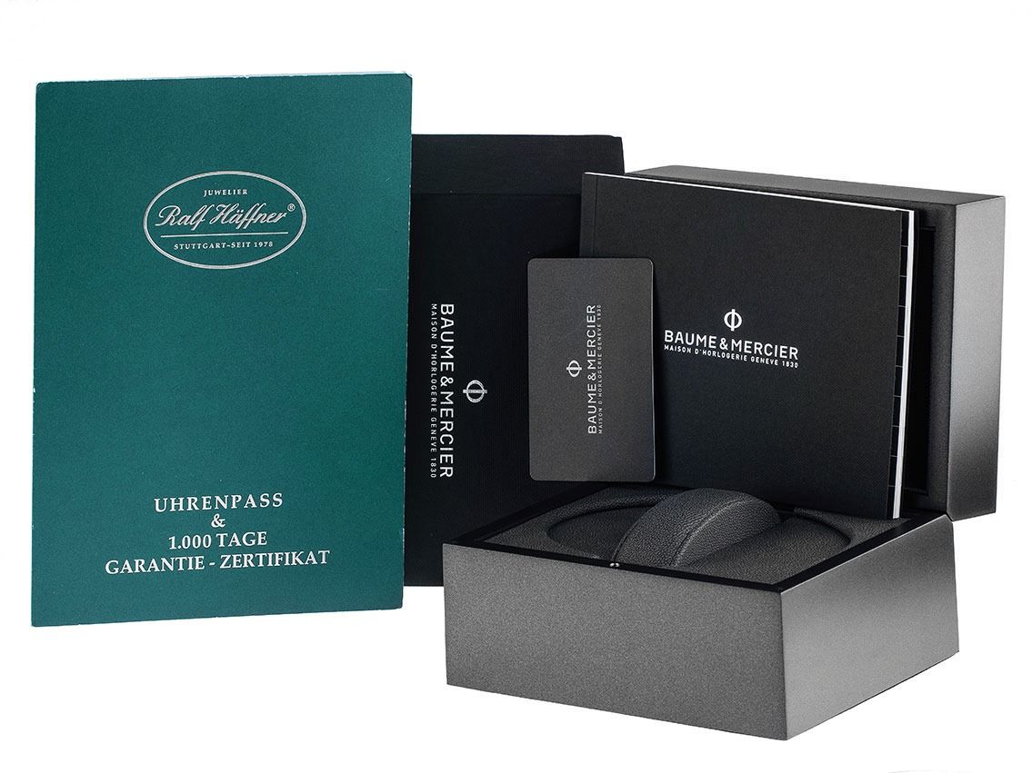Gehäuse aus poliertem und satiniertem Edelstahl, Gehäusedurchmesser ohne Krone 42mm, Gehäusehöhe 13,2mm. Lünette aus glattem und poliertem Edelstahl. Armband aus schwarzem Leder mit Ziernaht, Anstoßbreite 22mm, Doppelsicherheitsfaltschließe aus Edelstahl mit Hersteller-Logo. Zifferblatt in blau verlaufend mit aufgesetzten Edelstahl-Indizes und polierten Zeigern. Uhrwerk Automatik, Manufakturkaliber Baume & Mercier BM14 mit 21 Edelsteinen, Gangreserve ca. 5 Tage. Anzeige von Stunde, Minute und Sekunde über Zeiger aus der Mitte mit Sekundenstopp zur sekundengenauen Einstellung der Uhrzeit, Datumsanzeige mit Schnellverstellung über Zeiger bei 6 Uhr, Wochentaganzeige über Zeiger in Englisch bei 12 Uhr einstellbar über Drücker bei 2 Uhr, Mondphasenanzeige bei 6 Uhr einstellbar über Drücker bei 8 Uhr. Saphirglas kratzfest und gewölbt. Krone mit Hersteller-Logo. Boden aus Edelstahl 4-fach verschraubt und graviert mit Saphirglas-Sichtfenster. Gewicht der Uhr inklusive Armband 91g. Wasserdicht bis 5 ATM. Referenznummer: M0A10593, ID: ST559268120825H-5300, Artikelnummer: 10000081996. Original Baume & Mercier Box mit Umkarton und Garantie-Papieren von 2025, Full Set. Ungetragen. Lieferzeit sofort.