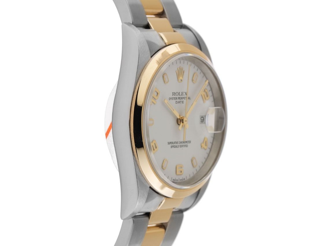 Rolex Oyster Perpetual Date Stahl 18kt Gelbgold Automatik Armband OysterGehäuse Edelstahl poliert und satiniert, Gehäusedurchmesser ohne Krone 34mm, Gehäusehöhe 11,8mm. Lünette 18kt Gelbgold poliert. Armband Oyster Edelstahl / 18kt Gelbgold poliert und satiniert, Faltschließe Edelstahl mit Hersteller-Logo. Zifferblatt weiß mit aufgesetzten gelbgoldenen Indexen und arabischen Ziffern sowie gelbgoldenen Zeigern. Uhrwerk Automatik, Chronometer mit Zeugnis, Rolex Manufakturkaliber 3135 mit 31 Edelsteinen. Anzeige von Stunde, Minute und Sekunde über Zeiger aus der Mitte mit Sekundenstopp zur sekundengenauen Einstellung der Uhrzeit, Datumsanzeige mit Schnellverstellung unter Glaslupe bei 3 Uhr. Saphirglas kratzfest. Krone verschraubbar mit Hersteller-Logo. Boden Edelstahl verschraubt. Gewicht der Uhr inklusive Armband 101g, Länge des Armbandes inklusive Gehäuse 180mm. Referenznummer: 15203, Gehäusenummer: P654XXX, Baujahr: 2000, ID P1861101121125H-9500, Artikelnummer: 10000083068. Mit Gangkontrolle und kompletter äußerlicher Aufarbeitung von November 2025. Original Rolex Box mit Umkarton und Garantie Papiere von September 2001, LC 100 / Germany EU sowie Beschreibung, Übersetzungsheft, Ledermäppchen und Rolex Chronometer-Siegel sowie Watchregister Auszug von November 2025, The Watch Register Zertifikat / ohne Eintrag (Internationale Datenbank für verlorene oder gestohlene Uhren), Full Set. Superschnäppchen, sehr seltenes Sammlerstück. Sehr guter Zustand. Lieferzeit sofort.