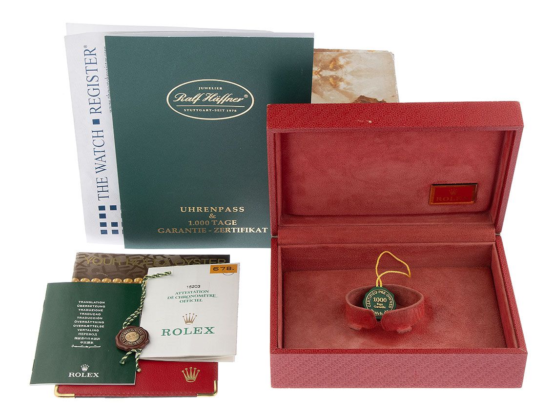 Inklusive certified pre owned Siegel / Uhrenpass mit einem Farbbild, der genauen Beschreibung sowie dem Wiederbeschaffungswert der Uhr über 9500,-€ und 1000 Tage Garantie ab Kaufdatum.